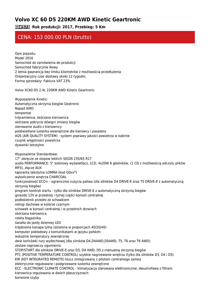 Volvo XC 60 D5 220KM AWD Kinetic Geartronic ID#573 Rok produkcji: 2017, Przebieg: 5 Km CENA: 153 000.00 PLN (brutto) Opis pojazdu: Model 2016 Samochód do zamówienia do produkcji Samochód fabrycznie Nowy 2 letnia gwarancja bez limitu kilometrów z możliwością przedłużenia Orejentacyjny czas dostawy około 12 tygodni. Forma sprzedaży: Faktura VAT 23% Volvo XC60 D5 2.4L 220KM AWD Kinetic Geartronic Wyposażenie Kinetic: Automatyczna skrzynia biegów Geatronic Napęd AWD tempomat trójramienna, skórzana kierownica skórzane pokrycie dźwigni zmiany biegów sterowanie audio z kierownicy podświetlane lusterka wewnętrzne dla kierowcy i pasażera AQS (AIR QUALITY SYSTEM) - system poprawy jakości powietrza w kabinie czujnik wilgotności powietrza dywaniki tekstylne Wyposażenie Standardowe: 17” obręcze ze stopow lekkich SEGIN 235/65 R17 audio PERFORMANCE: 5" kolorowy wyświetlacz, LCD, 4x20W 6 głośników, (1 CD z możliwością odczytu plików MP3), złącze AUX tapicerka tekstylna LOMMA (kod G0xx*) wykończenie wnętrza CHARCOAL funkcjonalność ECO+ - ogranicznie zużycia paliwa (dla silników D4 DRIVE-E oraz T5 DRIVE-E z automatyczną skrzynią biegów) program kontroli startu - tylko dla silników DRIVE-E z automatyczną skrzynią biegów gniazdo 12V w przedniej i tylnej części konsoli centralnej podłokietnik przedni ze schowkiem relingi dachowe w kolorze czarnym schowek w konsoli centralnej i w przednich drzwiach skórzana kierownica roleta bagażnika światła do jazdy dziennej LED trójdzielna kanapa tylna (dzielona w proporcjach 40/20/40) komputer pokładowy z komunikatami w języku polskim wskaźnik temperatury zewnętrznej dwie końcówki rury wydechowej (dla silników D4,D4AWD,D5AWD, T5, T6 oraz T6 AWD) zestaw naprawczy ogumienia STOP/START dla silników DRIVE-E oraz D3, D4 AWD, D5 z manualną skrzynią biegów PTC (POSITIVE TEMPERATURE CONTROL) szybkie nagrzewanie wnętrza (tylko dla silników D3, D4 i D5) KIR (KEY INTEGRATED REMOTE) klucz zintegrowany z pilotem centralnego zamka elektrycznie regulowane i podgrzewane lusterka zewnętrzne ECC - ELECTRONIC CLIMATE CONTROL - klimatyzacja sterowana elektronicznie, dwustrefowa z filtrem kierownica regulowana w dwóch płaszczyznach barwione szyby elektrycznie sterowane szyby boczne z przodu i z tyłu z funkcją opuszczania i domykania CITY SAFETY - laserowy czujnik ograniczający ryzyko kolizji (działa do 50 km/h) 6 poduszek powietrznych: dla kierowcy i pasażera, dwie poduszki boczne (dwukomorowe), kurtyny powietrzne (IC) DSTC – DYNAMIC STABILITY AND TRACTION CONTROL układ dynamicznej kontroli stabilności i trakcji SIPS (Side Impact Protection System) system zabezpieczeń przed skutkami uderzeń bocznych WHIPS (Whiplash Protection Seating System) system zabezpieczeń przed urazami kręgosłupa szyjnego ABS (ANTI-LOCK BRAKE SYSTEM) z elektronicznym układem rozdziału sił hamowania (EBD – Electronic Brake Distribution) CTC (CORNER TRACKING CONTROL) - kontrola trakcji w zakręcie autoalarm Volvo Guard z czujnikiem przechyłu oraz masowym czujnikiem ruchu immobilizer ze zmiennym kodem oświetlenie asekuracyjne Home Safe sygnalizacja niezapiętych pasów bezpieczeństwa dla wszystkich miejsc EBA (EMERGENCY BRAKE ASSISTANCE) układ wspomagania nagłego hamowania system mocowania fotelika ISOFIX dla zewnętrznych miejsc tylnej kanapy EBL (Emergency Brake Lights) - ostrzeganie innych użytkowników drogi o gwałtownym hamowaniu IDIS (INTELLIGENT DRIVER INFORMATION SYSTEM) system inteligentnego informowania kierowcy elektronicznie sterowany napęd na obie osie AWD (ALL WHEEL DRIVE) z układem Instant Traction (dla D4 AWD, D5 AWD oraz T6 AWD) RSC (ROLL STABILITY CONTROL)- układ stabilizacji przechyłu elektrycznie sterowany hamulec postojowy boczne światła obrysowe schowek pod podłogą bagażnika układ kontroli zjazdu ze wzniesienia (HDC - Hill Descent Control) dla silników z napędem na cztery koła Niniejsze ogłoszenie jest wyłącznie informacją handlową i nie stanowi oferty w myśl art. 66, § 1. Kodeksu Cywilnego.Sprzedający nie odpowiada za ewentualne błędy lub nieaktualność ogłoszenia. Informacje umieszczone w ogłoszeniu, służą jedynie celom informacyjnym. GRUPA PRO-CAR Sp. z o.o. Niezależny Dealer Audi i Volvo 03-128 Warszawa, ul. Świderska 109F lok. 7 NIP: 524-26-19-332, REGON: 1410664403, KRS: 0000286534 Sąd Rejonowy dla M. St. Warszawy w Warszawie, XIII Wydział Gospodarczy KRS Salon: 05-090 Warszawa - Janki, ul. Sezamkowa 2, tel. (22) 711 64 64