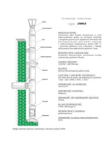 Przewody kominowe typu DWWż PRZEZNACZENIE: stosowany jako komin zewnętrzny w celu odprowadzenie spalin na zewnątrz budynku z urządzeń grzewczych opalanych drewnem lub ekologicznymi paliwami stałymi o maksymalnej temperaturze spalin 600 oC - przewód spalinowy jest wykonany z blachy zaliczanej do żaroodpornych o grubości 1 mm BUDOWA RUR I KSZTAŁTEK: el e m ent y dwu śc i enne i zo l owan e w eł ną ceramiczną o grubości 50 mm, ZAKRES ŚREDNIC: 130/200 ÷ 400/500 mm PALIWO: drewno lub ekologiczne paliwa stałe GATUNEK I GRUBOŚĆ MATERIAŁU: stal zaliczana do grupy żaroodpornych o grubości 1 mm – stal 1.4404, 1.4301, 1.4521 ODPORNOŚĆ NA KOROZJĘ: Vm/V2/V3 ODPORNOŚĆ OGNIOWA: Odporny ODLEGŁOŚĆ OD MATERIAŁÓW PALNYCH: 50 mm KLASA TEMPERATURY: T 600 - 600 stopni oC SPOSÓB PRACY KOMINA: podciśnieniowy ODPORNOŚĆ NA DZIAŁANIE KONDENSATU: W/D