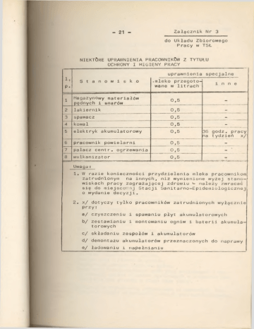 Załęcznik Nr 3 - 21 - do Układu Zbiorowego Pracy w TSŁ NIEKTÓRE UPRAWNIENIA PRACOWNIKÓW Z TYTUŁU OCHRONY I HIGIENY PRACY uprawnienia specjalne 1• S t a n o w i s k o p. •mleko przegoto-i wane w litrach i n n e 1 Magazynowy materiałów pędnych i smarów 0,5 2 lakiernik 0,5 - 3 spawacz 0,5 - 4 kowal 0,5 - 5 elektryk akumulatorowy 0,5 6 pracownik powielarni 0,5 - 7 palacz centr. ogrzewania 0,5 - 8 wulkanizator 0,5 - 36 godz. pracy na tydzień x/ Uwaga r 1. W razie konieczności przydzielenia mleka pracownikom zatrudnionym na innych, niż wymienione wyżej stano-* wiskach pracy zagrażajęcej zdrowiu należy zwracać się do miejsco’ 'łj Stacji Sanitarno-Epidemiologicznej o wydanie decyzji. 2. x/ dotyczy tylko pracowników zatrudnionych wyłęcznie pr z y : a/ czyszczeniu i spawaniu płyt akumulatorowych b/ zestawianiu i montowaniu ogniw i baterii akumula torowych c/ składaniu zespołów i akumulatorów d/ demontażu akumulatorów przeznaczonych do naprawy e/ ładowaniu i napełnianiu Załącznik Nr 4 do Układu Zbiorowego Pracy w TSŁ WYKAZ PRAC WYKONYWIfrYCH W WAftTJITKACH SZKODLIWYCH DLA ZDROWIA I UCIĄŻLIWYCH ORAZ STAWKI DODATKU ZA PRACE W TYCH WARUNKACH Grupa I - Dodatek w wysokości 0.50 zł za godzinę przysługuje przy wykonywaniu następujących prac: 1. Mycie detali w benzynie, olejach gazowych, nafcie, acetonie, spirytusie - przy zatrudnieniu hez przerwy w ciągu dnia pracy. 2. Czyszczenie ręczne /płukanie/ zbiorników paliwa. 3. Obsługa automatów chłodzonych olejami lub^emulsją przy szczególnie drażniących chłodziwach. 4. Prace monterskie przy naprawach i przeglądach Instala cji doprowadzających gaz w samochodach zgazyfikowanych. 5. Ładowanie akumulatorów. 6. Destylowanie elektrolitów. 7. Przygotowanie, nalewanie i nasycanie elektrolitem /elektrolizor/ przy produkcji ogniw i baterii. 8. Prace przy sortowaniu ręcznym i przebieraniu ołowiu. 9. Usuwanie lakieru z karoserii środkami chemicznymi. Grupa II - Dodatek w wysokości 0.75 zł aa godzinę przysługuje przy wykonywaniu następujących prac: 1. 2. 3. 4. ■5. 6. 7. 8. 9. 10. 11. 12. 13. 14. 15. Obsługa pieców hartowniczych i kuziennych., Cynowanie i cynkowanie. Spawanie gazowe i elektryczne /łukowe/ Malowanie i lakierowanie ręczne farbami nitro i bitu micznymi. Obsługa kotłowni i palacze przy ręcznym zasypywaniu palenisk i oczyszczaniu popielników /rusztów/ przy za trudnianiu bez przerwy w ciągu dnia pracy. Odtłuszczanie w ługu. Natryskiwanie podwozi olejami gazowymi. Szlifowanie i polerowanie metali na sucho. Rozcieńcaanie farb i lakierów. Hartowanie stali. Naprawa akumulatorów. Zalewanie akumulatorów pakiem. Obsługa pras i młotów na gorąco. Impregnacja uzwojeń lakierem nitro. Prace przy przeprowadzaniu prób pomp wtryskowych i wytryskiwaczy paliwa silników spalinowych w. przypadku za trudnienia bez przerwy w ciągu dnia pracy. 1/ dodatek przysługuje w wyjątkowych przypadkach po uprzednim, każ! dorazowym uzyskaniu opinii wojewódzkiej stacji sanitarno-epidemio logicznej Załącznik Nr 4. - 23 do ÜZP w TSŁ - 16. Obsługa stacji wytwornic acetylenowych i napraw wytwornic. 17. Wulkanizacja gumy. 18. Lutowanie przy produkcji masowej. 19* Naprawa silników spalinowych pracujących na benzynie etylizowanej. Grupa III 1. 2. 3« b. 5. Grupa IV 1. 2. 3* 4. 5. 6. 7. 8. 9. 10. 11. UWAGA: Dodatek w wysokości 1.00 zł za godzinę przysługuje przy wykonywaniu następujących prac: Obróbka mechaniczna i ręczna ołowiu. Lakierowanie natryskowe. Izolowanie watą szklany. Obsługa hamowni silników. Obsługa dystrybutorów benzyny etylizowanej. Dodatek w wysokości 1.50 zł za godzinę przysługuje przy wykonywaniu następujących prac: Obtaczanie tarcz ściernych przy braku wentylacji wyciągowej. Hartowanie i odpuszczanie w kąpielach solnych i * cyjanowych. Ołowienie przedmiotów metalowych na gorąco, luto wanie ołowiem i szlifowanie ołowiu. Formowanie płyt akumulatorowych. Cięcie i oczyszczanie wyformowanych płyt akumulato rowych przed zmontowaniem Montowanie akumulatorów. * Lutowanie płyt i połączeń akumulatorowych. Molewanie. Metalizacja natryskowa. Piaskownicy i pomoc. Przetapianie i rafinacja ołowiu lub antymonu, odlew nie kulek ołowianych, piyt akumulatorowych. W razie zbiegu dwóch dodatków wyższy. przysługuje dodatek Załącznik Nr 5 " do Układu Zbioroweao Pracy w TSŁ * “ ZASADY ZATRUDNIANIA I WYNAGRADZANIA PRACOWNIKÓW OŚRODKA OBLICZENIOWEGO ZTSŁ § 1 W stosunku do spraw nieuregulowanych w niniejszym załączniku oraz załącznikach Nr 6, 7 i'8 pracowników Ośrodka obowiązuję odpowiednio postanowienie Układu Zbiorowego Pracy TSŁ, /część ogólna/. § 2 1. Kierownika Ośrodka przyjmuje, określa mu uposażenie, awansuje i zwalnia z pracy - na wniosek dyrektora jednostki organizacyjnej ZTSŁ, której podporządkowany jest ośrodek - Naczelny Dyrektor ZTSŁ. 2. Pracowników Ośrodka przyjmuje, zaszeregowuje na stanowiska określone w załączniku Nr 6 do UZP w TSŁ, określa uposażenie, awansuje i zwalnia z pracy - na wniosek kierownika Ośrodka dyrektor jednostki organizacyjnej, której podporządkowany jest Ośrodek - w uzgodnieniu z Radą Zakładową, Swoje uprawnienie w tym względzie może dyrektor przekazać osobie upełnomocnionej • § 3 1, Pracownik Ośrodka może być awansowany w obrębie stanowiska pra cy nie częściej niż co dwa lata, w terminach przyjętych dla pracowników ZTSŁ, 2, Postanowienia ust, 1 nie dotyczą przypadków powołania pracow nika na wyższe stanowisko lub ustalenia mu wynagrodzenia po okresie próbnym, 3, Wysokość podwyżki miesięcznego wynagrodzenia zasadniczego, przyznawanej w związku z awansem w obrębie stanowiska nie mo że przekraczać 300 zł, a w szczególnie uzasadnionych przy-* padkach - 500 zł, § 4 System premiowania pracowników Ośrodka określa załącznik nr 7 do UZP w TSŁ, § 5 Wykaz stanowisk kierowniczych Ośrodka stanowi załącznik nr 8 do UZP w TSŁ. TABELA STANOWISK, KWAL
