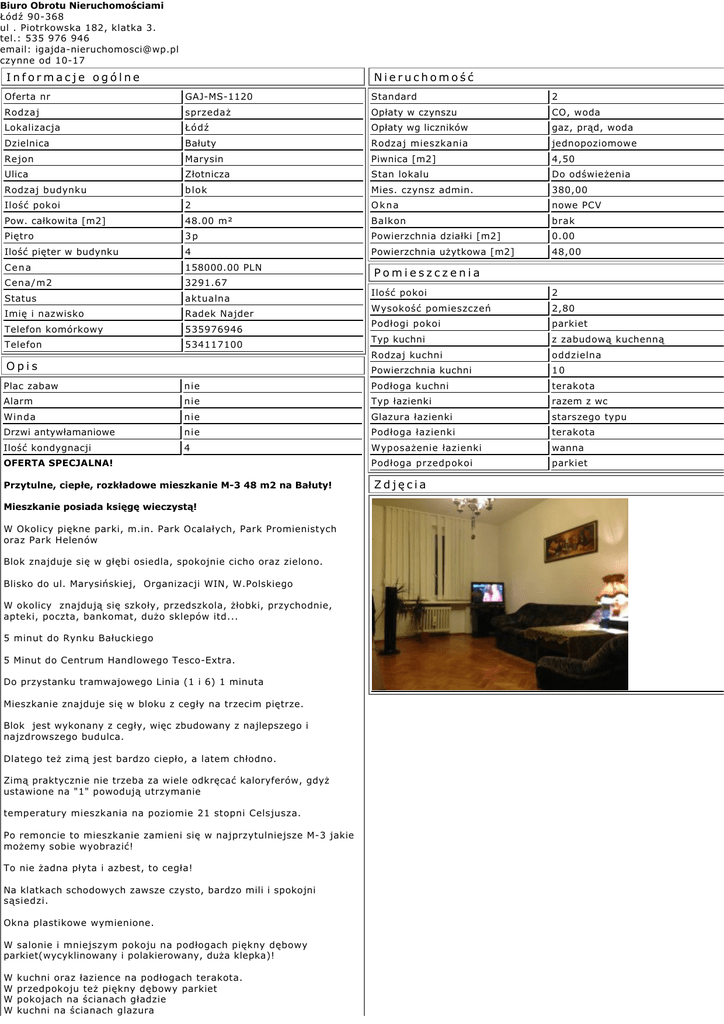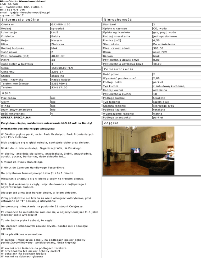 Biuro Obrotu Nieruchomościami Łódź 90-368 ul . Piotrkowska 182, klatka 3. tel.: 535 976 946 email: [email protected] czynne od 10-17 Informacje ogólne Nieruchomość Oferta nr GAJ-MS-1120 Standard 2 Rodzaj sprzedaż Opłaty w czynszu CO, woda Lokalizacja Łódź Opłaty wg liczników gaz, prąd, woda Dzielnica Bałuty Rodzaj mieszkania jednopoziomowe Rejon Marysin Piwnica [m2] 4,50 Ulica Złotnicza Stan lokalu Do odświeżenia Rodzaj budynku blok Mies. czynsz admin. 380,00 Ilość pokoi 2 Okna nowe PCV Pow. całkowita [m2] 48.00 m² Balkon brak Piętro 3p Powierzchnia działki [m2] 0.00 Ilość pięter w budynku 4 Powierzchnia użytkowa [m2] 48,00 Cena 158000.00 PLN Cena/m2 3291.67 Status aktualna Imię i nazwisko Radek Najder Telefon komórkowy Telefon 535976946 534117100 Opis Pomieszczenia Ilość pokoi 2 Wysokość pomieszczeń 2,80 Podłogi pokoi parkiet Typ kuchni z zabudową kuchenną Rodzaj kuchni oddzielna Powierzchnia kuchni 10 Plac zabaw nie Podłoga kuchni terakota Alarm nie Typ łazienki razem z wc Winda nie Glazura łazienki starszego typu Drzwi antywłamaniowe nie Podłoga łazienki terakota Ilość kondygnacji 4 Wyposażenie łazienki wanna OFERTA SPECJALNA! Podłoga przedpokoi parkiet Przytulne, ciepłe, rozkładowe mieszkanie M-3 48 m2 na Bałuty! Zdjęcia Mieszkanie posiada księgę wieczystą! W Okolicy piękne parki, m.in. Park Ocalałych, Park Promienistych oraz Park Helenów Blok znajduje się w głębi osiedla, spokojnie cicho oraz zielono. Blisko do ul. Marysińskiej, Organizacji WIN, W.Polskiego W okolicy znajdują się szkoły, przedszkola, żłobki, przychodnie, apteki, poczta, bankomat, dużo sklepów itd... 5 minut do Rynku Bałuckiego 5 Minut do Centrum Handlowego Tesco-Extra. Do przystanku tramwajowego Linia (1 i 6) 1 minuta Mieszkanie znajduje się w bloku z cegły na trzecim piętrze. Blok jest wykonany z cegły, więc zbudowany z najlepszego i najzdrowszego budulca. Dlatego też zimą jest bardzo ciepło, a latem chłodno. Zimą praktycznie nie trzeba za wiele odkręcać kaloryferów, gdyż ustawione na "1" powodują utrzymanie temperatury mieszkania na poziomie 21 stopni Celsjusza. Po remoncie to mieszkanie zamieni się w najprzytulniejsze M-3 jakie możemy sobie wyobrazić! To nie żadna płyta i azbest, to cegła! Na klatkach schodowych zawsze czysto, bardzo mili i spokojni sąsiedzi. Okna plastikowe wymienione. W salonie i mniejszym pokoju na podłogach piękny dębowy parkiet(wycyklinowany i polakierowany, duża klepka)! W W W W kuchni oraz łazience na podłogach terakota. przedpokoju też piękny dębowy parkiet pokojach na ścianach gładzie kuchni na ścianach glazura W Łazience na ścianach glazura W kuchni pozostaje wszystko! Wystawa okien wschód-zachód Mieszkanie do odświeżenia Zapraszam do oglądania i zakupu. Mieszkanie jest naprawdę w okazyjnej cenie! Łap Okazję ! Uwaga! Dane w ofercie mogą odbiegać od stanu faktycznego, mają jedynie charakter informacyjny, oparte są na informacjach uzyskanych od klientów zgłaszających. Oferta nie stanowi oferty w rozumieniu kodeksu cywilnego. Oferta może być w danym momencie nieaktualna. Biuro Obrotu Nieruchomościami Łódź 90-368 ul . Piotrkowska 182, klatka 3. tel.: 535 976 946 email: [email protected] czynne od 10-17
