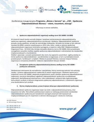 Konferencja inauguracyjna Programu ,,Biznes z Sercem” pn. ,,CSR – Społeczna Odpowiedzialność Biznesu – wiem, rozumiem, stosuję” Informacja na temat wykładów. 1. Społeczna odpowiedzialność organizacji według norm ISO 26000 i SA 8000 W ostatnich latach bardzo wzrosło krajowe i światowe zainteresowanie odpowiedzialnością społeczną organizacji, odpowiedzialnością za jej decyzje i działania. Odpowiedzialność społeczna posiada szereg aspektów, od ludzi do naturalnego środowiska. Od wielu lat istnieje w tym zakresie standard SA 8000, ostatnio nowelizowany w 2014 roku, który ustala w zakresie społecznej odpowiedzialności organizacji minimalne wymagania, w oparciu o akty ONZ i Międzynarodowej Organizacji Pracy. Od 2010 roku istnieje niezwykle obszerna norma ISO 26000, która przedstawia szczegółowo wszystkie możliwe aspekty społecznej odpowiedzialności z odniesieniem do standardów międzynarodowych w tej dziedzinie. Wykład zapoznaje z zarysem postanowień obu norm, by zapewnić uczestnikom ogólną wiedzę na temat społecznej odpowiedzialności i jej elementów w organizacji, w tym w przedsiębiorstwach produkcyjnych, handlowych i urzędach. Wiedza ta pozwoli Państwu rozeznać miejsce Państwa organizacji w omawianej dziedzinie i dokonać odpowiednich decyzji i działań. 2. Zarządzanie społeczną odpowiedzialnością biznesu według normy ISO 26000 praktyczne wdrażanie. Szkolenie jest skierowane do menadżerów i specjalistów, którzy zamierzają wdrożyć lub wdrażają zasady, i systemy odpowiedzialności społecznej w swoich organizacjach. Szkolenie oparte jest o znajomość normy ISO 26000 i obejmuje przypomnienie zasad i dziedzin społecznej odpowiedzialności organizacji, ćwiczenie Identyfikacji zagadnień odpowiedzialności społecznej w przykładowej organizacji, identyfikację jej interesariuszy i sfery oddziaływań, ustalanie ładu organizacyjnego, komunikacji i praktyk w zakresie integrowania społecznej odpowiedzialności z działaniami organizacji oraz doskonalenia tych praktyk. 3. Normy międzynarodowe, prawo krajowe dotyczące odpowiedzialności społecznej. Odpowiedzialność społeczna organizacji wiąże się ścisłe z odpowiedzialnością prawną, choć oczywiście nie tylko. Warunkiem podstawowym wejścia w realizację postanowień standardów odpowiedzialności społecznej jest świadomość wymagań prawnych tak krajowych jak międzynarodowych oaz ich znajomość w zakresie obowiązującym i skuteczna realizacja. W ramach szkolenia zasygnalizujemy dziedziny prawa istotne dla społecznej odpowiedzialności i przytoczymy najważniejsze akty prawa międzynarodowego i przepisy prawne obowiązujące w Polsce. 4. Metoda weryfikacji zakresu wdrożenia standardu ISO 26000 w przedsiębiorstwach ISO 26000 jest Normą Międzynarodową zawierającą wytyczne dotyczące społecznej odpowiedzialności, czyli odpowiedzialności organizacji za wpływ podejmowanych decyzji i działań na społeczeństwo i środowisko, zapewnianej poprzez przejrzyste i etyczne postępowanie. Weryfikacja społecznej odpowiedzialności biznesu ma na celu: wsparcie Organizacji w osiąganiu zrównoważonego rozwoju, poprawę zaufania do Organizacji i polepszenie relacji z interesariuszami. Jest również formą pomocy Organizacji, w ocenie stopnia wdrożenia wytycznych zawartych w normie ISO 26000. Podczas szkolenia przedstawimy Państwu metodykę podejścia do weryfikacji zakresu wdrożenia ISO 26000 w Organizacjach, opartą na wypracowanej w PRS Certyfikacja specyfikacji i procedurze postępowania. Ze względu na to, że Norma ISO 26000 nie stanowi podstawy do prowadzenia audytów, eksperci PRS Certyfikacja opracowali metodykę, która pozwala na przeprowadzenie skutecznej weryfikacji wdrożenia, w oparciu o wytyczne i zalecenia zawarte w normie ISO 26000. 5. Osiągnięcia przedsiębiorstw w zakresie społecznej odpowiedzialności. Przedstawiciele przedsiębiorstw przedstawią cele wdrażania społecznej odpowiedzialności, przyczyny dla których oparto wdrożenie o normę ISO 26000, cele i przebieg wdrożenia, osiągnięcia i dalsze perspektywy i zadania. 6. ISO 26000 zagadnienia środowiskowe. Europejski wymiar odpowiedzialności środowiskowej – EMAS. Zarzadzanie środowiskiem zgodnie z zasadą zrównoważonego rozwoju jest bardzo istotnym elementem społecznej odpowiedzialności, szczególnie w przedsiębiorstwach produkcyjnych zużywających zasoby naturalne, lub korzystające z materiałów przetworzonych. Wykład ma pokazać podejście do zagadnień zarządzania środowiskiem tak, by wypełnić zasadę zrównoważonego rozwoju i kierunki nadane przez normę ISO 26000 w tym spełnienie wymagań prawnych.