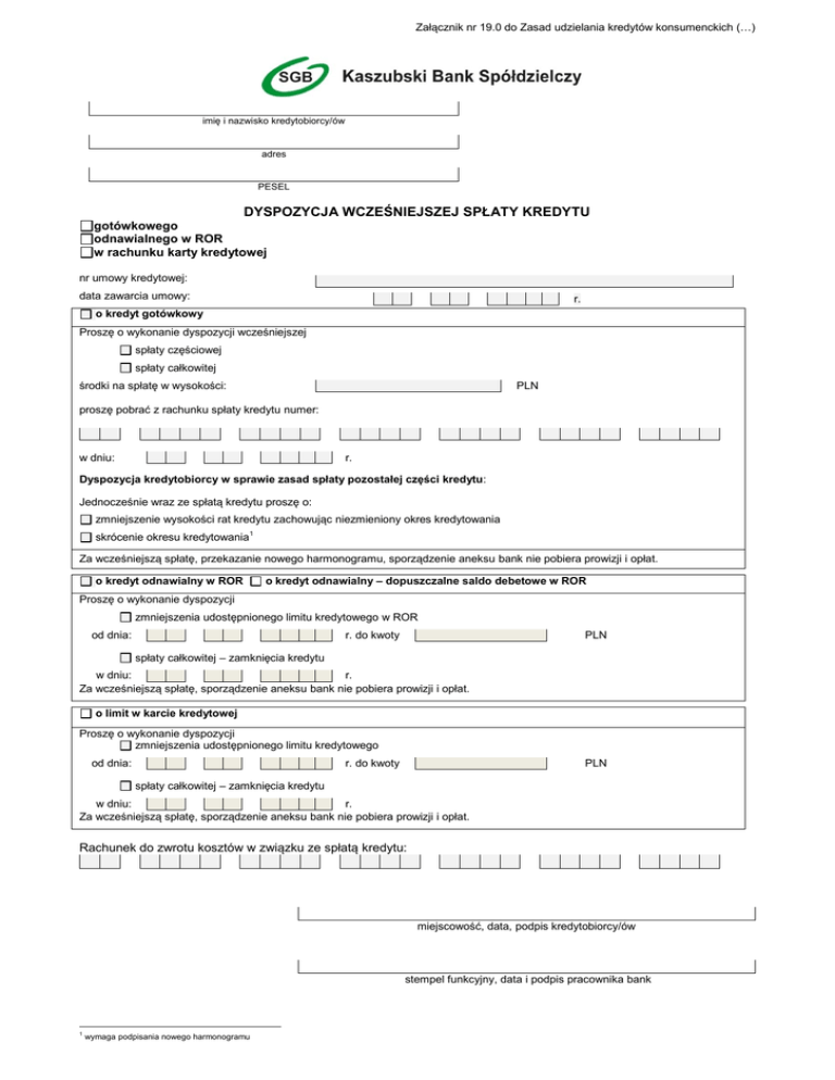 Załącznik nr 19.0 do Zasad udzielania kredytów konsumenckich (…) imię i nazwisko kredytobiorcy/ów adres PESEL DYSPOZYCJA WCZEŚNIEJSZEJ SPŁATY KREDYTU gotówkowego odnawialnego w ROR w rachunku karty kredytowej nr umowy kredytowej: data zawarcia umowy: r. o kredyt gotówkowy Proszę o wykonanie dyspozycji wcześniejszej spłaty częściowej spłaty całkowitej środki na spłatę w wysokości: PLN proszę pobrać z rachunku spłaty kredytu numer: w dniu: r. Dyspozycja kredytobiorcy w sprawie zasad spłaty pozostałej części kredytu: Jednocześnie wraz ze spłatą kredytu proszę o: zmniejszenie wysokości rat kredytu zachowując niezmieniony okres kredytowania skrócenie okresu kredytowania1 Za wcześniejszą spłatę, przekazanie nowego harmonogramu, sporządzenie aneksu bank nie pobiera prowizji i opłat. o kredyt odnawialny w ROR o kredyt odnawialny – dopuszczalne saldo debetowe w ROR Proszę o wykonanie dyspozycji zmniejszenia udostępnionego limitu kredytowego w ROR od dnia: r. do kwoty PLN spłaty całkowitej – zamknięcia kredytu w dniu: r. Za wcześniejszą spłatę, sporządzenie aneksu bank nie pobiera prowizji i opłat. o limit w karcie kredytowej Proszę o wykonanie dyspozycji zmniejszenia udostępnionego limitu kredytowego od dnia: r. do kwoty PLN spłaty całkowitej – zamknięcia kredytu w dniu: r. Za wcześniejszą spłatę, sporządzenie aneksu bank nie pobiera prowizji i opłat. Rachunek do zwrotu kosztów w związku ze spłatą kredytu: miejscowość, data, podpis kredytobiorcy/ów stempel funkcyjny, data i podpis pracownika bank 1 wymaga podpisania nowego harmonogramu