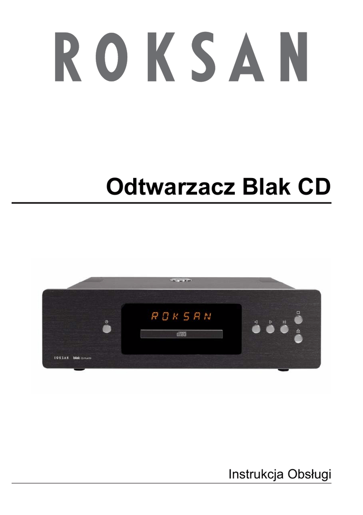 Odtwarzacz Blak CD Instrukcja Obsługi Spis treści Instrukcje dot. bezpieczeństwa 3 Wstęp 4 Rozpakowanie 5 Zasilanie 5 Interferencje6 Rozmieszczenie 6 Panel przedni i tylny 7 Konfiguracja 9 Obsługa 9 Rozwiązywanie problemów 11 2 Instrukcje dot. bezpieczeństwa WAŻNE PRZECZYTAJ DOKŁADNIE SEKCJĘ PRZED OBSŁUGĄ! UWAGA: ABY UNIKNĄĆ RYZYKA POŻARU LUB PORAŻENIA ELEKTRYCZNEGO NIE NARAŻAJ URZĄDZENIA NA DZIAŁANIE DESZCZU LUB WILGOCI. NIGDY NIE ZDEJMUJ POKRYWY (LUB TYLNEJ OBUDOWY). W ŚRODKU NIE MA CZĘŚCI WYMAGAJĄCYCH SERWISU UŻYTKOWNIKA. POZOSTAW SERWISOWANIE WYKWALIFIKOWANYM PRACOWNIKOM SERWISU. Symbol trójkąta z błyskawicą w środku ostrzega użytkownika przed możliwością wystąpienia nieizolowanych niebezpiecznych napięć wewnątrz obudowy urządzenia, które mogą powodować porażenie elektryczne człowieka. Symbol trójkąta z wykrzyknikiem w środku ostrzega użytkownika o występowaniu ważnych instrukcji obsługi i serwisowania w literaturze dołączonej do urządzenia. ŚRODKI BEZPIECZEŃSTWA I OSTROŻNOŚCI Pozostaw miejsce dookoła urządzenia w celu prawidłowej wentylacji. Unikaj instalacji: w gorących, chłodnych, nasłonecznionych miejscach, trzymaj urządzenie z daleka od źródeł ciepła. Chroń urządzenie przed: wilgocią, wodą i kurzem. Nie stawiaj ciężkich przedmiotów na obudowie. Nie zasłaniaj przewodów wentylacyjnych gazetami, obrusami, zasłonami, itp. Unikaj otwartego ognia (np. zapalonych świec, itp.) w pobliżu urządzenia. Zachowaj odpowiednie procedury utylizacji starych baterii. Nie wolno dopuścić, aby cokolwiek kapało lub zostało wylane na urządzenie. Nie stawiaj na urządzeniu pojemników z płynami (takich jak dzbanki, wazony, itp.). Nie pozwól na kontakt ze środkami owadobójczymi, takimi jak np. benzen. Nigdy nie rozkręcaj urządzenia lub modyfikuj go w dowolny sposób. Uwagi na temat przewodu i gniazda zasilającego. Dla zapewnienia maksymalnego bezpieczeństwa, oryginalny przewód zasilający musi zostać podłączony do prawidłowo uziemionego gniazda instalacji elektrycznej. Przewód zasilający musi być wykonany z trzech żył i zapewniać prawidłowe uziemienie urządzenia. Nieprawidłowe przewody zasilające są główną przyczyną uszkodzeń. Fakt, że urządzenie działa w sposób zadowalający nie świadczy o prawidłowym uziemieniu i bezpiecznej instalacji. Dla własnego bezpieczeństwa, jeżeli masz jakiekolwiek wątpliwości co do prawidłowości podłączenia i uziemienia skontaktuj się z w tej sprawie ze specjalistą w dziedzinie instalacji elektrycznych. Ogólnoeuropejskie zunifikowane napięcie zasilające. Wszystkie urządzenia dostosowane są do zasilania prądem zmiennym o napięciu 220-240V. Urządzenie jest podłączone do sieci zasilającej tak długo, jak przewód zasilający umieszczony jest w gnieździe, nawet, jeśli pewne jego funkcje są niedostępne. Aby całkowicie odłączyć urządzenie od sieci zasilającej, musisz wyjąć wtyczkę z gniazda sieciowego. Przed konfiguracją urządzenia, upewnij się, że gniazdo zasilające jest łatwo dostępne. Wyjmij przewód zasilający z gniazda, jeśli nie będziesz dłuższy czas korzystał z urządzenia. 3 Wstęp Gratulujemy zakupu odtwarzacza Roksan blak CD. Został on stworzony i wyprodukowany zgodnie z najwyższymi wymaganiami dotyczącymi specyfikacji, oraz rygorystycznie przetestowany, aby zapewnić lata przyjemnych odsłuchów. Odtwarzacz blak jest integralną częścią systemu dźwięku. Jego poprawna konfiguracja i obsługa będą miały znaczący wpływ na jakość brzmienia całości instalacji hi-fi. Prosimy zapoznać się z niniejszą instrukcją obsługi. Pomoże to w lepszym zrozumieniu za co odpowiadają poszczególne komponenty systemu hi-fi, oraz co za tym idzie zwiększenie przyjemności odsłuchów. 4 Rozpakowanie W opakowaniu odtwarzacza blak CD znajdziesz: • Główne urządzenie oznaczone odpowiednią naklejką z informacją na temat wymaganego napięcia zasilania. • Pilot zdalnej kontroli Roksan R7 v.3. Po odłączeniu odtwarzacza blak CD od zasilania, obudowa może być wyczyszczona miękką suchą ściereczką. Unikaj używania silnych środków czyszczących. Zasilanie Roksan blak CD jest przystosowany do zasilania odpowiedniego dla danego kraju dystrybucji. Naklejkę ze stosowną informacją znajdziesz na swoim urządzeniu. Prosimy o sprawdzenie typu zasilania przed podłączeniem urządzenia. Urządzenia 230V: Urządzenia 115V: Urządzenia 100V: Zakres napięcia: 220V - 240V Zakres napięcia: 110V - 120V Zakres napięcia: 90V - 110V Kabel zasilania dostarczany z urządzeniem wyposażony jest we wtyczkę IEC, którą należy podłączyć do odpowiedniego gniazda na tylnym panelu odtwarzacza blak CD. Drugi koniec podłącz do gniazda zasilania. Kabel ten nie powinien być odłączany od wejścia. Jeśli zostanie uszkodzony, zalecamy zakup odpowiednika u autoryzowanego sprzedawcy Roksan. Główne bezpieczniki odtwarzacza CD są umieszczone na jego tylnym panelu obok wejścia zasilania. Mogą zostać wymienione wyłącznie na bezpieczniki tego samego typu i z zakresu opisanego na naklejce umieszczonej na tylnym panelu urządzenia. Jeżeli urządzenie nie będzie używane przez dłuższy czas, odłącz je od gniazda zasilania. 5 Interferencje Poprawne ustawienie urządzenia powinno wyeliminować możliwość występowania zakłóceń sygnałów radiowych. Nie ma jednak gwarancji całkowitego braku takich interferencji. Jeśli się pojawią (możesz sprawdzić czy odtwarzacz jest ich przyczyną poprzez wyłączenie i włączenie go) spróbuj zastosować jedną z poniższych rad: • Zmień ustawienie anteny odbiorczej. • Zwiększ odległość między odtwarzaczem a amplitunerem (lub innym urządzeniem komunikującym się drogą radiową). • Podłącz odtwarzacz CD do innego obwodu prądu niż urządzenie radiowe. Rozmieszczenie Odtwarzacz blak CD powinien być ustawiony w miejscu o dobrej wentylacji z dala od 