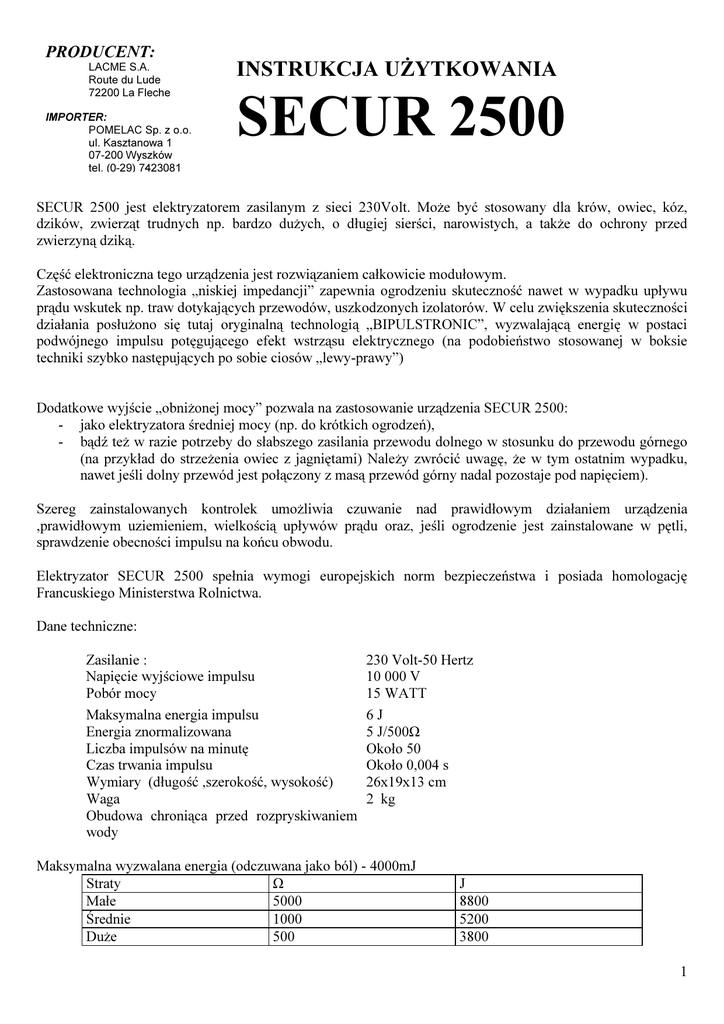 PRODUCENT: LACME S.A. Route du Lude 72200 La Fleche IMPORTER: POMELAC Sp. z o.o. ul. Kasztanowa 1 07-200 Wyszków tel. (0-29) 7423081 INSTRUKCJA UŻYTKOWANIA SECUR 2500 SECUR 2500 jest elektryzatorem zasilanym z sieci 230Volt. Może być stosowany dla krów, owiec, kóz, dzików, zwierząt trudnych np. bardzo dużych, o długiej sierści, narowistych, a także do ochrony przed zwierzyną dziką. Część elektroniczna tego urządzenia jest rozwiązaniem całkowicie modułowym. Zastosowana technologia „niskiej impedancji” zapewnia ogrodzeniu skuteczność nawet w wypadku upływu prądu wskutek np. traw dotykających przewodów, uszkodzonych izolatorów. W celu zwiększenia skuteczności działania posłużono się tutaj oryginalną technologią „BIPULSTRONIC”, wyzwalającą energię w postaci podwójnego impulsu potęgującego efekt wstrząsu elektrycznego (na podobieństwo stosowanej w boksie techniki szybko następujących po sobie ciosów „lewy-prawy”) Dodatkowe wyjście „obniżonej mocy” pozwala na zastosowanie urządzenia SECUR 2500: - jako elektryzatora średniej mocy (np. do krótkich ogrodzeń), - bądź też w razie potrzeby do słabszego zasilania przewodu dolnego w stosunku do przewodu górnego (na przykład do strzeżenia owiec z jagniętami) Należy zwrócić uwagę, że w tym ostatnim wypadku, nawet jeśli dolny przewód jest połączony z masą przewód górny nadal pozostaje pod napięciem). Szereg zainstalowanych kontrolek umożliwia czuwanie nad prawidłowym działaniem urządzenia ,prawidłowym uziemieniem, wielkością upływów prądu oraz, jeśli ogrodzenie jest zainstalowane w pętli, sprawdzenie obecności impulsu na końcu obwodu. Elektryzator SECUR 2500 spełnia wymogi europejskich norm bezpieczeństwa i posiada homologację Francuskiego Ministerstwa Rolnictwa. Dane techniczne: Zasilanie : Napięcie wyjściowe impulsu Pobór mocy Maksymalna energia impulsu Energia znormalizowana Liczba impulsów na minutę Czas trwania impulsu Wymiary (długość ,szerokość, wysokość) Waga Obudowa chroniąca przed rozpryskiwaniem wody 230 Volt-50 Hertz 10 000 V 15 WATT 6J 5 J/500Ω Około 50 Około 0,004 s 26x19x13 cm 2 kg Maksymalna wyzwalana energia (odczuwana jako ból) - 4000mJ Straty Ω Małe 5000 Średnie 1000 Duże 500 J 8800 5200 3800 1 SPOSÓB INSTALOWANIA Aby dysponować dobrze działającym ogrodzeniem elektrycznym, należy niewątpliwie dysponować dobrej jakości elektryzatorem pastwiskowym. Nieodzowne jest także staranne zamontowanie izolatorów, słupków, przewodów i uziemienia. Izolatory: Bez względu na to, czy słupki są stałe czy przenośne, należy je wyposażyć w specjalnie do tego celu przewidziane izolatory (stosowanie kawałków tworzywa z odzysku czy folii jest niedopuszczalne). W wypadku urządzeń „o dużej energii” należy użyć właściwych izolatorów (IRUBLOC, IRULON, IRUVIS, ISOBLOC, itp.). Słupki: słupki mogą być rozstawione co 10 do 12 metrów, w zależności od tego, czy są stałe czy przenośne oraz od tego czy teren jest płaski czy pofałdowany. Paliki w narożnikach muszą być odpowiednio wzmocnione aby wytrzymać naciąg przewodów. W wypadku ogrodzenia przenośnego należy raczej zainwestować w paliki izolujące (włókno szklane lub tworzywo) niż w tanie paliki metalowe. Dzięki temu eliminuje się wszelkie ryzyko znacznych upływów prądu w razie uszkodzenia izolatora(ów). Przewody: w wielu wypadkach do strzeżenia bydła wystarcza zamontowanie jednego przewodu (na wysokości około 80 - 90 cm od ziemi). Do strzeżenia owiec konieczne jest zamontowanie dwóch przewodów (na wysokości około 40 i 70 cm od ziemi). W wypadku zwierząt trudnych do strzeżenia należy zainstalować naprzemiennie dwa przewody pod napięciem i dwa przewody zerowe, rozstawione co około 20 cm (przewody zerowe należy połączyć ze sobą i z ziemią co około 50 m). W wypadku ogrodzeń stałych zaleca się stosowanie przewodu typu FORCEFLEX, który jest bardzo dobrym przewodnikiem, bardzo lekki, a więc bardzo łatwo dający się instalować i który ma dożywotnią gwarancję ochrony przed rdzą. W wypadku ogrodzeń przenośnych zaleca się stosowanie giętkich plecionek (BLANFOR, BLEUFOR, SUPERBLEU lub EXTRABLEU), które dają się łatwo nawijać przy przenoszeniu ogrodzenia. Uziemienie: jego rola ma tak zasadnicze znaczenie dla skuteczności ogrodzenia, że jest ono szczegółowo opisane w oddzielnej instrukcji dołączanej do każdego urządzenia. Uwaga: w wypadku zetknięcia się zwierzęcia z ogrodzeniem zamknięcie obwodu powrotnego odbywa się poprzez ziemię • nie ma potrzeby zamykania obwodu ogrodzenia, ponieważ takie ogrodzenie elektryczne może być liniowe, usytuowane po jednej stronie pastwiska. • na niektórych, bardzo suchych terenach poprawę efektu uziemienia uzyskuje się poprzez rozpięcie przewodu zerowego na wysokości 20 cm nad ziemią, dostatecznie dobrze połączonego z ziemią na odcinku kilku metrów (lub na przykład połączonego z ziemią co 50 m). Odgromnik: pomimo iż każdy elektryzator LACME jest odpowiednio zabezpieczony przed skutkami burzy, można zmniejszyć efekty bardzo silnego uderzenia pioruna poprzez zainstalowanie zewnętrznego odgromnika, dostępnego u sprzedawcy urządzenia. ŚRODKI OSTROŻNOŚCI • • • • • 2 Należy dopilnować, aby w każdej sytuacji zwierze po zetknięciu się z ogrodzeniem mogło się wycofać: każde dłuższe zetknięcie się z ogrodzeniem mogłoby spowodować poważne oparzenia (na przykład nie ustawiać ogrodzenia w poprzek podmokłego terenu, gdzie zwierzę mogłoby ugrzęznąć i zostać unieruchomione). W żadnym wypadku nie podłączać urządzenia do ogrodzenia z drutu kolczastego. Nie ustawiać ogrodzenia w pobliżu napowietrznej linii wysokiego napięcia. Nie wykorzystywać słupów telefonicznych do mocowania na nich przewodów ogrodzenia elektrycznego. Nie stosować wyżej opisanego urządzenia do innych celów niż jest ono p