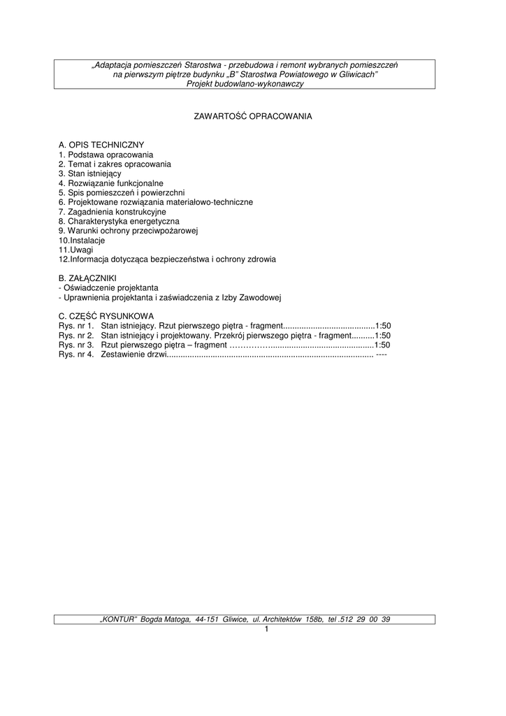 „Adaptacja pomieszczeń Starostwa - przebudowa i remont wybranych pomieszczeń na pierwszym piętrze budynku „B” Starostwa Powiatowego w Gliwicach” Projekt budowlano-wykonawczy ZAWARTOŚĆ OPRACOWANIA A. OPIS TECHNICZNY 1. Podstawa opracowania 2. Temat i zakres opracowania 3. Stan istniejący 4. Rozwiązanie funkcjonalne 5. Spis pomieszczeń i powierzchni 6. Projektowane rozwiązania materiałowo-techniczne 7. Zagadnienia konstrukcyjne 8. Charakterystyka energetyczna 9. Warunki ochrony przeciwpożarowej 10.Instalacje 11.Uwagi 12.Informacja dotycząca bezpieczeństwa i ochrony zdrowia B. ZAŁĄCZNIKI - Oświadczenie projektanta - Uprawnienia projektanta i zaświadczenia z Izby Zawodowej C. CZĘŚĆ RYSUNKOWA Rys. nr 1. Stan istniejący. Rzut pierwszego piętra - fragment........................................1:50 Rys. nr 2. Stan istniejący i projektowany. Przekrój pierwszego piętra - fragment..........1:50 Rys. nr 3. Rzut pierwszego piętra – fragment …………….............................................1:50 Rys. nr 4. Zestawienie drzwi.......................................................................................... ---- „KONTUR” Bogda Matoga, 44-151 Gliwice, ul. Architektów 158b, tel .512 29 00 39 1 „Adaptacja pomieszczeń Starostwa - przebudowa i remont wybranych pomieszczeń na pierwszym piętrze budynku „B” Starostwa Powiatowego w Gliwicach” Projekt budowlano-wykonawczy OPIS TECHNICZNY 1. Podstawa opracowania - umowa z Inwestorem - uzgodniona koncepcja funkcjonalna - „Inwentaryzacja architektoniczno-budowlana budynku A, B i C” wykonana w październiku 2007r przez Atelier Urbanistyki-Architektury-Sztuki ul.Chopina 28/3, Gliwice - pomiary uzupełniające na miejscu 2. Temat i zakres opracowania Tematem opracowania jest projekt przebudowy i remontu wybranych pomieszczeń : na pierwszym piętrze – aneks socjalny, w budynku „B” Starostwa Powiatowego w Gliwicach. Zakres opracowania – projekt budowlano-wykonawczy. Projekty instalacji stanowią odrębne opracowania. 3.Stan istniejący Budynek „B” wzniesiony jest w technologii tradycyjnej jako czterokondygnacyjny i całkowicie podpiwniczony. Ściany murowane z cegły pełnej, strop nad piwnicą ceglany, pozostałe stropy drewniane. Budynek z dachem płaskim, krytym papą. Dach docieplony wełną mineralną gr.15cm. Główne wejście prowadzi z budynku „A”, dodatkowe wejście znajduje się na tyłach budynku. W budynku znajdują się dwie klatki schodowe. Budynek wyposażony jest w instalacje wod-kan, centralne ogrzewanie, instalację elektryczną i teletechniczną oraz indywidualne przewody wentylacji grawitacyjnej. 4. Rozwiązanie funkcjonalne Na pierwszym piętrze w aneksie socjalnym : zaprojektowano przesunięcie ścianki działowej, likwidację naświetli, wymianę drzwi oraz montaż sufitu podwieszanego. Zaproponowano nowy układ funkcjonalny i nowe rozmieszczenie urządzeń sanitarnych. 5. Spis pomieszczeń i powierzchni Obmiary pomieszczeń wykonano zgodnie z (PN –ISO 9836:1997) lp 1 nazwa pom. / nr pom. PIERWSZE PIĘTRO POKÓJ NR 162 2 Pu m 9,23 6. Projektowane rozwiązania materiałowo – techniczne 6.1. Ścianki działowe i obudowy : - Ścianka EI30 - konstrukcja CW/UW75, obustronne pojedyncze poszycie płytą GKF gr.12,5mm i wypełnienie wełną mineralną gr.5cm np.Poltrem Uni (system Rigips nr 3.40.02). Całkowita grubość ścianki 10cm - kanały wentylacyjne obudować płytami gipsowo-kartonowymi GKF gr. 12,5 mm układanymi na ruszcie stalowym systemowym. „KONTUR” Bogda Matoga, 44-151 Gliwice, ul. Architektów 158b, tel .512 29 00 39 2 „Adaptacja pomieszczeń Starostwa - przebudowa i remont wybranych pomieszczeń na pierwszym piętrze budynku „B” Starostwa Powiatowego w Gliwicach” Projekt budowlano-wykonawczy 6.2. Sufity podwieszone : Zaprojektowano sufit podwieszony rastrowy z (Armstrong Sahara Tegular). płytek wełny mineralnej 60x60cm, grubości 19mm 6.3. Posadzki : Należy zdemontować istniejące warstwy podłogowe, istniejący podkład cementowy zagruntować i zaizolować płynną folią (min.2 warstwy) a następnie ułożyć płytki ceramiczne na kleju. Posadzki z płytek ceramicznych, gresowych, nieśliskich o wymiarach ok.50x50cm. Kolor ustalić z Inwestorem. 6.4. Drzwi : Drzwi płytowe, przylgowe, wypełnienie - płyta otworowa, wykończenie - okleina drewnopodobna. Drzwi 2 wyposażone w kratkę wentylacyjną nawiewną o pow. min.200cm Ościeżnica drewniana, regulowana. Drzwi dostarcza Inwestor 6.5. Wykończenie ścian Ściany wyłożone płytkami ceramicznymi ściennymi na wysokość 200 cm, pozostała powierzchnia ścian malowana emulsją akrylową. Płytki o wymiarach 30x60cm (w układzie poziomym) w kolorach pastelowych. Kolor ustalić z Inwestorem. 7. Zagadnienia konstrukcyjne Ocena techniczna obiektu w aspekcie projektowanej przebudowy Elementy konstrukcyjne budynku w obszarze objętym opracowaniem nie wykazują nadmiernych ugięć ani odkształceń. Nie stwierdzono zawilgocenia posadzki, ścian ani sufitów. Stan techniczny budynku jest dobry. Konstrukcja stropu zapewnia spełnienie wymaganego warunku stanu granicznego nośności oraz stanu granicznego użytkowania dla planowanej funkcji. Planowana przebudowa nie powoduje zwiększenia obciążenia użytkowego, nie spowoduje nadmiernego wytężenia istniejącej konstrukcji, zagrożenia dla bezpieczeństwa użytkowników ani obniżenia przydatności do użytkowania istniejącego budynku. 8. Charakterystyka energetyczna Projektowane roboty budowlane nie wpływają na charakterystykę energetyczną budynku. 9. Warunki ochrony przeciwpożarowej Budynek o wysokości ok.13,5m kwalifikowany jako budynek średniowysoki. Kategoria zagrożenia ludzi ZL III. Klasa odporności ogniowej „B” . Ścianka działowa zaprojektowana została w klasie odporności ogniowej EI30. 10. Instalacje Planowana jest przebudowa instalacji wod-kan i elektrycznej oraz wykonanie wentylacji mechanicznej. Projekty i