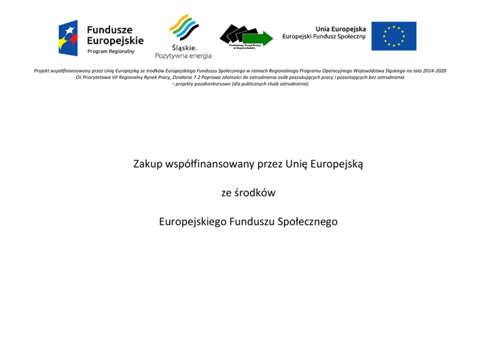 Projekt współfinansowany przez Unię Europejską ze środków Europejskiego Funduszu Społecznego w ramach Regionalnego Programu Operacyjnego Województwa Śląskiego na lata 2014-2020 Oś Priorytetowa VII Regionalny Rynek Pracy, Działanie 7.2 Poprawa zdolności do zatrudnienia osób poszukujących pracy i pozostających bez zatrudnienia – projekty pozakonkursowe (dla publicznych służb zatrudnienia) Zakup współfinansowany przez Unię Europejską ze środków Europejskiego Funduszu Społecznego