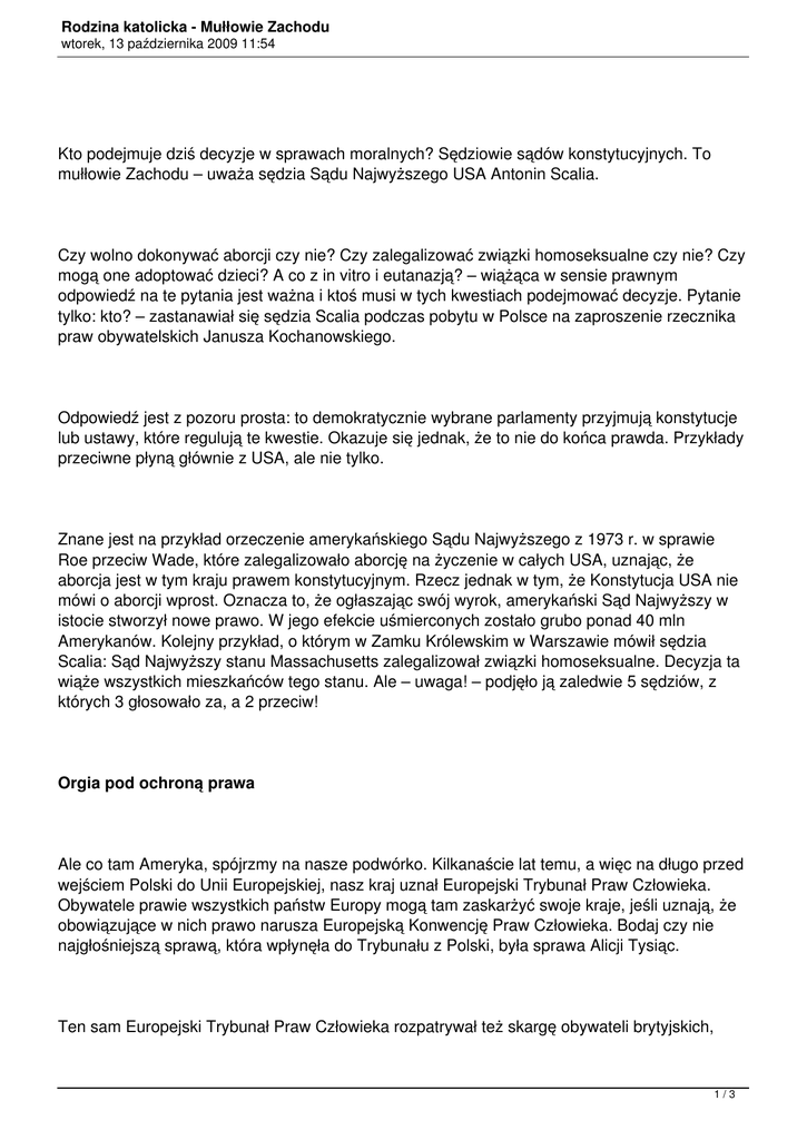 Rodzina katolicka - Mułłowie Zachodu wtorek, 13 października 2009 11:54 Kto podejmuje dziś decyzje w sprawach moralnych? Sędziowie sądów konstytucyjnych. To mułłowie Zachodu – uważa sędzia Sądu Najwyższego USA Antonin Scalia. Czy wolno dokonywać aborcji czy nie? Czy zalegalizować związki homoseksualne czy nie? Czy mogą one adoptować dzieci? A co z in vitro i eutanazją? – wiążąca w sensie prawnym odpowiedź na te pytania jest ważna i ktoś musi w tych kwestiach podejmować decyzje. Pytanie tylko: kto? – zastanawiał się sędzia Scalia podczas pobytu w Polsce na zaproszenie rzecznika praw obywatelskich Janusza Kochanowskiego. Odpowiedź jest z pozoru prosta: to demokratycznie wybrane parlamenty przyjmują konstytucje lub ustawy, które regulują te kwestie. Okazuje się jednak, że to nie do końca prawda. Przykłady przeciwne płyną głównie z USA, ale nie tylko. Znane jest na przykład orzeczenie amerykańskiego Sądu Najwyższego z 1973 r. w sprawie Roe przeciw Wade, które zalegalizowało aborcję na życzenie w całych USA, uznając, że aborcja jest w tym kraju prawem konstytucyjnym. Rzecz jednak w tym, że Konstytucja USA nie mówi o aborcji wprost. Oznacza to, że ogłaszając swój wyrok, amerykański Sąd Najwyższy w istocie stworzył nowe prawo. W jego efekcie uśmierconych zostało grubo ponad 40 mln Amerykanów. Kolejny przykład, o którym w Zamku Królewskim w Warszawie mówił sędzia Scalia: Sąd Najwyższy stanu Massachusetts zalegalizował związki homoseksualne. Decyzja ta wiąże wszystkich mieszkańców tego stanu. Ale – uwaga! – podjęło ją zaledwie 5 sędziów, z których 3 głosowało za, a 2 przeciw! Orgia pod ochroną prawa Ale co tam Ameryka, spójrzmy na nasze podwórko. Kilkanaście lat temu, a więc na długo przed wejściem Polski do Unii Europejskiej, nasz kraj uznał Europejski Trybunał Praw Człowieka. Obywatele prawie wszystkich państw Europy mogą tam zaskarżyć swoje kraje, jeśli uznają, że obowiązujące w nich prawo narusza Europejską Konwencję Praw Człowieka. Bodaj czy nie najgłośniejszą sprawą, która wpłynęła do Trybunału z Polski, była sprawa Alicji Tysiąc. Ten sam Europejski Trybunał Praw Człowieka rozpatrywał też skargę obywateli brytyjskich, 1/3 Rodzina katolicka - Mułłowie Zachodu wtorek, 13 października 2009 11:54 którzy domagali się unieważnienia obowiązującego w ich kraju przepisu, wedle którego stosunki homoseksualne nie były legalne, jeśli uczestniczyły w nich więcej niż dwie osoby. I w 2000 roku Trybunał przyznał im rację, uznając, że zorganizowanie pięcioosobowej orgii homoseksualnej to realizacja prawa do prywatności. Tego przekonania nie zachwiał nawet fakt, że uczestnicy tej orgii uznali ją za na tyle mało prywatną, że nagrali ją kamerą wideo. Ilu więc powinno być uczestników homoseksualnej orgii, żeby straciła ona charakter prywatny? Trybunał tego nie określił. – Przypuszczalnie jest to jakaś liczba między 5 a liczbą osób, którymi można by wypełnić Koloseum – skwitował ten wyrok sędzia Scalia. Jutro sens się zmieni Formalnie podstawą funkcjonowania Europejskiego Trybunału Praw Człowieka jest Europejska Konwencja Praw Człowieka. Ale jest jeszcze coś. W 1978 roku Trybunał uznał tę Konwencję za „żyjący instrument, który (…) musi być interpretowany w świetle bieżących okoliczności”. To znaczy, że przepisy konwencji nie mają jednego, stałego sensu. Sens ten może się zmieniać, ewoluować, a tylko od sędziów zależy, jaki sens będzie w danym momencie obowiązywał od Kamczatki po Lizbonę i od Islandii po Azerbejdżan. Sędziowie mogą więc zinterpretować przepisy konwencji w taki sposób, by – na przykład – zmusić kilkadziesiąt uznających go państw do legalizacji związków homoseksualnych. Podobnie może być także w innych gorących sprawach moralnych. Któregoś dnia możemy się dowiedzieć, że wąziutkie grono sędziów ze Strasburga zdecydowało o legalizacji w Polsce eutanazji. I bez znaczenia będzie, czy w tej sprawie odbyła się w naszym kraju debata społeczna. I bez znaczenia będzie, jakie stanowisko w tej sprawie zajął demokratycznie wybrany polski parlament. Sędzia czy polityk? Antonin Scalia, sam będąc sędzią amerykańskiego Sądu Najwyższego, krytykuje taki stan rzeczy. Krytykuje sytuację, w której sędziowie przyjmują rolę polityków, angażując się w rozwiązywanie problemów politycznych i moralnych metodą prób i błędów. Jego zdaniem, sądy konstytucyjne (takie jak amerykański Sąd Najwyższy, polski Trybunał Konstytucyjny czy w pewnym sensie także Europejski Trybunał Praw Człowieka) nie powinny podejmować zadań należących do polityków. Powinny jedynie kierować się jasnym rozumieniem przepisów konstytucji, ustawy czy Europejskiej Konwencji Praw Człowieka, a jeśli nie da się tego ustalić, powinny stosować takie rozumienie przepisu, jakie obowiązywało, gdy przepis ów był przyjmowany (ma to znaczenie zwłaszcza w USA, gdzie konstytucja powstała ponad 200 lat temu). Sędziom wolno – według niego – tyle i tylko tyle. – Jeśli sędziowie rutynowo dostarczają ostatecznych odpowiedzi na zadawane przez społeczeństwa pytania moralne, co do których istnieje obszerna przestrzeń do debaty – a nie będą po prostu określać znaczenia 2/3 Rodzina katolicka - Mułłowie Zachodu wtorek, 13 października 2009 11:54 demokratycznie przyjętych i uchwalonych aktów prawnych – wówczas to na sędziach spoczywać będzie polityczna odpowiedzialność – przestrzega sędzia Scalia. Arystokracja czy demokracja? Tymczasem sędziowie sądów konstytucyjnych, którzy orzekają w sprawach o wydźwięku politycznym, nie podlegają demokratycznym procedurom wyborczym i nie odpowiadają przed nikim. Czyli: niby mamy demokrację, ale w gorących sprawach moralnych rządzi sędziowska arystokracja. – Doszliśmy do sytuacji, która n