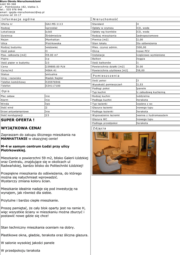 Biuro Obrotu Nieruchomościami Łódź 90-368 ul . Piotrkowska 182, klatka 3. tel.: 535 976 946 email: [email protected] czynne od 10-17 Informacje ogólne Nieruchomość Oferta nr GAJ-MS-1113 Standard 4 Rodzaj sprzedaż Opłaty w czynszu CO, woda Lokalizacja Łódź Opłaty wg liczników CO, woda Dzielnica Śródmieście Rodzaj mieszkania jednopoziomowe Rejon Manhattan Piwnica [m2] 2,00 Ulica Piotrkowska Stan lokalu Do odświeżenia Rodzaj budynku wieżowiec Mies. czynsz admin. 500,00 Ilość pokoi 3 Okna nowe PCV Pow. całkowita [m2] 59.00 m² Instalacje częściowo wymienione Piętro 1p Balkon loggia Ilość pięter w budynku 23 Ilość balkonów 1 Cena 239800.00 PLN Powierzchnia działki [m2] 0.00 Cena/m2 4064.41 Powierzchnia użytkowa [m2] 58,00 Status aktualna Imię i nazwisko Radek Najder Telefon komórkowy 535976946 Telefon 534117100 Opis Pomieszczenia Ilość pokoi 3 Wysokość pomieszczeń 2,53 Podłogi pokoi panele Typ kuchni z zabudową kuchenną Plac zabaw nie Rodzaj kuchni oddzielna Alarm nie Podłoga kuchni terakota Winda tak Typ łazienki osobno z wc Ilość wind 2 Glazura łazienki nowego typu Drzwi antywłamaniowe nie Podłoga łazienki terakota Ilość kondygnacji 23 Wyposażenie łazienki wanna z hydromasażem Glazura WC nowego typu Podłoga przedpokoi terakota SUPER OFERTA ! WYJĄTKOWA CENA! Zapraszam do zakupu ślicznego mieszkania na MANHATTANIE w okazyjnej cenie! M-4 w samym centrum Łodzi przy ulicy Piotrkowskiej. Mieszkanie o powierzchni 59 m2, blisko Galerii Łódzkiej oraz Centralu, znajdujące się w okolicach ul Radwańskiej, bardzo blisko do Politechniki Łódzkiej! Przepiękne mieszkania do odświeżenia, do którego można się natychmiast wprowadzić. Wystarczy zmiana koloru ścian. Mieszkanie idealnie nadaje się pod inwestycję na wynajem, jak również dla siebie. Przytulne i bardzo ciepłe mieszkanie. Proszę pamiętać, że cały blok oparty jest na ramie H, więc wszystkie ściany w mieszkaniu można zburzyć i postawić nowe gdzie się chce! Stan techniczny mieszkania oceniam na dobry. Plastikowe okna, gładzie, terakota oraz śliczna glazura. W salonie wysokiej jakości panele W przedpokoju terakota Zdjęcia W sypialniach piękne szwedzkie panele o wysokiej klasie ścieralności.. Drzwi antywłamaniowe. Mieszkanie sprzedajemy z całym wyposażeniem kuchennym. Wystawa okien wschód- zachód W okolicy jest niemalże wszystko, Galeria Łódzka(100m), Rossmann(50m), Sfinks(50m), deptak, szkoły, gimnazja, wyższe uczelnie, przedszkola, liceum, apteki, przychodnie, przystanki autobusowe i tramwajowe, Biedronka, super pizzeria, Fitness i najlepsza siłownia w mieście, solarium itd... OGLĄDAJ-NEGOCJUJ-KUPUJ! Uwaga! Dane w ofercie mogą odbiegać od stanu faktycznego, mają jedynie charakter informacyjny, oparte są na informacjach uzyskanych od klientów zgłaszających. Oferta nie stanowi oferty w rozumieniu kodeksu cywilnego. Oferta może być w danym momencie nieaktualna. Biuro Obrotu Nieruchomościami Łódź 90-368 ul . Piotrkowska 182, klatka 3. tel.: 535 976 946 email: [email protected] czynne od 10-17