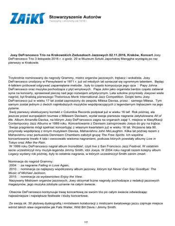 Joey DeFrancesco Trio na Krakowskich Zaduszkach Jazzowych 02.11.2016, Kraków, Koncert Joey DeFrancesco Trio 3 listopada 2016 r. o godz. 20 w Muzeum Sztuki Japońskiej Manggha wystąpią po raz pierwszy w Krakowie. Trzykrotnie nominowany do nagrody Grammy, mistrz organów jazzowych, trębacz i wokalista. Joey DeFrancesco urodzony w Pensylwanii w 1971 r. już od młodych lat oznaczał się ogromnym talentem. Będąc 4-latkiem próbował odgrywać zapamiętane melodie , były to często kompozycje jego ojca Papy Johna DeFrancesco oraz muzyka pochodząca z płyt winylowych. Papa John jako organista bardzo często zabierał syna na koncerty, sprawował pieczę nad jego rozwojem artystycznym. Lata szkolne przyniosły Joeyowi wiele nagród, był finalistą pierwszego Thelonious Monk International Jazz Competition. Dzięki temu Joey DeFrancesco już w wieku 17 lat został zaproszony do zespołu Milesa Davisa, przez samego Milesa. Tym samym został jednym z dwóch najmłodszych muzyków współpracujących z legendarnym trębaczem na jego pytanie. Swój pierwszy ekskluzywny kontakt z Columbia Records podpisał już w wieku 16 lat! Rok później, ale jeszcze przed europejskim tournee z Milesem Davisem, wydał swoje pierwsze nagranie zatytułowane All of Me. Album Amandla Davisa, na którym Joey DeFrancesco zagra na organach zajął 1. miejsce w klasyfikacji Contemporary Jazz Albums w 1989 roku. Koncertowanie z Davisem zainspirowało Joeya do gry na trąbce. Swoje pragnienie mógł spełniać koncertując z własnym kwartetem już w wieku 18 lat. Wczesne lata 90. przyniosły współpracę z innym muzykiem Davisa, Mahavishnu John McLaughlin. Kilka lat później razem z Mahavishnu oraz perkusista Dennisem Chambers założyli grupę The Free Spirits. Ich wspólne koncertowanie trwało 4 lata i owocowało wieloma nagraniami, podczas których powstały albumy Live in Tokyo oraz After the Rain. W 1999 roku DeFrancesco nagrał album Incredible!, czyli live z San Francisco Jazz Festival. W ostatnim secie uczestniczył inny muzyk-legenda Jimmy Smith, idol Joeya. W 2004 roku nagrali razem kolejny album Legacy wydany rok później, były to ostatnie nagrania, w których uczestniczył Smith zanim zmarł. Nominacje do nagród Grammy: 2004 za nagranie Falling in Love Again, 2010 nominacja za najlepszy współczesny album jazzowy, którym był Never Can Say Goodbye: The Music of Michael Jackson, 2015 nominacja za wydawnictwo Enjoy the View. Nazywany Mistrzem organów jazzowych, Joey otrzymał liczne nagrody pochodzące z redakcji jazzowych magazynów, jego muzyka zdobyła uznanie na całym świecie. Obecnie DeFrancesco kontynuuje trasę koncertową ze swoim trio po całym świecie odwiedzając najważniejsze i największe festiwale i kluby koncertowe. Ze swoją ok. 30 płytową dyskografią i mnóstwem kolaboracji z mistrzami światowego jazzu zajmuje miejsce wśród takich sław organistów jak Fats Waller, Wild Bill Davis i Jimmy Smith. 1/2 Bilety do nabycia na Ticketpro.pl oraz Info Kraków św. Jana 2. ? wróć do listy wydarzeń Wszelkie prawa zastrzeżone 2017 ZAiKS / data wygenerowania strony 07.03.2017 18:40:40 PDF ze strony: http://www.zaiks.org.pl/wydarzenia,508 2/2