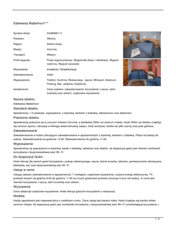 Edelweiss Matterhorn*** Symbol oferty: 5448089/111 Państwo: Włochy Region: Dolina Aosty Miasto: Cervinia Transport: Własny Profil wyjazdu: Pobyt wypoczynkowy, Wyjazd dla dzieci i młodzieży, Wyjazd Wyżywienie: śniadanie, Obiadokolacje Zakwaterowanie: Hotel Wyposażenie: Telefon, Kuchnia, Restauracja, sauna, Whirpool, Solarium, świadczenia: Cena zawiera: zakwaterowanie, korzystanie z sauny, łaźni rodzinny, Wyjazd narciarski Parking, Bar, Jadalnia, Kawiarnia tureckiej oraz siłowni, częściowe wyżywienie Nazwa obiektu Edelweiss Matterhorn Standard obiektu Apartamenty 1-3 osobowe, wyposażone, z łazienką, barkiem z lodówką, telewizorem oraz telefonem. Położenie obiektu Apartamenty położone są w uroczym mieście Cervinia, a dokładnie 250m od centrum miasta, około 300m od obiektu znajduje się centrum sportu i rekreacji w którego skład wchodzą: basen, korty tenisowe, boisko do piłki nożnej oraz pole golfowe. Zakwaterowanie Zakwaterowanie w hotelu oferującym zakwaterowanie w apartamentach z łazienką, barkiem z lodówką. Pobyt od soboty do soboty. Zakwaterowanie po godzinie 14.00. Wykwaterowanie do godziny 11.00. Wyposażenie Apartamenty są wyposażone w łazienkę, barek z lodówką, telewizor oraz telefon, do dyspozycji gości jest również możliwość korzystania z bezprzewodowej sieci Wi- Fi. Do dyspozycji Gości Hotel oferuje dla swoich gości korzystanie z pokoju telewizyjnego, saunę, łaźnie turecką, siłownie, pomieszczenie rekreacyjne, bibliotekę, bar oraz bezprzewodową sieć Wi- Fi. Usługi w cenie Usługa zawiera zakwaterowanie w apartamencie, 7 noclegów, częściowe wyżywienie, zużycie energii elektrycznej, TV, przewóz busem od godziny 8.00 do godziny 11.00 (w innych godzinach przewóz kosztuje 3 euro od osoby), w cenie jest również korzystanie z sauny, łaźni tureckiej oraz siłowni. Wyżywienie Cena obejmuje częściowe wyżywienie. Hotel oferuje gościom korzystanie z restauracji Notatka Każdy apartament jest niepowtarzalny o osobistym uroku. Cena usługi jest bardzo niska. Hotel znajduje się bardzo blisko centrum miasta. Do dyspozycji gości jest możliwość korzystania z bezprzewodowej sieci Wi- Fi umożliwiającej korzystanie z 1/2 Internetu. Cervinia Nieskończone śnieżne tereny, które rozpoczynają się na wysokości 1,524 m.n.p.m w Valtournenche, obejmują Breuil-Cervinię wznosząc się do 3,480 m.n.p.m przy Plateau Rosa, dotykając wysokiego na 4,000 m.n.p.m szczytu Piccolo Cervino, w końcu osiągają wysokość 4,478 m.n.p.m.: szczyt Cervino- terenu nieskończonej połaci śnieżnej od strony Szwajcarskiego Zermatt. Jest to miejsce,gdzie słowo -śnieg” oznacza sport, wypoczynek, zabawę. Tradycja turystyczna ma tu ponad 200 lat. W 1936 została stworzona nowa Breuil-Cervinia. Budowa pierwszej kolejki było wtedy najnowocześniejszą doskonałością techniczną. TERMINY: od: 2017-03-12 do: 2017-03-19 (8 dni), miejsca: zamów cena od: 2743 PLN = 630 EUR od: 2017-03-19 do: 2017-03-26 (8 dni), miejsca: zamów cena od: 2286 PLN = 525 EUR od: 2017-03-26 do: 2017-04-02 (8 dni), miejsca: zamów cena od: 2286 PLN = 525 EUR od: 2017-04-02 do: 2017-04-09 (8 dni), miejsca: zamów cena od: 2286 PLN = 525 EUR od: 2017-04-09 do: 2017-04-16 (8 dni), miejsca: zamów cena od: 2286 PLN = 525 EUR od: 2017-04-16 do: 2017-04-23 (8 dni), miejsca: zamów cena od: 3353 PLN = 770 EUR CENNIK: Długość pobytu: 8 dni 8 dni 8 dni Grupa cenowa: D G B 788 945 1050 1260 595 700 1088 1305 1050 1260 1110 1332 Pobyt w obiekcie (do wyboru) pokój 2os. dla 1os. 1155 pokój 2-os. + dziecko 1-3 standardowo dla osób: 3 1540 pokój 1-osobowy 840 pokój 2-os. + dziecko 3-5 standardowo dla osób: 3 1595 (*) pokój 2-osobowy standardowo dla osób: 2 1540 pokój 2-os. + dziecko 6-12 standardowo dla osób: 3 1628 Waluta: EUR Aktualne ceny z systemu S.A.R.T. (-) - cena usługi, podatku kalkulowana przy osobie lub gratis (*) - kwota wliczona w cenę standardową 2/2