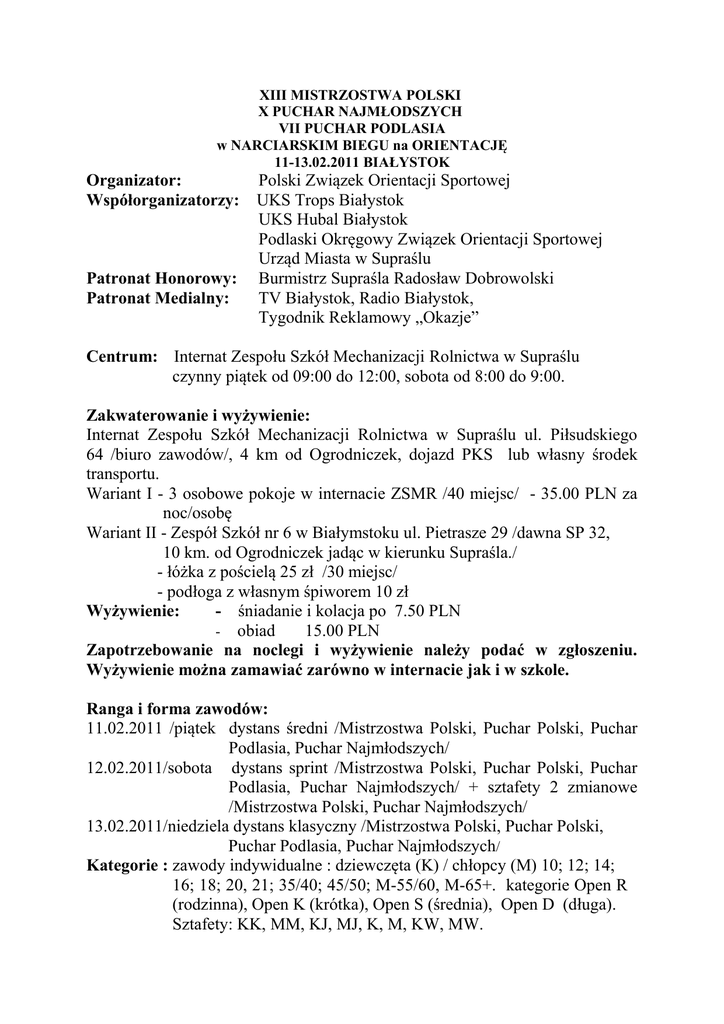 XIII MISTRZOSTWA POLSKI X PUCHAR NAJMŁODSZYCH VII PUCHAR PODLASIA w NARCIARSKIM BIEGU na ORIENTACJĘ 11-13.02.2011 BIAŁYSTOK Organizator: Współorganizatorzy: Patronat Honorowy: Patronat Medialny: Polski Związek Orientacji Sportowej UKS Trops Białystok UKS Hubal Białystok Podlaski Okręgowy Związek Orientacji Sportowej Urząd Miasta w Supraślu Burmistrz Supraśla Radosław Dobrowolski TV Białystok, Radio Białystok, Tygodnik Reklamowy „Okazje” Centrum: Internat Zespołu Szkół Mechanizacji Rolnictwa w Supraślu czynny piątek od 09:00 do 12:00, sobota od 8:00 do 9:00. Zakwaterowanie i wyżywienie: Internat Zespołu Szkół Mechanizacji Rolnictwa w Supraślu ul. Piłsudskiego 64 /biuro zawodów/, 4 km od Ogrodniczek, dojazd PKS lub własny środek transportu. Wariant I - 3 osobowe pokoje w internacie ZSMR /40 miejsc/ - 35.00 PLN za noc/osobę Wariant II - Zespół Szkół nr 6 w Białymstoku ul. Pietrasze 29 /dawna SP 32, 10 km. od Ogrodniczek jadąc w kierunku Supraśla./ - łóżka z pościelą 25 zł /30 miejsc/ - podłoga z własnym śpiworem 10 zł Wyżywienie: - śniadanie i kolacja po 7.50 PLN - obiad 15.00 PLN Zapotrzebowanie na noclegi i wyżywienie należy podać w zgłoszeniu. Wyżywienie można zamawiać zarówno w internacie jak i w szkole. Ranga i forma zawodów: 11.02.2011 /piątek dystans średni /Mistrzostwa Polski, Puchar Polski, Puchar Podlasia, Puchar Najmłodszych/ 12.02.2011/sobota dystans sprint /Mistrzostwa Polski, Puchar Polski, Puchar Podlasia, Puchar Najmłodszych/ + sztafety 2 zmianowe /Mistrzostwa Polski, Puchar Najmłodszych/ 13.02.2011/niedziela dystans klasyczny /Mistrzostwa Polski, Puchar Polski, Puchar Podlasia, Puchar Najmłodszych/ Kategorie : zawody indywidualne : dziewczęta (K) / chłopcy (M) 10; 12; 14; 16; 18; 20, 21; 35/40; 45/50; M-55/60, M-65+. kategorie Open R (rodzinna), Open K (krótka), Open S (średnia), Open D (długa). Sztafety: KK, MM, KJ, MJ, K, M, KW, MW. Zgłoszenia : w terminie do 05 luty 2011 /należy podać numer licencji lub numer ewidencyjny, rok urodzenia i numer SI/ na adres : [email protected] tel. Stefan Niczyporuk 502151052 /zgłoszenie jest ważne po otrzymaniu potwierdzenia jego przyjęcia/. Wszystkie zgłoszenia po terminie opłata wzrasta o 50 % Wpisowe : Dla zawodników zarejestrowanych w PZOS: kategorie K/M 12/14 lat oraz open i rekreacyjne 10.00 PLN, pozostałe kategorie 20.00 PLN, za każdy dzień zawodów indywidualnych. Zawody sztafetowe kategorie K/M, KJ, MJ i KW i MW 40 PLN, KJM i MJM 20 PLN za sztafetę. Zawodnicy nie zarejestrowani w PZOS opłata za każdy start większa o 50 % /nie dotyczy kategorii open/. Wypożyczenie Si: 3 PLN za jeden start, 8 PLN na całe zawody /4 starty/. Start:piątek -13:00 dystans średni sobota -10:00 dystans sprint + sztafety 2 zmianowe -12:00 niedziela -10:00 dystans klasyczny Mapa i teren: Nowa mapa „Ogrodniczki” skala dystans sprint 1:5000, dystans średni i sztafety 1:10000, dystans klasyczny 1:15000, e-2,5 m, opracowanie kartograficzne styczeń 2010. Specjalistyczne mapy do narciarskiego biegu na orientację. Autorzy mapy : Jan Cegiełka, Mirosław Dworakowski, Stefan Niczyporuk i Piotr Sierzputowski. Teren o zróżnicowanej rzeźbie i gęstej sieci ścieżek i dróg. Nagrody : Medale za miejsca 1-3, dyplomy za miejsca 1-6 we wszystkich kategoriach wiekowych w których wystartuje co najmniej 5 osób /organizator zastrzega sobie prawo łączenia kategorii wiekowych/. Upominki dla zwycięzców. Zakończenie : 13 luty 2011 godzina 13:00 w centrum zawodów. Zespół organizatorów: Kierownik zawodów Sędzia Główny Budowniczy tras Obsługa SI - Stefan Niczyporuk - Jan Cegiełka S-1 - Jan Cegiełka BT-1 - Krzysztof Kołakowski Potwierdzanie PK : Sport-Ident Aktualne informacje na: : www.mtbo.pl , www.orienteering.org.pl www.ukstrops.pl