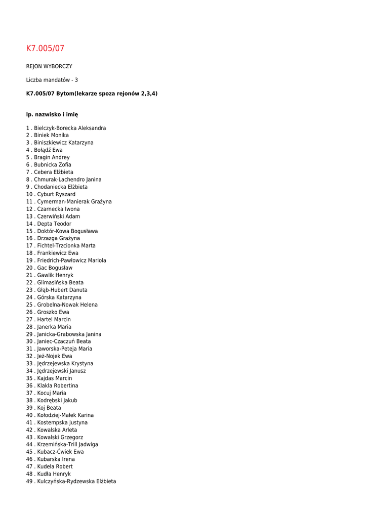 K7.005/07 REJON WYBORCZY Liczba mandatów - 3 K7.005/07 Bytom(lekarze spoza rejonów 2,3,4) lp. nazwisko i imię 1 . Bielczyk-Borecka Aleksandra 2 . Biniek Monika 3 . Biniszkiewicz Katarzyna 4 . Bołądź Ewa 5 . Bragin Andrey 6 . Bubnicka Zofia 7 . Cebera Elżbieta 8 . Chmurak-Lachendro Janina 9 . Chodaniecka Elżbieta 10 . Cyburt Ryszard 11 . Cymerman-Manierak Grażyna 12 . Czarnecka Iwona 13 . Czerwiński Adam 14 . Depta Teodor 15 . Doktór-Kowa Bogusława 16 . Drzazga Grażyna 17 . Fichtel-Trzcionka Marta 18 . Frankiewicz Ewa 19 . Friedrich-Pawłowicz Mariola 20 . Gac Bogusław 21 . Gawlik Henryk 22 . Glimasińska Beata 23 . Głąb-Hubert Danuta 24 . Górska Katarzyna 25 . Grobelna-Nowak Helena 26 . Groszko Ewa 27 . Hartel Marcin 28 . Janerka Maria 29 . Janicka-Grabowska Janina 30 . Janiec-Czaczuń Beata 31 . Jaworska-Peteja Maria 32 . Jeż-Nojek Ewa 33 . Jędrzejewska Krystyna 34 . Jędrzejewski Janusz 35 . Kajdas Marcin 36 . Klakla Robertina 37 . Kocuj Maria 38 . Kodrębski Jakub 39 . Koj Beata 40 . Kołodziej-Małek Karina 41 . Kostempska Justyna 42 . Kowalska Arleta 43 . Kowalski Grzegorz 44 . Krzemińska-Trill Jadwiga 45 . Kubacz-Ćwiek Ewa 46 . Kubarska Irena 47 . Kudela Robert 48 . Kudła Henryk 49 . Kulczyńska-Rydzewska Elżbieta 50 . Kulig Marzena 51 . Kurowska-Karkut Krystyna 52 . Kuś Mariusz 53 . Kwiatek-Kołcon Ewa 54 . Lampart Jacek 55 . Lewandowska Ludmiła 56 . Lipowiecka-Kubacz Urszula 57 . Łagód-Niemiec Alina 58 . Łukaszewicz-Gabryś Ewa 59 . Maciaszek-Łój Beata 60 . Majcher Krystyna 61 . Malinowska Lolita 62 . Małota Urszula 63 . Małowska-Perzyńska Bożena 64 . Marchwiany Agata 65 . Matejczyk-Kowalczyk Urszula 66 . Miszczyk-Stokłosa Marzena 67 . Moś Iwona 68 . Musiał Brygida 69 . Niedbała-Gwóźdź Teresa 70 . Nowak Janusz 71 . Nowak-Suszek Małgorzata 72 . Odlanicka-Poczobutt Ewa 73 . Olszewska-Mojsej Elżbieta 74 . Paluch-Zasada Beata 75 . Papierkowska-Ziomek Elżbieta 76 . Pędracka Barbara 77 . Piwońska-Lobermajer Anna 78 . Planer Marek 79 . Podworska Ilona 80 . Popczyk Stefan 81 . Przybyłowski Artur 82 . Rataj-Pająk Katarzyna 83 . Rosa-Stolarz Ewa 84 . Roykiewicz Jacław 85 . Rył Przemysław 86 . Sikora Bronisław 87 . Sitek-Ziółkowska Karina 88 . Sklorz Michał 89 . Skowroński Leszek 90 . Słaby-Kozula Elżbieta 91 . Sokół Adam 92 . Stańkowski Krzysztof 93 . Szczechowski Krzysztof 94 . Szewc Zdzisław 95 . Szewczyk Czesław 96 . Szojkowits Zdzisław 97 . Szostak Aleksander 98 . Szumilak-Guz Halina 99 . Szwarc Roman 100 . Szydełko Andrzej 101 . Ślusarczyk Róża 102 . Świętochowska-Chechlińska Anna 103 . Tarnowski Wojciech 104 . Tebinka Zbigniew 105 . Tokarz Alicja 106 . Tomczak Urszula 107 . Wagner-Kortyka Małgorzata 108 . Wąsowicz Dariusz 109 . Węcławek Alicja 110 . Wichary-Miera Olga 111 . Wiechowska Joanna 112 . Wieczorek-Brinkmann Bożena 113 . Wiktorczyk Anna 114 . Worwąg Janusz 115 . Zachorowski Rafał 116 . Zalas-Nowak Elżbieta 117 . Zieliński Janusz 118 . Zięba Tomasz 119 . Zorychta Krzysztof 120 . Żabska Grażyna 121 . Żelawski Manfred Podmiot udostępniający informację Okregowa Rada Lekarska Autor/Data powstania Jacek Kozakiewicz 2012-12-12 Wprowadził/Data wprowadzenia Tomasz Gawlik 2012-12-18 Ostatnia zmiana/ data zmiany Tomasz Gawlik 2013-02-27 Ilość odsłon artykułu 5006