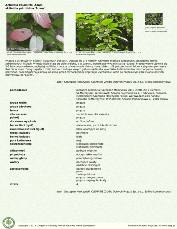 Actinidia kolomikta 'Adam' aktinidia pstrolistna 'Adam' (c) fot. Szczepan Marczyński CLEMATIS Źródło Dobrych Pnączy Sp. z o.o. Spółka komandytowa (c) fot. Szczepan Marczyński CLEMATIS Źródło Dobrych Pnączy Sp. z o.o. Spółka komandytowa (c) fot. Szczepan Marczyński CLEMATIS Źródło Dobrych Pnączy Sp. z o.o. Spółka komandytowa Pnącze o atrakcyjnych liściach i jadalnych owocach. Dorasta do 3-4 metrów. Odmiana męska o ozdobnych, szczególnie ładnie zabarwionych liściach. W maju liście stają się biało-zielone, a w czerwcu dodatkowo wybarwiają się różowo. Przebarwienie ujawnia się 2-3 lata po posadzeniu, najlepiej na liściach dobrze oświetlonych. Kwiaty małe, białe z żółtymi pręcikami, lekko, cytrynowo pachnące. Kwitnie w maju. Dobry zapylacz roślin żeńskich i obupłciowych gatunku Actinidia kolomikta. Roślina bardzo mrozoodporna. Należy przycinać, najlepiej późną jesienią lub zimą (przed rozpoczęciem wegetacji), ewntualnie latem po częściowym zdrewnianiu nowych przyrostów, bo 'płacze'. autor: Szczepan Marczyński, CLEMATIS Źródło Dobrych Pnączy Sp. z o.o. Spółka komandytowa; pochodzenie pierwsza publikacja: Szczepan Marczyński 2001 Oferta 2001 Clematis Sz.Marczyński, W.Piotrowski Szkółka Pojemnikowa s.j.; odkrywca, hodowca (selekcjoner): Szczepan Marczyński Polska; wprowadzenie do handlu: Clematis Sz.Marczyński, W.Piotrowski Szkółka Pojemnikowa s.j. 2001 Polska grupa roślin pnącza grupa użytkowa pnącza forma pnącze siła wzrostu wzrost typowy dla gatunku pokrój pnącze docelowa wysokość od 3 m do 5 m barwa liści (igieł) wielobarwne, pstre lub obrzeżone zimozieloność liści (igieł) liście opadające na zimę rodzaj kwiatów pachnące barwa kwiatów białe pora kwitnienia maj nasłonecznienie stanowisko półcieniste stanowisko słoneczne wilgotność podłoże wilgotne ph podłoża odczyn lekko kwaśny rodzaj gleby przeciętna ogrodowa walory pachnące kwiaty ozdobne z liści/igieł zastosowanie ogrody przydomowe parki zieleń publiczna pnącze na ogrodzenia pnącze na pergole, kraty strefa 4 autor: Szczepan Marczyński, CLEMATIS Źródło Dobrych Pnączy Sp. z o.o. Spółka komandytowa; Copyright © 2013. Związek Szkółkarzy Polskich Wszelkie Prawa Zastrzeżone. Producentów roślin znajdziesz na www.zszp.pl
