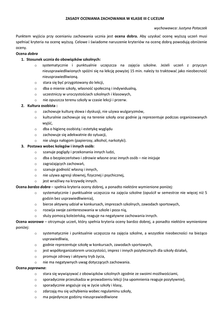 ZASADY OCENIANIA ZACHOWANIA W KLASIE III C LICEUM wychowawca: Justyna Potaczek Punktem wyjścia przy ocenianiu zachowania ucznia jest ocena dobra. Aby uzyskać ocenę wyższą uczeń musi spełniać kryteria na ocenę wyższą. Celowe i świadome naruszenie kryteriów na ocenę dobrą powodują obniżenie oceny. Ocena dobra 1. Stosunek ucznia do obowiązków szkolnych: o systematycznie i punktualnie uczęszcza na zajęcia szkolne. Jeżeli uczeń z przyczyn nieusprawiedliwionych spóźni się na lekcję powyżej 15 min. należy to traktować jako nieobecność nieusprawiedliwioną. o stara się być przygotowany do lekcji, o dba o mienie szkoły, własność społeczną i indywidualną, o uczestniczy w uroczystościach szkolnych i klasowych, o nie opuszcza terenu szkoły w czasie lekcji i przerw. 2. Kultura osobista : o zachowuje kulturę słowa i dyskusji, nie używa wulgaryzmów, o kulturalnie zachowuje się na terenie szkoły oraz godnie ją reprezentuje podczas organizowanych wyjść, o dba o higienę osobistą i estetykę wyglądu o zachowuje się adekwatnie do sytuacji, o nie ulega nałogom (papierosy, alkohol, narkotyki). 3. Postawa wobec kolegów i innych osób: o szanuje poglądy i przekonania innych ludzi, o dba o bezpieczeństwo i zdrowie własne oraz innych osób – nie inicjuje o zagrażających zachowań, o szanuje godność własną i innych, o nie używa agresji słownej, fizycznej i psychicznej, o jest wrażliwy na krzywdę innych. Ocena bardzo dobra – spełnia kryteria oceny dobrej, a ponadto niektóre wymienione poniżej: o systematycznie i punktualnie uczęszcza na zajęcia szkolne (opuścił w semestrze nie więcej niż 5 godzin bez usprawiedliwienia), o bierze aktywny udział w konkursach, imprezach szkolnych, zawodach sportowych, o rozwija swoje zainteresowania w szkole i poza nią, o służy pomocą koleżeńską, reaguje na negatywne zachowania innych. Ocena wzorowa – otrzymuje uczeń, który spełnia kryteria oceny bardzo dobrej, a ponadto niektóre wymienione poniżej: o systematycznie i punktualnie uczęszcza na zajęcia szkolne, a wszystkie nieobecności na bieżąco usprawiedliwia, o godnie reprezentuje szkołę w konkursach, zawodach sportowych, o jest współorganizatorem uroczystości, imprez i innych pożytecznych dla szkoły działań, o promuje zdrowy i aktywny tryb życia, o nie ma negatywnych uwag dotyczących zachowania. Ocena poprawna: o stara się wywiązywać z obowiązków szkolnych zgodnie ze swoimi możliwościami, o sporadycznie przeszkadza w prowadzeniu lekcji (na upomnienia reaguje pozytywnie), o sporadycznie angażuje się w życie szkoły i klasy, o zdarzają mu się uchybienia wobec regulaminu szkoły, o ma pojedyncze godziny nieusprawiedliwione jednocześnie spełnia większość wymagań na ocenę dobrą. Ocena nieodpowiednia: o często przeszkadza w prowadzeniu lekcji, o ulega nałogom, o niszczy mienie społeczne i prywatne, o jest arogancki, wulgarny wobec innych, o niesystematycznie i niepunktualnie uczęszcza na zajęcia szkolne o bywa agresywny, nie przestrzega zasad bezpieczeństwa. Ocena naganna o notorycznie przeszkadza w prowadzeniu lekcji, o notorycznie łamie zasady regulaminów szkolnych, o lekceważy obowiązki szkolne o celowo niszczy mienie społeczne, o posiada, stosuje lub rozprowadza używki, o popada w konflikty z prawem, o swoim zachowaniem zagraża bezpieczeństwu innych (bójki, wymuszenia, groźby itp.). Warunki i tryb uzyskania wyższej niż przewidywana rocznej oceny klasyfikacyjnej zachowania: 1. Na miesiąc przed roczną klasyfikacyjną radą pedagogiczną wychowawca przedstawia propozycję rocznej oceny klasyfikacyjnej zachowania ucznia. 2. W przypadku, gdy uczeń nie zgadza się z przedstawioną oceną ma prawo do jej poprawy. 3. Uczeń występujący o podwyższenie rocznej oceny zachowania w ciągu 2 dni od daty powiadomienia składa pisemny wniosek argumentujący wyższą niż proponowana ocenę zachowania. Wniosek powinien zawierać opinię samorządu uczniowskiego. 4. Decyzję o podwyższeniu lub utrzymaniu oceny podejmuje wychowawca, biorąc pod uwagę: argumenty z wniosku ucznia; opinię samorządu uczniowskiego, rozumianą jako opinię zespołu uczniów danej klasy; opinię zespołu nauczycielskiego, szczególnie nauczycieli uczących w danej klasie oraz pozostałych nauczycieli i pracowników szkoły. o