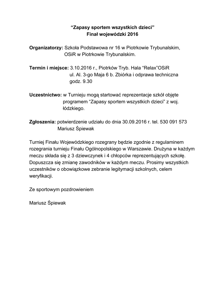 “Zapasy sportem wszystkich dzieci” Finał wojewódzki 2016 Organizatorzy: Szkoła Podstawowa nr 16 w Piotrkowie Trybunalskim, OSiR w Piotrkowie Trybunalskim. Termin i miejsce: 3.10.2016 r., Piotrków Tryb. Hala “Relax”OSiR ul. Al. 3go Maja 6 b. Zbiórka i odprawa techniczna godz. 9.30 Uczestnictwo: w Turnieju mogą startować reprezentacje szkół objęte programem “Zapasy sportem wszystkich dzieci” z woj. łódzkiego. Zgłoszenia: potwierdzenie udziału do dnia 30.09.2016 r. tel. 530 091 573 Mariusz Śpiewak Turniej Finału Wojewódzkiego rozegrany będzie zgodnie z regulaminem rozegrania turnieju Finału Ogólnopolskiego w Warszawie. Drużyna w każdym meczu składa się z 3 dziewczynek i 4 chłopców reprezentujących szkołę. Dopuszcza się zmianę zawodników w każdym meczu. Prosimy wszystkich uczestników o obowiązkowe zebranie legitymacji szkolnych, celem weryfikacji. Ze sportowym pozdrowieniem Mariusz Śpiewak