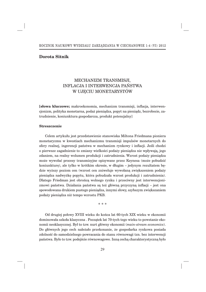 Dorota Sitnik MECHANIZM TRANSMISJI, INFLACJA I