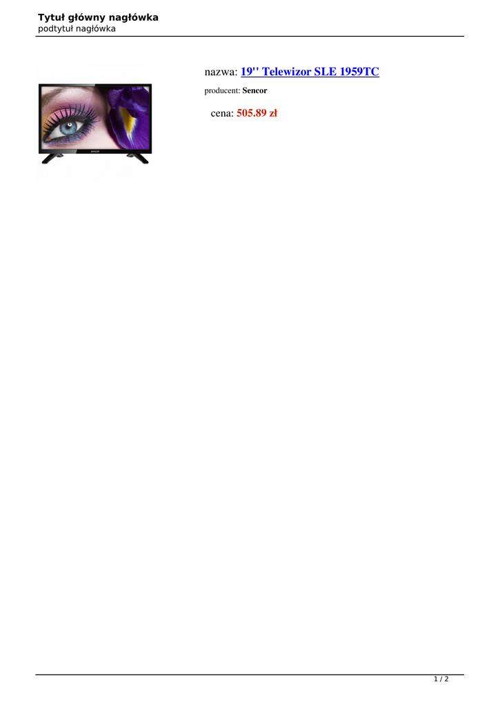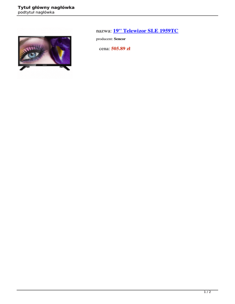 Tytuł główny nagłówka podtytuł nagłówka nazwa: 19'' Telewizor SLE 1959TC producent: Sencor cena: 505.89 zł 1/2 Tytuł główny nagłówka podtytuł nagłówka Przekątna ekranu nazwa 19 cale wartość 2/2