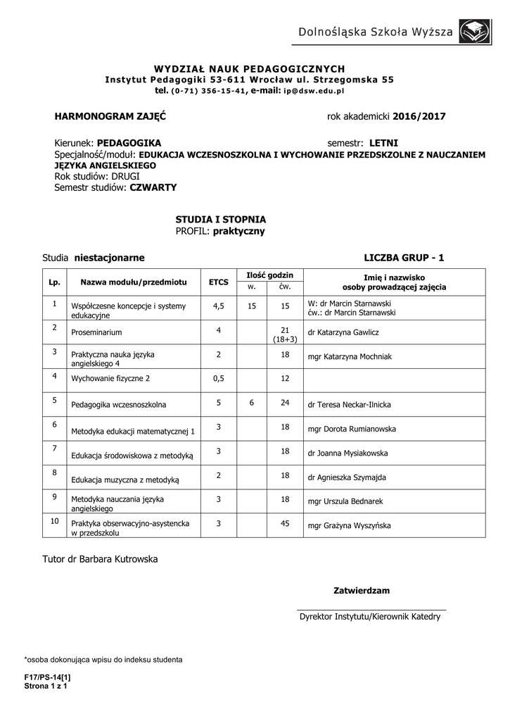 WYDZIAŁ NAUK PEDAGOGICZNYCH HARMONOGRAM ZAJĘĆ rok