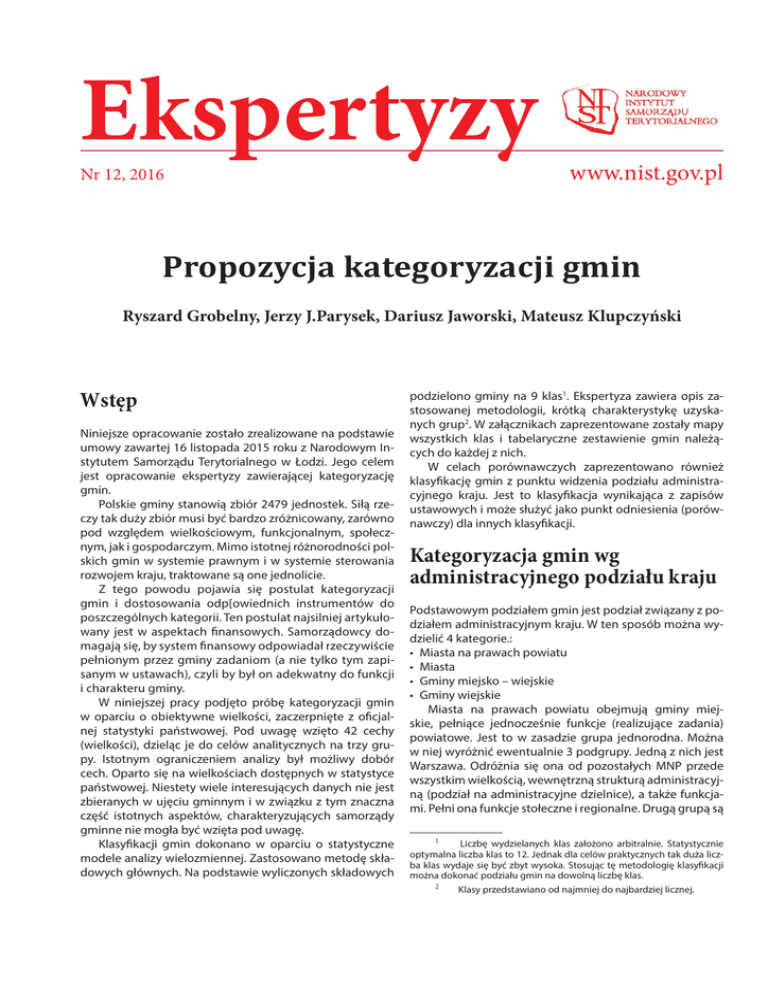 Ekspertyzy Nr 12, 2016 www.nist.gov.pl Propozycja kategoryzacji gmin Ryszard Grobelny, Jerzy J.Parysek, Dariusz Jaworski, Mateusz Klupczyński Wstęp Niniejsze opracowanie zostało zrealizowane na podstawie umowy zawartej 16 listopada 2015 roku z Narodowym Instytutem Samorządu Terytorialnego w Łodzi. Jego celem jest opracowanie ekspertyzy zawierającej kategoryzację gmin. Polskie gminy stanowią zbiór 2479 jednostek. Siłą rzeczy tak duży zbiór musi być bardzo zróżnicowany, zarówno pod względem wielkościowym, funkcjonalnym, społecznym, jak i gospodarczym. Mimo istotnej różnorodności polskich gmin w systemie prawnym i w systemie sterowania rozwojem kraju, traktowane są one jednolicie. Z tego powodu pojawia się postulat kategoryzacji gmin i dostosowania odp[owiednich instrumentów do poszczególnych kategorii. Ten postulat najsilniej artykułowany jest w aspektach finansowych. Samorządowcy domagają się, by system finansowy odpowiadał rzeczywiście pełnionym przez gminy zadaniom (a nie tylko tym zapisanym w ustawach), czyli by był on adekwatny do funkcji i charakteru gminy. W niniejszej pracy podjęto próbę kategoryzacji gmin w oparciu o obiektywne wielkości, zaczerpnięte z oficjalnej statystyki państwowej. Pod uwagę wzięto 42 cechy (wielkości), dzieląc je do celów analitycznych na trzy grupy. Istotnym ograniczeniem analizy był możliwy dobór cech. Oparto się na wielkościach dostępnych w statystyce państwowej. Niestety wiele interesujących danych nie jest zbieranych w ujęciu gminnym i w związku z tym znaczna część istotnych aspektów, charakteryzujących samorządy gminne nie mogła być wzięta pod uwagę. Klasyfikacji gmin dokonano w oparciu o statystyczne modele analizy wielozmiennej. Zastosowano metodę składowych głównych. Na podstawie wyliczonych składowych podzielono gminy na 9 klas1. Ekspertyza zawiera opis zastosowanej metodologii, krótką charakterystykę uzyskanych grup2. W załącznikach zaprezentowane zostały mapy wszystkich klas i tabelaryczne zestawienie gmin należących do każdej z nich. W celach porównawczych zaprezentowano również klasyfikację gmin z punktu widzenia podziału administracyjnego kraju. Jest to klasyfikacja wynikająca z zapisów ustawowych i może służyć jako punkt odniesienia (porównawczy) dla innych klasyfikacji. Kategoryzacja gmin wg administracyjnego podziału kraju Podstawowym podziałem gmin jest podział związany z podziałem administracyjnym kraju. W ten sposób można wydzielić 4 kategorie.: • Miasta na prawach powiatu • Miasta • Gminy miejsko – wiejskie • Gminy wiejskie Miasta na prawach powiatu obejmują gminy miejskie, pełniące jednocześnie funkcje (realizujące zadania) powiatowe. Jest to w zasadzie grupa jednorodna. Można w niej wyróżnić ewentualnie 3 podgrupy. Jedną z nich jest Warszawa. Odróżnia się ona od pozostałych MNP przede wszystkim wielkością, wewnętrzną strukturą administracyjną (podział na administracyjne dzielnice), a także funkcjami. Pełni ona funkcje stołeczne i regionalne. Drugą grupą są 1 Liczbę wydzielanych klas założono arbitralnie. Statystycznie optymalna liczba klas to 12. Jednak dla celów praktycznych tak duża liczba klas wydaje się być zbyt wysoka. Stosując tę metodologię klasyfikacji można dokonać podziału gmin na dowolną liczbę klas. 2 Klasy przedstawiano od najmniej do najbardziej licznej. EKSPERTYZY Nr 12, 2016 pozostałe stolice regionów. Należą one do grupy większych miast, pełniących funkcje regionalne. Są to Kraków, Łódź, Wrocław, Poznań, Gdańsk, Szczecin, Katowice, Lublin, Rzeszów, Białystok, Olsztyn, Kielce i Opole, a także Bydgoszcz i Toruń oraz Gorzów Wlkp. i Zielona Góra (4 ostatnie funkcje regionalne pełnią łącznie). Trzecią grupę tworzą pozostałe miasta na prawach powiatów. Miasta stanowią również stosunkowo jednolitą kategorię. Co najwyżej można wśród nich wydzielić te, które są siedzibami powiatów ziemskich. Gminy miejsko – wiejskie obejmują obszar miasta i otaczającej jej gminy. Gminy wiejskie obejmują obszar wiejski, czasami otaczający pobliskie miasto, a czasami odrębny. Niestety podział na gminy miejskie, miejsko-wiejskie i wiejskie jest dość przypadkowy i ma charakter przede wszystkim historyczny. Bardzo często ten podział nie ma uzasadnienia ani funkcjonalnego, ani społecznego, ani gospodarczego. Przy tym zarówno gminy miejskie, miejsko – wiejskie, co prawda mało zróżnicowane pod względem pełnionych funkcji w administracyjnym podziale kraju, to jednak bardzo zróżnicowane pod względem społeczno-gospodarczym, a zatem i rzeczywistych zadań, realizowanych na ich obszarze. Zastosowany model analizy składowych głównych Wprowadzenie Otaczająca nas rzeczywistość jest coraz bardziej złożona, zarówno w przekroju tworzących ją elementów, jak i utworzonych z tych elementów całości. Z tych też powodów, dokładne poznanie organizacji, struktury i funkcjonowania tej rzeczywistości nie jest możliwe bez przyjęcia odpowiedniego podejścia badawczego oraz zastosowania właściwych metod analizy. Najbardziej aktualnie wiarygodnych podejść metodycznych do rozwiązania złożonych problemów wraz z metodami analizy ilościowej dostarcza współczesna statystyka, zwłaszcza zaś metody statystyki wielozmiennej (wielocechowej, wielowymiarowej). Szczególna przydatność tych metod dotyczy sytuacji, kiedy w prowadzonych badaniach chodzi właśnie o uchwycenie wspominanej złożoności. Takim niewątpliwie złożonym układem analitycznym jest zawsze zbiór jednostek terytorialnego podziału kraju, utworzony przez wielopłaszczyznowo zróżnicowane obiekty, najbardziej zróżnicowane w wymiarze podstawowych jednostek terytorialnego podziału kraju tj. gmin, 2 a najmniej w przekrojach wojewódzkich. W zasadzie każda jednostka terytorialnego podziału kraju przedstawia charakterystyczne tylko dla siebie właściwości i jest 