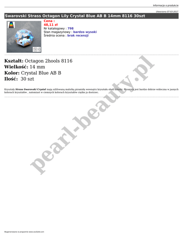 Informacje o produkcie Utworzono 07-03-2017 Swarovski Strass Octagon Lily Crystal Blue AB B 14mm 8116 30szt Cena : 48,11 zł Nr katalogowy : 798 Stan magazynowy : bardzo wysoki Średnia ocena : brak recenzji ty . pl Kształt: Octagon 2hools 8116 Wielkość: 14 mm Kolor: Crystal Blue AB B Ilość: 30 szt pe ar lbe au Kryształy Strass Swarovski Crystal mają szlifowaną malutką piramidę wewnątrz kryształu obok dziurki. Piramida jest bardzo dobrze widoczna w jasnych kolorach kryształów , natomiast w ciemnych kolorach kryształów ciężko ja dostrzec. Wygenerowano w programie www.oscGold.com
