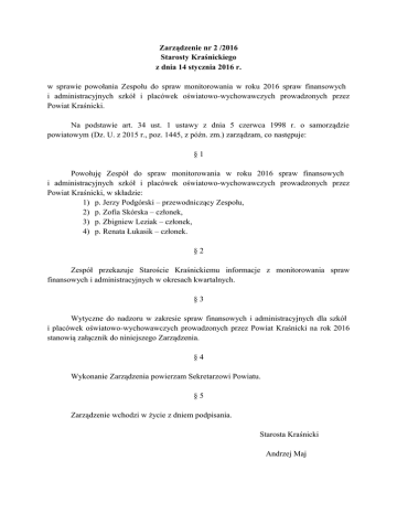 Zarządzenie nr 2 /2016 Starosty Kraśnickiego z dnia 14 stycznia