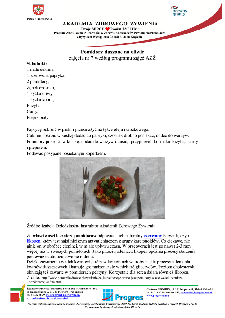 Powiat Piotrkowski AKADEMIA ZDROWEGO ŻYWIENIA „Twoje SERCE Twoim ŻYCIEM” Program Zmniejszenia Nierówności w Zdrowiu Mieszkańców Powiatu Piotrkowskiego z Ryzykiem Wystąpienia Chorób Układu Krążenia Pomidory duszone na oliwie zajęcia nr 7 według programu zajęć AZŻ Składniki: 1 mała cukinia, 1 czerwona papryka, 2 pomidory, Ząbek czosnku, 1 łyżka oliwy, 1 łyżka kopru, Bazylia, Curry, Pieprz biały. Paprykę pokroić w paski i przesmażyć na łyżce oleju rzepakowego. Cukinię pokroić w kostkę dodać do papryki, czosnek drobno posiekać, dodać do warzyw. Pomidory pokroić w kostkę, dodać do warzyw i dusić, przyprawić do smaku bazylią, curry i pieprzem. Podawać posypane posiekanym koperkiem. Źródło: Izabela Dziedzińska- instruktor Akademii Zdrowego Żywienia Za właściwości lecznicze pomidorów odpowiada ich naturalny czerwony barwnik, czyli likopen, który jest najsilniejszym antyutleniaczem z grupy karetonoidów. Co ciekawe, nie ginie on w obróbce cieplnej, w miarę upływu czasu. W przetworach jest go nawet 2-3 razy więcej niż w świeżych pomidorach. Jako przeciwutleniacz likopen opóźnia procesy starzenia, ponieważ neutralizuje wolne rodniki. Dzięki zawartemu w nich kwasowi, który w komórkach wątroby nasila procesy utleniania kwasów tłuszczowych i hamuje gromadzenie się w nich trójglicerydów. Poziom cholesterolu obniżają też zawarte w pomidorach pektyny. Korzystnie dla serca działa również likopen. Źródło: http://www.poradnikzdrowie.pl/zywienie/co-jesz/dlaczego-warto-jesc-pomidory-wlasciwosci-leczniczepomidorow_41894.html Realizator Projektu: Starostwo Powiatowe w Piotrkowie Tryb., ul. Dąbrowskiego 7, 97-300 Piotrków Trybunalski tel. 44 732 88 29, [email protected], www.zdrowie.powiat-piotrkowski.pl Centrum PROGRES, ul. 11 Listopada 41, 95-040 Koluszki tel. 44 714 67 90, 693 166 450, [email protected], www.progres.atm.pl Program jest współfinansowany ze środków Norweskiego Mechanizmu Finansowego 2009-2014 oraz środków budżetu państwa w ramach Programu PL 13 Ograniczanie Społecznych Nierówności w Zdrowiu