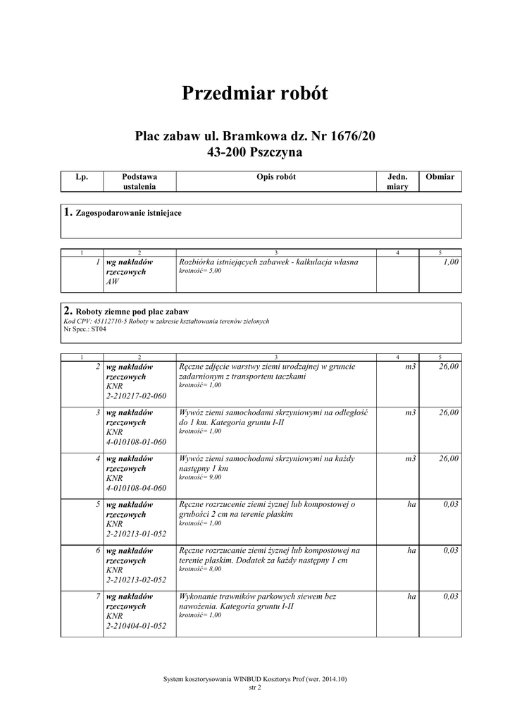 Przedmiar robót Plac zabaw ul. Bramkowa dz. Nr 1676/20 43-200 Pszczyna Lp. Podstawa ustalenia Opis robót Jedn. miary Obmiar 3 4 5 1. Zagospodarowanie istniejace 1 2 1 wg nakładów rzeczowych AW Rozbiórka istniejących zabawek - kalkulacja własna 1,00 krotność= 5,00 2. Roboty ziemne pod plac zabaw Kod CPV: 45112710-5 Roboty w zakresie kształtowania terenów zielonych Nr Spec.: ST04 1 2 3 2 wg nakładów rzeczowych KNR 2-210217-02-060 Ręczne zdjęcie warstwy ziemi urodzajnej w gruncie zadarnionym z transportem taczkami 3 wg nakładów rzeczowych KNR 4-010108-01-060 Wywóz ziemi samochodami skrzyniowymi na odległość do 1 km. Kategoria gruntu I-II 4 wg nakładów rzeczowych KNR 4-010108-04-060 Wywóz ziemi samochodami skrzyniowymi na każdy następny 1 km 5 wg nakładów rzeczowych KNR 2-210213-01-052 Ręczne rozrzucenie ziemi żyznej lub kompostowej o grubości 2 cm na terenie płaskim 6 wg nakładów rzeczowych KNR 2-210213-02-052 Ręczne rozrzucanie ziemi żyznej lub kompostowej na terenie płaskim. Dodatek za każdy następny 1 cm 7 wg nakładów rzeczowych KNR 2-210404-01-052 Wykonanie trawników parkowych siewem bez nawożenia. Kategoria gruntu I-II 4 5 m3 26,00 m3 26,00 m3 26,00 ha 0,03 ha 0,03 ha 0,03 krotność= 1,00 krotność= 1,00 krotność= 9,00 krotność= 1,00 krotność= 8,00 krotność= 1,00 System kosztorysowania WINBUD Kosztorys Prof (wer. 2014.10) str 2 3. Urządzenia zabawowe Kod CPV: 37535200-9 Wyposażenie placów zabaw Nr Spec.: ST03 1 2 3 8 wg nakładów rzeczowych kalkulacja własna-020 9 wg nakładów rzeczowych kalkulacja własna-020 10 wg nakładów rzeczowych kalkulacja własna-020 11 wg nakładów rzeczowych kalkulacja własna-020 12 wg nakładów rzeczowych kalkulacja własna-020 13 wg nakładów rzeczowych kalkulacja własna-020 14 wg nakładów rzeczowych kalkulacja własna-020 4 Zestaw zabawowy LM 002- montaż 5 szt 1,00 szt 1,00 szt 1,00 szt 1,00 szt 1,00 szt 1,00 szt 1,00 krotność= 1,00 Piaskownica- montaż krotność= 1,00 Huśtawka poczwórna K 008- montaż krotność= 1,00 Huśtawka ważka K103- montaż krotność= 1,00 Huśtawka na sprężynie- montaż krotność= 1,00 Montaż tablicy z regulaminem- montaż krotność= 1,00 Montaż ławki-montaż krotność= 1,00 4. Nawierzchnia Kod CPV: 45233000-9 Roboty w zakresie konstruowania, fundamentowania oraz wykonywania nawierzchni autostrad, dróg Nr Spec.: ST02 1 2 3 15 wg nakładów rzeczowych kalkulacja wlasna Montaż nawierzchni bezpiecznej Poly Easi krotność= 1,00 System kosztorysowania WINBUD Kosztorys Prof (wer. 2014.10) str 3 4 5 190,00