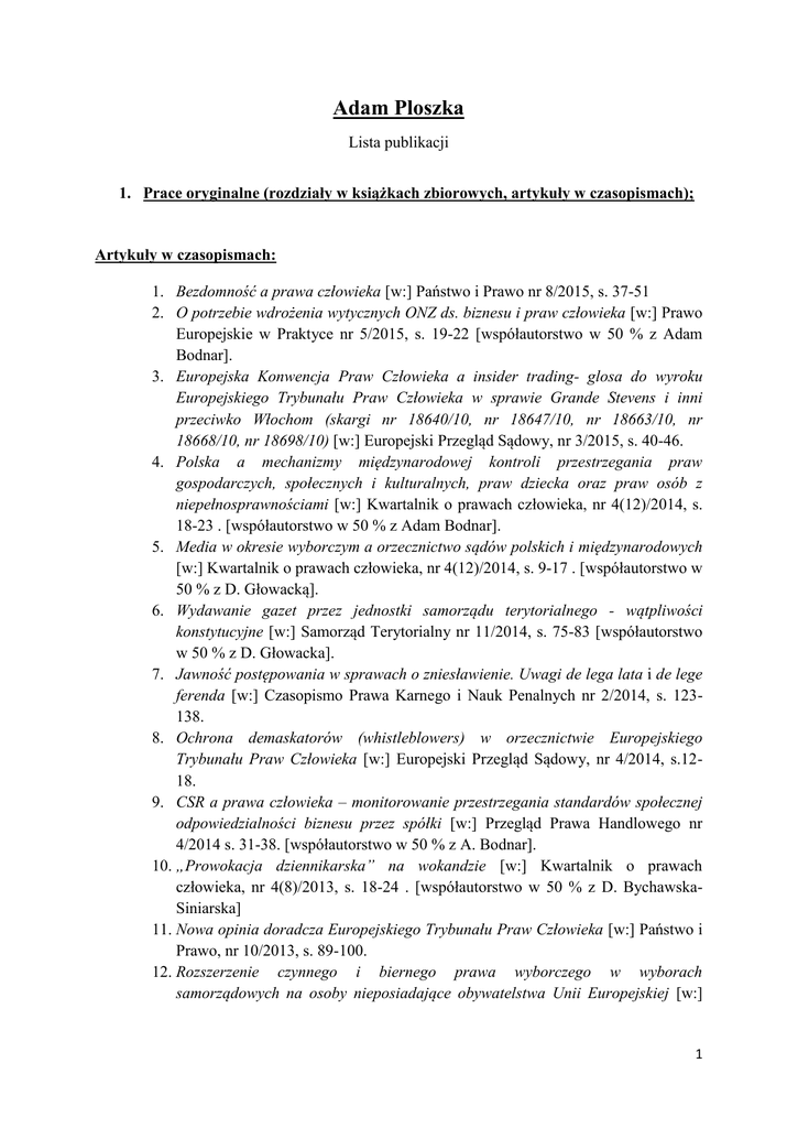 Adam Ploszka Lista publikacji 1. Prace oryginalne (rozdziały w książkach zbiorowych, artykuły w czasopismach); Artykuły w czasopismach: 1. Bezdomność a prawa człowieka [w:] Państwo i Prawo nr 8/2015, s. 37-51 2. O potrzebie wdrożenia wytycznych ONZ ds. biznesu i praw człowieka [w:] Prawo Europejskie w Praktyce nr 5/2015, s. 19-22 [współautorstwo w 50 % z Adam Bodnar]. 3. Europejska Konwencja Praw Człowieka a insider trading- glosa do wyroku Europejskiego Trybunału Praw Człowieka w sprawie Grande Stevens i inni przeciwko Włochom (skargi nr 18640/10, nr 18647/10, nr 18663/10, nr 18668/10, nr 18698/10) [w:] Europejski Przegląd Sądowy, nr 3/2015, s. 40-46. 4. Polska a mechanizmy międzynarodowej kontroli przestrzegania praw gospodarczych, społecznych i kulturalnych, praw dziecka oraz praw osób z niepełnosprawnościami [w:] Kwartalnik o prawach człowieka, nr 4(12)/2014, s. 18-23 . [współautorstwo w 50 % z Adam Bodnar]. 5. Media w okresie wyborczym a orzecznictwo sądów polskich i międzynarodowych [w:] Kwartalnik o prawach człowieka, nr 4(12)/2014, s. 9-17 . [współautorstwo w 50 % z D. Głowacką]. 6. Wydawanie gazet przez jednostki samorządu terytorialnego - wątpliwości konstytucyjne [w:] Samorząd Terytorialny nr 11/2014, s. 75-83 [współautorstwo w 50 % z D. Głowacka]. 7. Jawność postępowania w sprawach o zniesławienie. Uwagi de lega lata i de lege ferenda [w:] Czasopismo Prawa Karnego i Nauk Penalnych nr 2/2014, s. 123138. 8. Ochrona demaskatorów (whistleblowers) w orzecznictwie Europejskiego Trybunału Praw Człowieka [w:] Europejski Przegląd Sądowy, nr 4/2014, s.1218. 9. CSR a prawa człowieka – monitorowanie przestrzegania standardów społecznej odpowiedzialności biznesu przez spółki [w:] Przegląd Prawa Handlowego nr 4/2014 s. 31-38. [współautorstwo w 50 % z A. Bodnar]. 10. „Prowokacja dziennikarska” na wokandzie [w:] Kwartalnik o prawach człowieka, nr 4(8)/2013, s. 18-24 . [współautorstwo w 50 % z D. BychawskaSiniarska] 11. Nowa opinia doradcza Europejskiego Trybunału Praw Człowieka [w:] Państwo i Prawo, nr 10/2013, s. 89-100. 12. Rozszerzenie czynnego i biernego prawa wyborczego w wyborach samorządowych na osoby nieposiadające obywatelstwa Unii Europejskiej [w:] 1 Samorząd Terytorialny, nr 9/2013, s.66-74. [współautorstwo w 50 % z A. Bodnar] 13. Wpływ Europejskiej Konwencji Praw Człowieka na postępowanie polubowne (arbitraż) [w:] ADR Arbitraż i Mediacja, nr 3(23)/2013, s.5-20. [współautorstwo w 50 % z A. Bodnar] 14. Koniec strasburskiego mechanizmu skargi międzypaństwowej? [w:] Studia Europejskie nr 2 (66)/2013, s.171-184. 15. „Życie rodzinne” w prawie polskim. Czym jest, a czym nie jest? [w:] Przegląd Prawniczy Uniwersytetu Warszawskiego nr 1-2, rok XII, Warszawa 2013, s. 129143. 16. Zakaz tortur. Czy na pewno bezwzględny? [w:] Przegląd Prawniczy Uniwersytetu Warszawskiego nr 1-2, rok XI, Warszawa 2012, s. 123-139. Rozdziały w książkach zbiorowych: 1. Udostępnianie adresów IP przez wydawców prasy w internecie. Uwagi na tle orzecznictwa sądów polskich [w:] D. Bychawska - Siniarska, D. Głowacka (red.) Wirtualne Media-Realne Problemy, Warszawa 2014, s. 128-138 2. Wolność artystyczna vs swoboda sumienia i wyznania. O sądowym ważeniu wartości konstytucyjnych na przykładzie sprawy Doroty Nieznalskiej [w:] D. Bychawska - Siniarska, D. Głowacka (red.) Swoboda wypowiedzi w działalności artystycznej, Warszawa 2014, s. 111-124 3. Zniesławienie w prasie lokalnej na kanwie sprawy „Kuriera Słupeckiego” [w:] D. Bychawska - Siniarska, D. Głowacka (red.) Media lokalne i regionalne – nierozwiązane problemy, nowe wyzwania, Warszawa 2013, s. 82-100 [współautorstwo w 50 % z Dorotą Głowacką] 4. Platforma blogerska metodą monitoringu zagrożeń dla wolności słowa na poziomie lokalnym [w:] D. Bychawska - Siniarska, D. Głowacka (red.) Media lokalne i regionalne – nierozwiązane problemy, nowe wyzwania, Warszawa 2013, s. 147-153. 5. Zrównoważony rozwój w orzecznictwie Trybunału Konstytucyjnego [w:] T. Jemczura, H. Kretek, (red.) Zrównoważony rozwój - debiut naukowy 2011, Racibórz 2012, s. 33 – 40. 6. Reforma mechanizmu kontrolnego Europejskiej Konwencji Praw Człowieka, [w:] Marcin Grabowski (red.) Stosunki międzynarodowe we współczesnym świecie regiony i problemy, Kraków 2011, s.136-156. 7. Koncepcja marginesu oceny w orzecznictwie Europejskiego Trybunału Praw Człowieka – zarys problematyki [w:] A. Garnuszek, P Sosnowski (red.), Rola Trybunałów i Doktryny w Prawie Międzynarodowym, Warszawa 2010, s. 336353. 8. Zrównoważony rozwój a prawa człowieka [w:] H. Kretek, T. Jemczura (red.): Zrównoważony rozwój – debiut naukowy 2010, Racibórz 2011, s.16-24. 2 9. Instrument skargi międzypaństwowej, a ochrona praw człowieka w systemie Europejskiej Konwencji Praw Człowieka, [w:] S. Zaręba (red.), Odpowiedzialność w prawie międzynarodowym, Warszawa 2011, s.137-152 10. Prawo antynarkotykowe a system praw człowieka. Perspektywa Europejskiego Trybunału Praw Człowieka, [w:] W. Wesołowski (red.), Prawo i polityka narkotykowa. Zarys problemu ze szczególnym uwzględnieniem międzynarodowego systemu ochrony praw człowieka, Warszawa 2009, s. 131151. 2. Prace przeglądowe (raporty, suplementy, recenzje naukowe, opracowania źródłowe); 1. Recenzja: Tom Bingham: The Rule of Law. [w:] Państwo i Prawo, nr 2/2013, s. 114-115. 2. Sprawozdanie: Bilingi kontrolowane – Obywatel dziennikarz w sporze z CBA [w:] Kwartalnik o prawach człowieka, nr 3(7)/2013, s. 39-40 3. Sprawozdanie: Gdzie leżą granice swobody artystycznej? [w:] Kwartalnik o prawach człowieka, nr 1(9)/2014, s. 47-49 4. Sprawozdanie: Wolność słowa współcześnie [w:] Kwartalnik o prawach człowieka, nr 2(10)/2014, s. 47-49 5. Sprawozdanie z ogólnopolskiej konferencji naukowej "20 lat ochrony praw obywatelek i obywateli Unii Europejskiej: osiągnięcia i wyzwania na przyszłość" (Poznań, 23 X 2013)