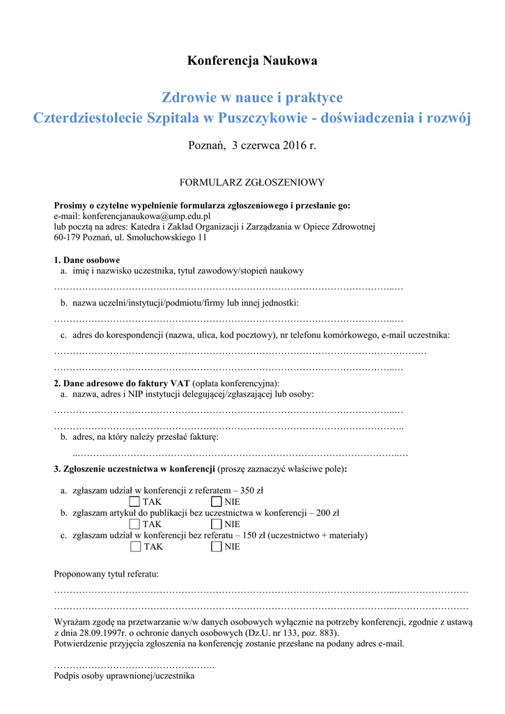 Konferencja Naukowa Zdrowie w nauce i praktyce Czterdziestolecie Szpitala w Puszczykowie - doświadczenia i rozwój Poznań, 3 czerwca 2016 r. FORMULARZ ZGŁOSZENIOWY Prosimy o czytelne wypełnienie formularza zgłoszeniowego i przesłanie go: e-mail: [email protected] lub pocztą na adres: Katedra i Zakład Organizacji i Zarządzania w Opiece Zdrowotnej 60-179 Poznań, ul. Smoluchowskiego 11 1. Dane osobowe a. imię i nazwisko uczestnika, tytuł zawodowy/stopień naukowy ………………………………………………………………………………………………..… b. nazwa uczelni/instytucji/podmiotu/firmy lub innej jednostki: ………………………………………………………………………………………………..… c. adres do korespondencji (nazwa, ulica, kod pocztowy), nr telefonu komórkowego, e-mail uczestnika: ………………………………………………………………………………………………………… ………………………………………………………………………………………………..… 2. Dane adresowe do faktury VAT (opłata konferencyjna): a. nazwa, adres i NIP instytucji delegującej/zgłaszającej lub osoby: ………………………………………………………………………………………………..… ………………………………………………………………………………………………….. b. adres, na który należy przesłać fakturę: ..…………………………………………………………………………………………..… 3. Zgłoszenie uczestnictwa w konferencji (proszę zaznaczyć właściwe pole): a. zgłaszam udział w konferencji z referatem – 350 zł TAK NIE b. zgłaszam artykuł do publikacji bez uczestnictwa w konferencji – 200 zł TAK NIE c. zgłaszam udział w konferencji bez referatu – 150 zł (uczestnictwo + materiały) TAK NIE Proponowany tytuł referatu: ………………………………………………………………………………………………..…………………… ………………………………………………………………………………………………..…………………… Wyrażam zgodę na przetwarzanie w/w danych osobowych wyłącznie na potrzeby konferencji, zgodnie z ustawą z dnia 28.09.1997r. o ochronie danych osobowych (Dz.U. nr 133, poz. 883). Potwierdzenie przyjęcia zgłoszenia na konferencję zostanie przesłane na podany adres e-mail. ……………………………………………. Podpis osoby uprawnionej/uczestnika