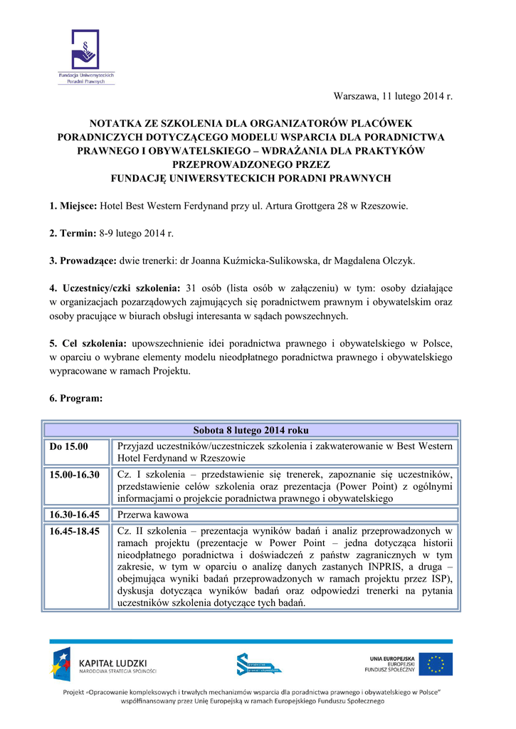 Warszawa, 11 lutego 2014 r. NOTATKA ZE SZKOLENIA DLA ORGANIZATORÓW PLACÓWEK PORADNICZYCH DOTYCZĄCEGO MODELU WSPARCIA DLA PORADNICTWA PRAWNEGO I OBYWATELSKIEGO – WDRAŻANIA DLA PRAKTYKÓW PRZEPROWADZONEGO PRZEZ FUNDACJĘ UNIWERSYTECKICH PORADNI PRAWNYCH 1. Miejsce: Hotel Best Western Ferdynand przy ul. Artura Grottgera 28 w Rzeszowie. 2. Termin: 8-9 lutego 2014 r. 3. Prowadzące: dwie trenerki: dr Joanna Kuźmicka-Sulikowska, dr Magdalena Olczyk. 4. Uczestnicy/czki szkolenia: 31 osób (lista osób w załączeniu) w tym: osoby działające w organizacjach pozarządowych zajmujących się poradnictwem prawnym i obywatelskim oraz osoby pracujące w biurach obsługi interesanta w sądach powszechnych. 5. Cel szkolenia: upowszechnienie idei poradnictwa prawnego i obywatelskiego w Polsce, w oparciu o wybrane elementy modelu nieodpłatnego poradnictwa prawnego i obywatelskiego wypracowane w ramach Projektu. 6. Program: Sobota 8 lutego 2014 roku Do 15.00 Przyjazd uczestników/uczestniczek szkolenia i zakwaterowanie w Best Western Hotel Ferdynand w Rzeszowie 15.00-16.30 Cz. I szkolenia – przedstawienie się trenerek, zapoznanie się uczestników, przedstawienie celów szkolenia oraz prezentacja (Power Point) z ogólnymi informacjami o projekcie poradnictwa prawnego i obywatelskiego 16.30-16.45 Przerwa kawowa 16.45-18.45 Cz. II szkolenia – prezentacja wyników badań i analiz przeprowadzonych w ramach projektu (prezentacje w Power Point – jedna dotycząca historii nieodpłatnego poradnictwa i doświadczeń z państw zagranicznych w tym zakresie, w tym w oparciu o analizę danych zastanych INPRIS, a druga – obejmująca wyniki badań przeprowadzonych w ramach projektu przez ISP), dyskusja dotycząca wyników badań oraz odpowiedzi trenerki na pytania uczestników szkolenia dotyczące tych badań. 19.00-20.00 Kolacja w restauracji Best Western Hotel Ferdynand Niedziela 9 lutego 2014 roku 8.00 – 9.00 Śniadanie w Best Western Hotel Ferdynand 9.00 – 11.00 Cz. III szkolenia – Blok I Beneficjenci – tu m.in. prezentacja modelu w części dotyczącej beneficjentów (prezentacja Power Point), następnie „burza mózgów” – jak profil beneficjenta wpływa/powinien wpływać na organizację punktu poradniczego?; dyskusja. Blok II – Usługodawcy – prezentacja obejmująca odpowiednią część modelu, dyskusja. 11.00 – 11.15 przerwa kawowa 11.15 – 13.15 Cz. IV szkolenia – warunki konieczne do funkcjonowania punktu poradniczego w ramach proponowanego modelu, standardy działania punktów poradniczych; tu m.in. ćwiczenia interaktywne – praca w grupach na koncepcją czy spełniam/co muszę zrobić by się dostosować do poszczególnych standardów, opracowanie przez uczestników plakatów z wykorzystaniem wycinanek z prasy i prezentacja prac przez przedstawicieli poszczególnych grup; na tym tle dyskusja nad poszczególnymi standardami. 13.15 – 14.30 Obiad w restauracji Best Western Hotel Ferdynand 14.30 – 16.30 Cz. V szkolenia – tu przede wszystkim: analiza problematyki najczęstszych problemów spotykanych w trakcie prowadzenia punktów poradniczych, praca uczestników w grupach na podanych kazusach, następnie omówienie wyników tych prac przy komentarzach trenerki i pozostałych uczestników; prezentacja mapy poradnictwa i poradnika do niej, dyskusja na temat wagi rozpowszechniania informacji na temat punktów poradniczych. 16.30 – 18.00 Podsumowanie poszczególnych części szkolenia i jego całego, wypełnienie ankiet ewaluacyjnych przez uczestników, zakończenie szkolenia, pożegnanie. 7. Ważniejsze pytania, głosy w dyskusji, wnioski i rekomendacje: Podczas pierwszego dnia szkolenia jego uczestnicy i uczestniczki zapoznani zostali z ogólną ideą poradnictwa prawnego, jego historią, a także założeniami szkolenia oraz wynikami badań w kwestii doświadczeń respondentów na rynku usług prawnych. Następnie uczestnicy i uczestniczki przedstawili swoje oczekiwania w stosunku do szkolenia. Oprócz zapoznania się z kwestiami dotyczącymi modelu, w tym dostępu dla podmiotów świadczących pomoc do proponowanego systemu, uczestnicy i uczestniczki oczekiwali także przedstawienia standardów w zakresie udzielanych porad. Drugi dzień szkolenia rozpoczął się od przedstawienia proponowanych koncepcji poszczególnych partnerów w kwestii dostępu do porad i informacji prawnych i obywatelskich, jak też organizacji systemu i kryteriów dostępu do niego przez podmioty świadczące pomoc prawną. Uczestnicy i uczestniczki badali czy podmioty, które reprezentują, spełniają poszczególne z kryteriów. W dalszej części szkolenia przedstawiono założenia dotyczące standaryzacji świadczonych usług. Każda z grup opracowała zestaw standardów i następnie omówione zostały z odniesieniem się do doświadczeń członków i członkiń poszczególnych grup. W końcowej części, po prezentacji najczęściej spotykanych przypadków w pracy klinicznej, uczestnicy i uczestniczki szkolenia dyskutowali nad możliwościami ich rozwiązań oraz konfrontowali je ze swoimi doświadczeniami. Na koniec przedstawiono mapę poradnictwa prawnego oraz podręcznik. Szkolenie zakończyło się po podsumowaniu jego wyników. Warto zauważyć, że podczas szkolenia w Rzeszowie, szczególnym zainteresowanie cieszyło się zagadnienie weryfikacji oświadczeń beneficjentów i postępowanie, w ramach którego będzie oceniana prawdziwość oświadczeń. Wskazywano także na możliwości kilkukrotnego korzystania przez beneficjentów z usług podmiotów świadczących porady w sytuacji odmowy przez usługodawcę, do którego udał się beneficjent. Oprac. Dr Magdalena Olczyk, trenerka, FUPP