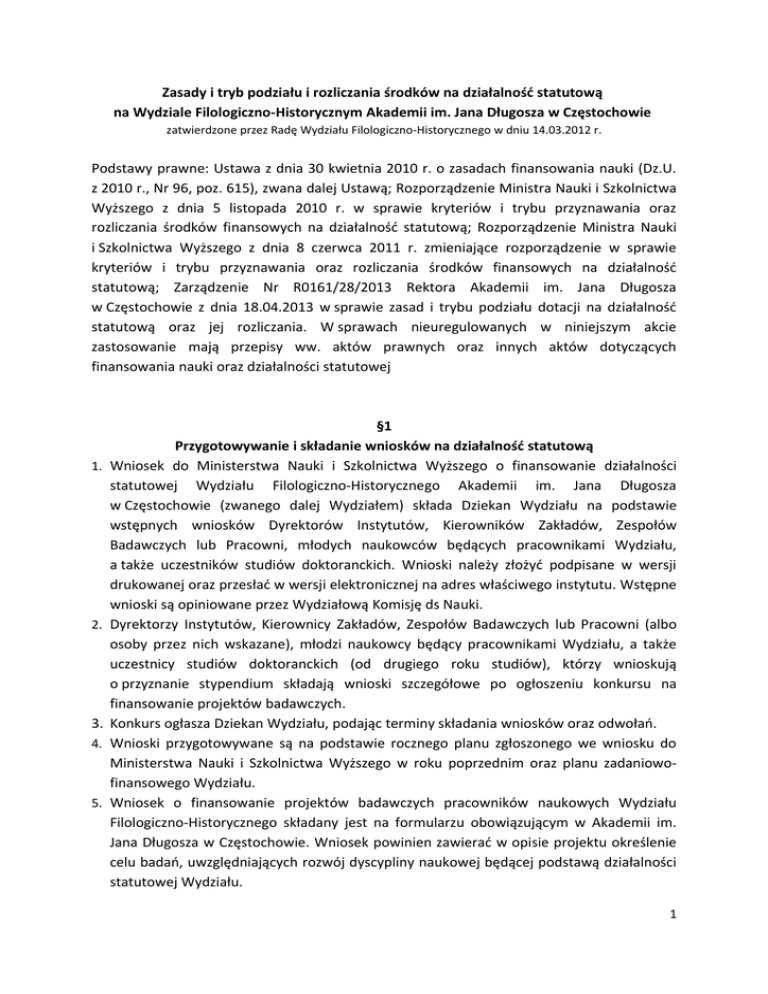 Zasady i tryb podziału i rozliczania środków na działalność statutową na Wydziale Filologiczno-Historycznym Akademii im. Jana Długosza w Częstochowie zatwierdzone przez Radę Wydziału Filologiczno-Historycznego w dniu 14.03.2012 r. Podstawy prawne: Ustawa z dnia 30 kwietnia 2010 r. o zasadach finansowania nauki (Dz.U. z 2010 r., Nr 96, poz. 615), zwana dalej Ustawą; Rozporządzenie Ministra Nauki i Szkolnictwa Wyższego z dnia 5 listopada 2010 r. w sprawie kryteriów i trybu przyznawania oraz rozliczania środków finansowych na działalność statutową; Rozporządzenie Ministra Nauki i Szkolnictwa Wyższego z dnia 8 czerwca 2011 r. zmieniające rozporządzenie w sprawie kryteriów i trybu przyznawania oraz rozliczania środków finansowych na działalność statutową; Zarządzenie Nr R0161/28/2013 Rektora Akademii im. Jana Długosza w Częstochowie z dnia 18.04.2013 w sprawie zasad i trybu podziału dotacji na działalność statutową oraz jej rozliczania. W sprawach nieuregulowanych w niniejszym akcie zastosowanie mają przepisy ww. aktów prawnych oraz innych aktów dotyczących finansowania nauki oraz działalności statutowej 1. 2. 3. 4. 5. §1 Przygotowywanie i składanie wniosków na działalność statutową Wniosek do Ministerstwa Nauki i Szkolnictwa Wyższego o finansowanie działalności statutowej Wydziału Filologiczno-Historycznego Akademii im. Jana Długosza w Częstochowie (zwanego dalej Wydziałem) składa Dziekan Wydziału na podstawie wstępnych wniosków Dyrektorów Instytutów, Kierowników Zakładów, Zespołów Badawczych lub Pracowni, młodych naukowców będących pracownikami Wydziału, a także uczestników studiów doktoranckich. Wnioski należy złożyć podpisane w wersji drukowanej oraz przesłać w wersji elektronicznej na adres właściwego instytutu. Wstępne wnioski są opiniowane przez Wydziałową Komisję ds Nauki. Dyrektorzy Instytutów, Kierownicy Zakładów, Zespołów Badawczych lub Pracowni (albo osoby przez nich wskazane), młodzi naukowcy będący pracownikami Wydziału, a także uczestnicy studiów doktoranckich (od drugiego roku studiów), którzy wnioskują o przyznanie stypendium składają wnioski szczegółowe po ogłoszeniu konkursu na finansowanie projektów badawczych. Konkurs ogłasza Dziekan Wydziału, podając terminy składania wniosków oraz odwołań. Wnioski przygotowywane są na podstawie rocznego planu zgłoszonego we wniosku do Ministerstwa Nauki i Szkolnictwa Wyższego w roku poprzednim oraz planu zadaniowofinansowego Wydziału. Wniosek o finansowanie projektów badawczych pracowników naukowych Wydziału Filologiczno-Historycznego składany jest na formularzu obowiązującym w Akademii im. Jana Długosza w Częstochowie. Wniosek powinien zawierać w opisie projektu określenie celu badań, uwzględniających rozwój dyscypliny naukowej będącej podstawą działalności statutowej Wydziału. 1 6. Wniosek o finansowanie prac badawczych służących rozwojowi młodych naukowców składany jest na formularzu obowiązującym w Akademii im. Jana Długosza w Częstochowie. Wniosek powinien zawierać określenie celu prac badawczych służących rozwojowi młodego naukowca. Do wniosku powinny zostać dołączone załączniki zgodne z kryteriami określonymi w § 2 punkt 7. 7. Wniosek o udzielenie stypendium dla uczestników studiów doktoranckich składany jest na formularzu obowiązującym w Akademii im. Jana Długosza w Częstochowie. Do wniosku powinny zostać dołączone załączniki zgodne z kryteriami określonymi w § 2 punkt 8. Stypendium ma charakter jednorazowy lub jest wypłacane co miesiąc w okresie nie dłuższym niż 12 miesięcy. 8. Dyrektor Instytutu opiniuje wnioski o finansowanie projektów badawczych oraz prac badawczych służących rozwojowi młodego naukowca i przekazuje do komisji konkursowej (wniosek złożony przez Dyrektora Instytutu opiniuje Prodziekan ds. Nauki). 9. Wnioski o udzielenie stypendium dla uczestnika studiów doktoranckich opiniuje kierownik studiów doktoranckich i przekazuje do komisji konkursowej. 1. 2. 3. 4. 5. 6. §2 Podział środków finansowych na działalność statutową Po otrzymaniu decyzji o wysokości dofinansowania działalności statutowej Dziekan dokonuje wstępnego podziału środków dla poszczególnych Instytutów. Dziekan Wydziału może wydzielić fundusz rezerwowy, który przeznacza na pokrycie kosztów związanych z utrzymaniem potencjału badawczego, o których mowa w art. 18 ust. 1 pkt 1 lit. a-f Ustawy. Zasady podziału oraz rozliczania merytorycznego środków z rezerwy Dziekana określa Rada Wydziału. Przyznanie środków z dotacji na finansowanie projektów badawczych następuje w drodze wewnętrznego trybu konkursowego. Komisja konkursowa składa się z członków Wydziałowej Komisji ds. Nauki. W szczególnych przypadkach komisja konkursowa może być uzupełniona o osoby wskazane przez Dziekana i zatwierdzone przez Radę Wydziału. Osoby te pełnią funkcję ekspertów bez prawa głosu. W przypadku rozstrzygania konkursu na stypendia dla uczestników studiów doktoranckich do składu komisji konkursowej zostaje powołany przez Radę Wydziału przedstawiciel doktorantów. Przedstawiciel doktorantów wskazany przez Radę Samorządu Doktorantów posiada pełne prawa głosu w komisji konkursowej. W ocenie wniosków o finansowanie projektu badawczego składanego przez pracowników naukowych Wydziału Filologiczno-Historycznego brane są pod uwagę przede wszystkim następujące kryteria: − wartość merytoryczna wniosku; − wpływ realizacji wniosku na rozwój dyscypliny naukowej będącej przedmiotem działalności statutowej jednostki; 2 − wpływ realizacji wniosku na rozwój naukowej współpracy międzynarodowej i międzyuczelnianej; − zgodność ze strategią naukową Wydziału Filologiczno-Historycznego; − wpływ projektu na punktową ocenę Wydziału w ramach kategoryzacji przeprowadzanych przez Ministerstwo Nauki i Szkolnictwa Wy