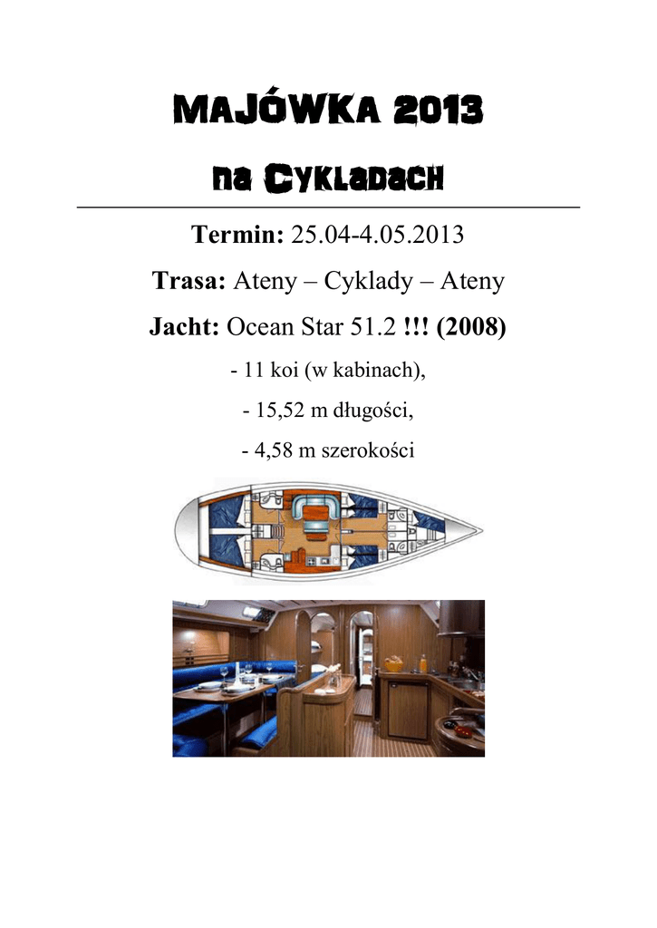 MAJÓWKA 2013 na Cykladach Termin: 25.04-4.05.2013 Trasa: Ateny – Cyklady – Ateny Jacht: Ocean Star 51.2 !!! (2008) - 11 koi (w kabinach), - 15,52 m długości, - 4,58 m szerokości KOSZTY: Jacht: 240euro/osobę Zrzutka(ropa, porty, prowiant): 100euro/osobę =340eur (ok. 1430zł) + (kaucja zwrotna za jacht po ok. 100euro/osobę) Dodatkowo przelot Polska-Ateny-Polska (na dzień 28.01.2013 jest to koszt ok. 1000zł) Warto szybko się decydować, ceny biletów już zaczynają rosnąć! Rejs niekomercyjny, dzięki temu cena jak na taki jacht bardzo atrakcyjna Grzegorz Świerczyński [email protected] tel: +48 792 132 441