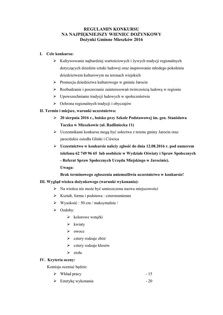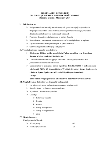 REGULAMIN KONKURSU NA NAJPIĘKNIEJSZY WIENIEC DOŻYNKOWY Dożynki Gminne Mieszków 2016 I. Cele konkursu: Kultywowanie najbardziej wartościowych i żywych tradycji regionalnych dotyczących dziedzin sztuki ludowej oraz inspirowanie młodego pokolenia dziedzictwem kulturowym na terenach wiejskich Promocja dziedzictwa kulturowego w gminie Jarocin Rozbudzanie i poszerzanie zainteresowań twórczością ludową w regionie Upowszechnianie tradycji ludowych w społeczeństwie Ochrona regionalnych tradycji i obyczajów II. Termin i miejsce, warunki uczestnictwa: 20 sierpnia 2016 r., boisko przy Szkole Podstawowej im. gen. Stanisława Taczka w Mieszkowie (ul. Radliniecka 11) Uczestnikami konkursu mogą być sołectwa z terenu gminy Jarocin oraz jarocińskie osiedla Glinki i Ciświca Uczestnictwo w konkursie należy zgłosić do dnia 12.08.2016 r. pod numerem telefonu 62 749 96 65 lub osobiście w Wydziale Oświaty i Spraw Społecznych - Referat Spraw Społecznych Urzędu Miejskiego w Jarocinie). Uwaga: Brak terminowego zgłoszenia uniemożliwia uczestnictwo w konkursie! III. Wygląd wieńca dożynkowego (warunki wykonania): Na wieńcu nie może być umieszczona nazwa miejscowości Kształt, forma i podstawa : czteroramienne Wysokość : 50 cm / maksymalnie / Ozdoby: kolorowe wstążki kwiaty owoce cztery rodzaje zbóż cztery rodzaje kłosów zioła IV. Kryteria oceny: Komisja oceniać będzie: Wkład pracy - 15 Estetykę wykonania - 20 Oryginalność wykonania - 10 Wykorzystanie regulaminowych ozdób - 5 Maksymalnie można uzyskać 50 pkt. V. Nagrody: Sołectwa, osiedla, które zajmą I, II i III miejsce otrzymują nagrody rzeczowe o następującej wartości: I miejsce – 1000,00 zł II - 600,00 zł III – 400,00 zł pozostałe – dyplomy uczestnictwa. VI. Ocena: Wieńce dożynkowe oceniać będzie komisja konkursowa w składzie: - Przedstawiciel organizatora Dożynek Gminnych - Przedstawiciel Rady Miejskiej w Jarocinie - Przedstawiciel organizacji folklorystycznych z terenu gminy Jarocin Rozstrzygnięcie konkursu odbędzie się 20 sierpnia 2016 r. podczas Dożynek Gminnych w Mieszkowie VII. Uwagi końcowe: Organizator tegorocznych Dożynek Gminnych – sołectwo Mieszków – nie bierze udziału w konkursie. Dodatkowe informacje uzyskać można w Wydziale Oświaty i Spraw Społecznych – Referat Spraw Społecznych [email protected] lub pod numerem telefonu: 62 749 96 65 Wszelkie sprawy nie objęte regulaminem rozstrzyga organizator. Organizatorzy Dożynek 2016 Burmistrz Jarocina Sołtys Mieszkowa Adam Pawlicki Barbara Krysztofiak - Jurek