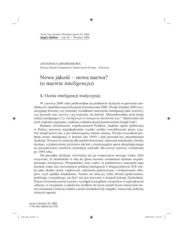 Acta Universitatis Wratislaviensis No 3060 Jêzyk a Kultura • tom 20 • Wrocław 2008 ANTONINA GRYBOSIOWA Wyższa Szkoła Umiejętności Społecznych Poznań – Katowice Nowa jakość – nowa nazwa? (o nazwie inteligencja) 1. Ocena inteligencji tradycyjnej W czerwcu 2006 roku próbowałam na podstawie licznych wypowiedzi medialnych i opublikowanych książek (Grochowska 2005; Świda-Ziemba 2005) rozstrzygnąć kwestię, czy jesteśmy świadkami zmierzchu inteligencji jako warstwy, czy przeszła ona, nazwa i jej nosiciele, do historii. Sformułowałam tytuł mojej relacji następująco Czy inteligencja to kategoria diachroniczna?. Opatrzyłam ten tytuł znakiem zapytania, znakiem wahania przed postawieniem kropki nad i. Badanie świadomości współczesnych Polaków, badanie opinii publicznej w Polsce, przynosi niejednokrotnie wyniki szybko weryfikowane przez czas. Nie minął nawet rok, a już obserwujemy istotne zmiany. Przede wszystkim problem oceny inteligencji w historii (do 1945) i dziś przestał być przedmiotem dyskusji. Stwarza to sytuację dla autorki korzystną, zapewnia minimalny choćby dystans, a jednocześnie przesuwa akcent z rozstrzygania sporu aksjologicznego na poszukiwanie możliwie neutralnej etykietki dla nowej warstwy wyłonionej po 1989 roku. Od początku dyskusji, ożywionej tuż po rozpoczęciu nowego wieku, było oczywiste, że dochodziło w niej do głosu nieostre rozumienie terminu socjologicznego inteligencja. Przypomnieć więc warto, że podstawowe znaczenie tego terminu wiąże się z powstaniem polskiej inteligencji w drugiej połowie XIX wieku jako skutku ustaw rządowych, zniesienia pańszczyzny i uwłaszczenia chłopów, czyli upadku feudalizmu. Termin ten dotyczy tylko dwóch społeczeństw, polskiego i rosyjskiego, nie był i nie jest używany w krajach Europy Zachodniej. Proces tworzenia nowej warstwy wystąpił szczególnie wyraziście w największym zaborze, w rosyjskim, w jakim bez środków do życia zostali liczni właściciele ziemi (ziemianie), którym władze carskie konfiskowały majątki i stosowały politykę różnych represji. Język a Kultura 20, 2008 © for this edition by CNS druk_JaK_20.indd 51 2008-06-06 10:14:54 52 ANTONINA GRYBOSIOWA Ten właśnie czynnik – rodowód społeczny szukających pracy poza rolnictwem, pracy najemnej – powraca jak echo w negatywnym, wręcz wrogim osądzie całej warstwy, żywionym przez lewicowych socjologów i historyków. Tymczasem wiadomo, że nie jest to cała prawda, gdyż od schyłku XIX wieku do 1939 roku w skład inteligencji coraz liczniej wchodzili chłopi i mieszczanie (z rodowodem robotniczym). Wystarczy przypomnieć pamiętnik Stanisława Pigonia, znakomitego profesora Uniwersytetu Jagiellońskiego, pt. Z Komborni w świat, w którym autor dumny ze swych chłopskich korzeni nakreślił trudną, ale możliwą i dość typową drogę chłopca z podkrośnieńskiej wioski na katedrę najstarszego uniwersytetu polskiego. Można tę drogę, którą przeszło wielu wybitnych inteligentów sprzed 1939 roku, uznać za symboliczną. Językoznawca przypomni sylwetkę prof. Stanisława Urbańczyka czy nestora prof. Mariana Kucały. Wspomniani łączyli w sposób idealny cechy etosu chłopskiego oraz inteligenckiego, nigdy nie traktowali ich antagonistycznie; zdobywali się na bezstronne, naukowe, a nie ideologiczne komentarze. Profesor S. Urbańczyk, wieloletni redaktor „Języka Polskiego”, zwykł mawiać, że dobrze, poprawnie po polsku mówi dopiero trzecie pokolenie inteligenckie, a sam należał do pierwszego. Tego obiektywizmu zabrakło niektórym uczestnikom dyskusji reagującym negatywnie na terminy inteligencja stara, dawna, tradycyjna, wielopokoleniowa, zamiast dumy z osiągniętego statusu pojawiała się wrogość. Wybuch II wojny światowej zamknął pewien okres istotnej roli inteligencji w trójczłonowym układzie społecznym, do którego oprócz niej należeli robotnicy i chłopi (Domański 1999). Okres okupacji, zagłada inteligencji spowodowały wyrwę, która m.in. zdecydowała o dalszym losie warstwy, o jakiej piszę (Bajerowa 1966). Rewolucyjne zmiany po 1945 roku wywołały bardzo szybki wzrost liczby wykształconych Polaków. Weszli oni w skład grupy nazywanej inteligencją pracującą. Dość szybko straciła znaczenie matura jako uprawniająca do miana inteligenta przed 1939 rokiem. Przypomnę tu obiegowy wierszyk: Nie matura, lecz chęć szczera zrobi z ciebie oficera. Nowe zasady „etyczne” nadwątliły etos, drugi wyznacznik przynależności do tej warstwy. Nowa jakościowo i ilościowo grupa miała granice nieostre, co było wykorzystywane w różnych ankietach i życiorysach. Zależnie od okoliczności wpisywało się w rubrykę pochodzenia robotnicze albo inteligenckie. Wtedy też pojawił się stygmatyzujący w biurokracji termin pochodzenie, żywy do dziś. Pojęcie d o b r e g o pochodzenia przechodziło zmienne losy, by na Śląsku ustalić się jako urodzenie w granicach III Rzeszy niemieckiej. Poza pograniczami (nie chodziło przecież tylko o Śląsk) i emigracją straciło jednak znaczenie. Dziś pyta się o przynależność państwową, a nie klasową, pochodzenie przestało być stygmatem. Po 1945 roku oficjalna propaganda zaszczepiła Polakom, dość trwale, negatywną ocenę tej części inteligencji, która miała dziewiętnastowieczny rodowód. Pojawiły się takie epitety, jak klasa próżniacza, zgniła, kosmopolityczna, wroga Język a Kultura 20, 2008 © for this edition by CNS druk_JaK_20.indd 52 2008-06-06 10:14:54 Nowa jakość – nowa nazwa? (o nazwie inteligencja) 53 ludowi itp. Echa tej „edukacji” można odnaleźć w ambiwalentnej niechęci, a jednocześnie docenianiu przynależności walczących ze sobą dyskutantów. Przejdę do krótkiego przeglądu stanowisk w dyskusji o inteligencji toczonej po 1989, szczególnie po 2000 roku. Od razu trzeba stwierdzić, że etykietki inteligencja używano nieprecyzyjnie. Jedni dyskutanci