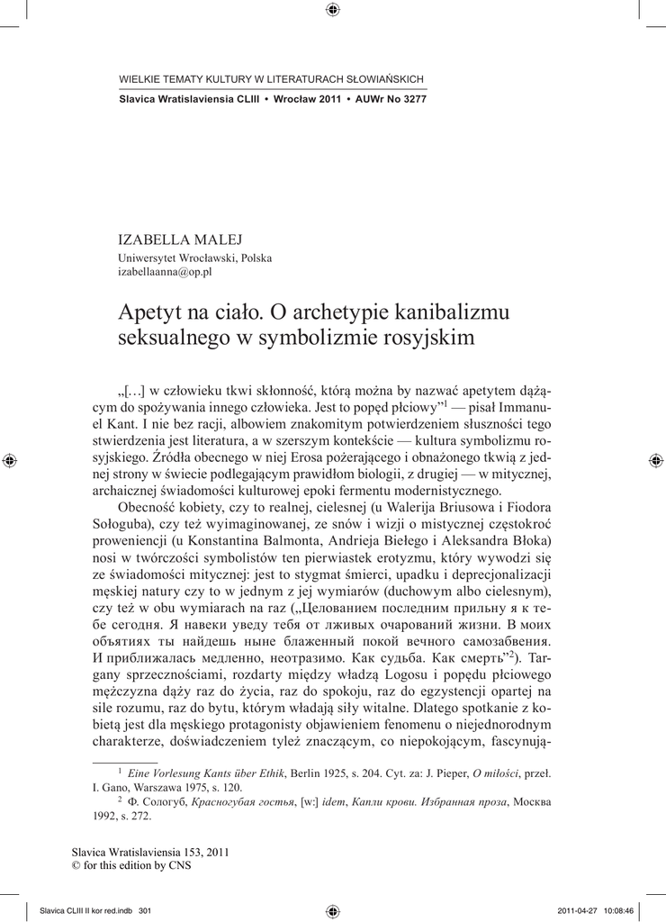 WIELKIE TEMATY KULTURY W LITERATURACH SŁOWIAŃSKICH Slavica Wratislaviensia CLIII • Wrocław 2011 • AUWr No 3277 IZABELLA MALEJ Uniwersytet Wrocławski, Polska [email protected] Apetyt na ciało. O archetypie kanibalizmu seksualnego w symbolizmie rosyjskim „[…] w człowieku tkwi skłonność, którą można by nazwać apetytem dążącym do spożywania innego człowieka. Jest to popęd płciowy”1 — pisał Immanuel Kant. I nie bez racji, albowiem znakomitym potwierdzeniem słuszności tego stwierdzenia jest literatura, a w szerszym kontekście — kultura symbolizmu rosyjskiego. Źródła obecnego w niej Erosa pożerającego i obnażonego tkwią z jednej strony w świecie podlegającym prawidłom biologii, z drugiej — w mitycznej, archaicznej świadomości kulturowej epoki fermentu modernistycznego. Obecność kobiety, czy to realnej, cielesnej (u Walerija Briusowa i Fiodora Sołoguba), czy też wyimaginowanej, ze snów i wizji o mistycznej częstokroć proweniencji (u Konstantina Balmonta, Andrieja Biełego i Aleksandra Błoka) nosi w twórczości symbolistów ten pierwiastek erotyzmu, który wywodzi się ze świadomości mitycznej: jest to stygmat śmierci, upadku i deprecjonalizacji męskiej natury czy to w jednym z jej wymiarów (duchowym albo cielesnym), czy też w obu wymiarach na raz („Целованием последним прильну я к тебе сегодня. Я навеки уведу тебя от лживых очарований жизни. В моих объятиях ты найдешь ныне блаженный покой вечного самозабвения. И приближалась медленно, неотразимо. Как судьба. Как смерть”2). Targany sprzecznościami, rozdarty między władzą Logosu i popędu płciowego mężczyzna dąży raz do życia, raz do spokoju, raz do egzystencji opartej na sile rozumu, raz do bytu, którym władają siły witalne. Dlatego spotkanie z kobietą jest dla męskiego protagonisty objawieniem fenomenu o niejednorodnym charakterze, doświadczeniem tyleż znaczącym, co niepokojącym, fascynują1 Eine Vorlesung Kants über Ethik, Berlin 1925, s. 204. Cyt. za: J. Pieper, O miłości, przeł. I. Gano, Warszawa 1975, s. 120. 2 Ф. Сологуб, Красногубая гостья, [w:] idem, Капли крови. Избранная проза, Москва 1992, s. 272. Slavica Wratislaviensia 153, 2011 © for this edition by CNS Slavica CLIII II kor red.indb 301 2011-04-27 10:08:46 302 • Izabella Malej cym i przerażającym zarazem („Всегда эти свидания с Лилит были окутаны в сознании Варгольского густою пеленою странного, почти досадного ему забвения. Одно он знал несомненно — как ни крепки были объятия Лилит, как ни безумно дики были ее поцелуи, все же их связь оставалась чуждою грубых земных достижений [...]”3). Motorem jego działań staje się w obecności kobiety dążenie do pełni, przy zachowaniu własnej świadomości jako dominującej w relacjach z kobietą. Stąd postaci kobiece są czymś na kształt świadomości objawionej, naturalnie uległej, są wcieleniem nadziei na cud: mężczyzna, posiadając cieleśnie kobietę jako byt, sam spełnia się jako byt. Chce atoli, by jego władza i wolność zostały potwierdzone przez uległość partnerki. Projektuje zatem wyobrażenie kochanki paradoksalnie dobrej, która obdarzając mężczyznę miłością grzeszną, występną, seksualną, otwiera przed nim drzwi do głębin prapierwotnego bytu, dostarcza doznań dotychczas nieznanych, upojnych w swej perwersyjności. Nie bez powodu więc Briusow twierdził, że namiętność stanowi w swej istocie zagadkę: sięga swymi korzeniami poza świat rzeczy, poza uczucia, a gdy opanuje mężczyznę, to przybliża go do tych wiecznych granic, które otaczają jego „niebieskie więzienie”4. Nadzieje mężczyzny okazują się jednak płonne, i miast odkrycia „świętej głębi” czeka go pogrążenie w nicości, otchłani przerażającej bólem i zachwycającej rozkoszą. Intymna więź z partnerką sprawia, że staje się ona zdobyczą, ale i zgubą mężczyzny: jest wszystkim, czym mężczyzna nie jest, a czym pragnie być, stanowiąc jego zaprzeczenie i fizyczną kwintesencję życia. Znamienne, że apetyt na ciało związany jest w twórczości symbolistów z doświadczeniem dwuznaczności swojej cielesnej struktury. Mężczyzna przyjmuje bowiem własny seksualizm tylko wówczas, gdy jest on sposobem na zawładnięcie obcą naturą, jej okiełznaniem. Jednak w tej osobliwej rywalizacji dwóch, antagonistycznych w stosunku do siebie płci, partner ponosi najczęściej klęskę: albo zostaje w trakcie aktu miłosnego pożarty przez kobietę-modliszkę5, albo też, pozwoliwszy kobiecie na gwałt na swej cielesności i tożsamości, umiera jako świadomość. Zwłaszcza w prozie Briusowa (Юпитер поверженный, 1913; Алтарь Победы, 1911–1912) i Biełego (Srebrny gołąb /Серебряный голубь, 1910/) rozkoszy cielesnej towarzyszy nieodmiennie cierpienie metafizyczne. Podczas zbliżenia z kobietą bohater osiąga stan bliski utracie nie tylko świadomości, ale i osobowości, będący jednocześnie stanem najwyższego upojenia i totalnej integracji z Naturą, z jej mrocznymi siłami. Zdeterminowany dążeniem do jedności z Innym, odkrywa w seksie smak la mort douce — słodkiej śmierci poprzez syntezę pożądania, spełnienia seksualnego i samozatracenia („[...] ему показалось, будто там, за окном, стояла какая-то женщина: да рябое у нее 3 Ibidem, s. 268. В. Брюсов, Страсть, „Весы” 1904, nr 8, s. 23. 5 Szczegółowiej
