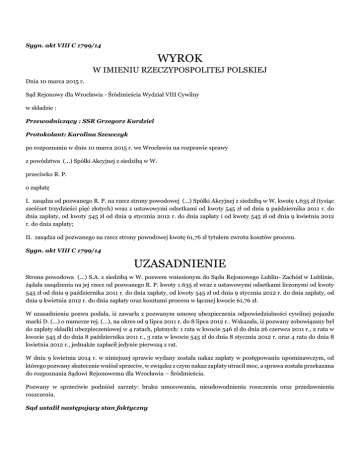 Sygn. akt VIII C 1799/14 WYROK W IMIENIU RZECZYPOSPOLITEJ POLSKIEJ Dnia 10 marca 2015 r. Sąd Rejonowy dla Wrocławia - Śródmieścia Wydział VIII Cywilny w składzie : Przewodniczący : SSR Grzegorz Kurdziel Protokolant: Karolina Szewczyk po rozpoznaniu w dniu 10 marca 2015 r. we Wrocławiu na rozprawie sprawy z powództwa (...) Spółki Akcyjnej z siedzibą w W. przeciwko R. P. o zapłatę I. zasądza od pozwanego R. P. na rzecz strony powodowej (...) Spółki Akcyjnej z siedzibą w W. kwotę 1.635 zł (tysiąc sześćset trzydzieści pięć złotych) wraz z ustawowymi odsetkami od kwoty 545 zł od dnia 9 października 2011 r. do dnia zapłaty, od kwoty 545 zł od dnia 9 stycznia 2012 r. do dnia zapłaty i od kwoty 545 zł od dnia 9 kwietnia 2012 r. do dnia zapłaty; II. zasądza od pozwanego na rzecz strony powodowej kwotę 61,76 zł tytułem zwrotu kosztów procesu. Sygn. akt VIII C 1799/14 UZASADNIENIE Strona powodowa (...) S.A. z siedzibą w W. pozwem wniesionym do Sądu Rejonowego Lublin- Zachód w Lublinie, żądała zasądzenia na jej rzecz od pozwanego R. P. kwoty 1.635 zł wraz z ustawowymi odsetkami liczonymi od kwoty 545 zł od dnia 9 października 2011 r. do dnia zapłaty, od kwoty 545 zł od dnia 9 stycznia 2012 r. do dnia zapłaty, od dnia 9 kwietnia 2012 r. do dnia zapłaty oraz kosztami procesu w łącznej kwocie 61,76 zł. W uzasadnieniu pozwu podała, iż zawarła z pozwanym umowę ubezpieczenia odpowiedzialności cywilnej pojazdu marki D. (...) o numerze rej. (...), na okres od 9 lipca 2011 r. do 8 lipca 2012 r.. Wskazała, iż pozwany zobowiązany był do zapłaty składki ubezpieczeniowej w 4 ratach, płatnych: 1 rata w kwocie 546 zł do dnia 26 czerwca 2011 r., 2 rata w kwocie 545 zł do dnia 8 października 2011 r., 3 rata w kwocie 545 zł do dnia 8 stycznia 2012 r. oraz 4 rata do dnia 8 kwietnia 2012 r., jednakże zapłacił jedynie pierwszą z rat. W dniu 9 kwietnia 2014 r. w niniejszej sprawie wydany została nakaz zapłaty w postępowaniu upominawczym, od którego pozwany skutecznie wniósł sprzeciw, w związku z czym nakaz zapłaty utracił moc, a sprawa została przekazana do rozpoznania Sądowi Rejonowemu dla Wrocławia – Śródmieścia. Pozwany w sprzeciwie podniósł zarzuty: braku umocowania, nieudowodnienia roszczenia oraz przedawnienia roszczenia. Sąd ustalił następujący stan faktyczny W dniu 28 czerwca 2011 r. pozwany zawarł ze stroną powodową umowę ubezpieczenia odpowiedzialności cywilnej jako posiadacz samochodu marki D. (...) o numerze rej. (...), na okres od 9 lipca 2011 r. do 8 lipca 2012 r. Pozwany zobowiązany był do zapłaty składki ubezpieczeniowej w wysokości 2.181 zł w czterech ratach, przy czym pierwsza rata w wysokości 546 zł była płatna do dnia 26 czerwca 2011 r., druga w wysokości 545 zł do dnia 8 października 2011 r., trzecia w wysokości 545 zł do dnia 8 stycznia 2012 r. oraz czwarta do dnia 8 kwietnia 2012 r. Pozwany uiścił pierwszą ratę w wysokości 546 zł Dowód: -umowa ubezpieczenia komunikacyjnego z dnia 28.06.2011 r., k.39-40, Pismem z dnia 7 marca 2014 r. strona powodowa wezwała pozwanego do zapłaty kwoty 2.088,44 zł z tytułu umowy ubezpieczenia odpowiedzialności cywilnej, na którą składała się kwota 1.635 zł należności głównej i kwota 453,44 zł tytułem odsetek ustawowych od dnia 8 października 2011 r. do dnia zapłaty. Dowód:- pismo z dnia 7.03.2014 r. k. 30. Sąd zważył co następuje Roszczenie strony powodowej zasługiwało w całości na uwzględnienie. Sąd dokonał ustaleń faktycznych w oparciu o przedłożone przez stronę powodową dokumenty, których rzetelność i prawdziwość nie budziły wątpliwości. Strona powodowa dochodziła zapłaty składki ubezpieczeniowej wywodząc swoje roszczenie z faktu zawarcia z pozwanym umowy ubezpieczenia odpowiedzialności cywilnej posiadaczy pojazdów mechanicznych, wskazując, iż pozwany nie uiścił w terminie trzech rat w łącznej kwocie 1.635 zł. Pozwany jedynie z ostrożności procesowej zarzucił brak umocowania, nieudowodnienie roszczenia oraz jego przedawnienie. Na podstawie analizy materiału dowodowego zgromadzonego w niniejszej sprawie, a w szczególności umowy ubezpieczenia komunikacyjnego numer (...), Sąd doszedł do przekonania, iż strona powodowa udowodniła swoje roszczenie zarówno co do wysokości, jak i co do zasady. Wysokość składki ubezpieczenia odpowiedzialności cywilnej jednoznacznie wynika z punktu VI. umowy, gdzie wskazane są również wysokości poszczególnych rat oraz terminy ich płatności pokrywające się z żądaniem pozwu. Z umowy wynika również, że pozwany uiścił pierwszą ratę w dniu jej zawarcia, pozostałe zaś raty miały być płatne w późniejszych terminach, pozwany jednak nie wywiązał się ze swojego zobowiązania. Zarzut przedawnienia roszczenia podniesiony przez pozwanego, również należało uznać za chybiony. Zgodnie z treścią art. 819 § 1 k.c. roszczenia z umowy ubezpieczenia przedawniają się z upływem lat trzech. Bieg przedawnienia roszczenia o niezapłaconą składkę ubezpieczenia od odpowiedzialności cywilnej rozpoczyna się w dniu, w którym stała się ona wymagalna, czyli w określonym w umowie terminie płatności. Najwcześniejsza z rat wymagalna była na dzień 8 października 2011 r., a więc w dniu wniesienia pozwu , tj. 31 marca 2014 r., nie upłynął jeszcze trzyletni termin przedawnienia roszczenia. Orzeczenie w kwestii odsetek od zaległej kwoty Sąd oparł na treści art. 481 k.c., z którego wynika, że jeżeli dłużnik opóźnia się ze spełnieniem świadczenia pieniężnego, wierzyciel może żądać odsetek za opóźnienie, chociażby nie poniósł żadnej szkody i chociażby opóźnienie było następstwem okoliczności, za które dłużnik odpowiedzialności nie ponosi. Sąd zasądził odsetki zgodnie z żądaniem pozwu, od dnia następnego po dniu wskazanym w umowie jako dzień płatności poszczególnych rat. Mając na uwadz