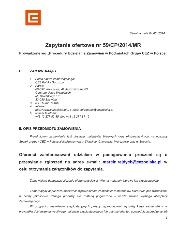 Skawina, dnia 04.03. 2014 r. Zapytanie ofertowe nr 59/CP/2014/MR Prowadzone wg „Procedury Udzielania Zamówień w Podmiotach Grupy CEZ w Polsce” I. ZAMAWIAJĄCY 1. Pełna nazwa zamawiającego: CEZ Polska Sp. z o.o. 2. Adres: 00-697 Warszawa, Al. Jerozolimskie 63 Centrum Usług Wspólnych ul.Piłsudskiego 10 32-050 Skawina 3. NIP: 5252374406 4. Internet: http://www.cezpolska.pl ., e-mail: [email protected] 5. Numer telefonu: +48 12 277 82 35, fax: +48 12 277 87 19 II. OPIS PRZEDMIOTU ZAMÓWIENIA Przedmiotem zamówienia jest dostawa materiałów biurowych oraz eksploatacyjnych na potrzeby Spółek z grupy CEZ w Polsce zlokalizowanych w Skawinie, Chorzowie, Warszawie oraz w Sopocie. Oferenci zainteresowani udziałem w postępowaniu proszeni są o przesyłanie zgłoszeń na adres e-mail: [email protected] w celu otrzymania załączników do zapytania. Zamawiający dopuszcza złożenie oferty częściowej tylko na materiały biurowe lub eksploatacyjne. Zamawiający dopuszcza możliwość wprowadzenia zamienników materiałów biurowych pod warunkiem, iż cechy jakościowe danego produkty nie zostaną pogorszone – każda zmiana wymaga akceptacji Zamawiającego. W przypadku materiałów eksploatacyjnych proszę zaproponować wysokiej klasy zamienniki – w przypadku dostarczenia wadliwego materiału eksploatacyjnego lub gdy materiał ten spowoduje zabrudzenie lub 1 uszkodzenia urządzenia Oferent jest zobowiązany do wymiany materiałów, naprawy lub wyczyszczenia urządzenia w ciągu 24 godzin od zgłoszenia pod rygorem kar umownych – dopuszcza się stosowanie urządzeń zastępczych o tej samej lub wyższej klasie jakościowej. Poszczególne działy w Spółkach Zamawiającego dokonują samodzielnie zakupów materiałów w miarę potrzeb. Proszę przedstawić funkcjonalności Państwa portalu zakupowego ze szczególnym uwzględnieniem rozwiązania pozwalającego na dokonywanie zakupów z tzw. koszyka materiałów biurowych jak również pozostałych materiałów z Państwa katalogu, tak by materiały z koszyka materiałów biurowych były preferowane. Ponadto w trakcie trwania postępowania Zamawiający ma prawo zażądać dowolnej próbki materiałów od Oferenta w przypadku braku dostarczenia próbek oferent zostanie wykluczony z postępowania. Wybrani oferenci w II etapie postępowania będą proszeni o przesłanie następujących bezpłatnych próbek materiałów eksploatacyjnych do testów: - do urządzenia LaserJet 1320, - do urządzenia LaserJet 5100. Wybrany Oferent będzie zobowiązany: - Obsługiwać Spółkę CEZ Polska oraz wskazane przez nią podmioty, w zakresie dostaw szeroko pojętych artykułów biurowych i eksploatacyjnych przez czas obowiązywania Umowy o Wzajemnej Współpracy (proponowany okres trwania umowy – 2 lata). - Wyznaczyć ze swojej strony tzw. Koordynatora Handlowego/Opiekuna, czyli osobę odpowiedzialną za bezpośredni kontakt i kompleksową obsługę Spółek w zakresie koordynacji oraz udzielania wszelkiego wsparcia merytorycznego. - Dostarczać zamówiony towar do wszystkich lokalizacji w przeciągu 2 dni roboczych od chwili przyjęcia zamówienia w przypadku zarówno produktów biurowych i eksploatacyjnych z tzw. Koszyka materiałów biurowych, jak również pozostałych produktów dostępnych w aktualnej ofercie katalogowej Oferenta. - Dostarczać (pakować) zamówiony towar oddzielnie dla każdego zamawiającego w danej lokalizacji wraz ze stosowną adnotacją (np. nazwa Działu, nazwisko osoby zamawiającej itp.). Na każdym dokumencie dostawy dołączonym do zamówienia należy umieścić: adres dostawy oraz nazwisko osoby odpowiedzialnej z ramienia poszczególnych Spółek do odbioru przesyłki. - Dostarczać zamówiony towar we własnym zakresie bądź za pośrednictwem poczty kurierskiej w godzinach urzędowania biur tzn. między 8:00 – 14:00 w dni robocze. Koszty wysyłki/transportu będzie ponosił każdorazowo Dostawca (dostawa w cenie zamówienia). 2 - Wystawienia faktur zbiorczych z rozbiciem na poszczególne działy w każdej Spółce za wszystkie towary zamówione w danym miesiącu. Faktury będą dostarczane do Spółek nie później niż 7 dnia kolejnego miesiąca kalendarzowego. Spółki zastrzegają sobie prawo do zwrotu towaru wadliwego i niezamówionego. - Przygotowywać na potrzeby wewnętrzne Spółek comiesięczne raporty sprzedaży dostarczane w formie załącznika-specyfikacji w formacie .xls przesyłanego na koniec każdego miesiąca do osób kontaktowych z ramienia Spółki, z rozbiciem na poszczególne Działy Spółek (działanie mające na celu systematyczną weryfikację potrzeb pracowników Spółek w zakresie materiałów biurowych oraz aktualizację zawartości koszyka podstawowego), - Dostarczania aktualnych katalogów, - Zapewnienia zgodności nr katalogowych z numerami na platformie zakupowej poszczególnych materiałów, - Jednoznacznego określenia jednostki zakupu dla każdego materiału na platformie zakupowej tzn. szt., opakowanie itp., - Dostarczania (całościowego) wszystkich zamówionych materiałów w jednym zamówieniu. Zamawiający dopuszcza w wyjątkowych sytuacjach brak dostawy pojedynczej pozycji, w takim przypadku należy obligatoryjnie zaznaczyć w dokumentach wraz z dostawą, które pozycja nie została dostarczona i w jakim terminie dostawa zostanie uzupełniona. Zamawiający zastrzega sobie prawo do: - Zwrotu towaru już zamówionego, w wypadku zaistnienia szczególnej sytuacji, gdy Zamawiający z różnych ważnych przyczyn będzie zmuszony dokonać ponownej weryfikacji danego zamówienia i podjąć decyzję o konieczności rezygnacji z niektórych jego pozycji. . III. TERMIN WYKONANIA ZAMÓWIENIA Przewidywany okres trwania umowy to 2 lata. IV. SPOSÓB PRZYGOTOWANIA OFERTY 1. Każda z ofert powinna składać się z dwóch oddzielnych części: technicznej i handlowej, w oddzielnych zapieczętowanych ofertach z właściwym dopiskiem na kopertach: „Część techniczna oferty – nr post