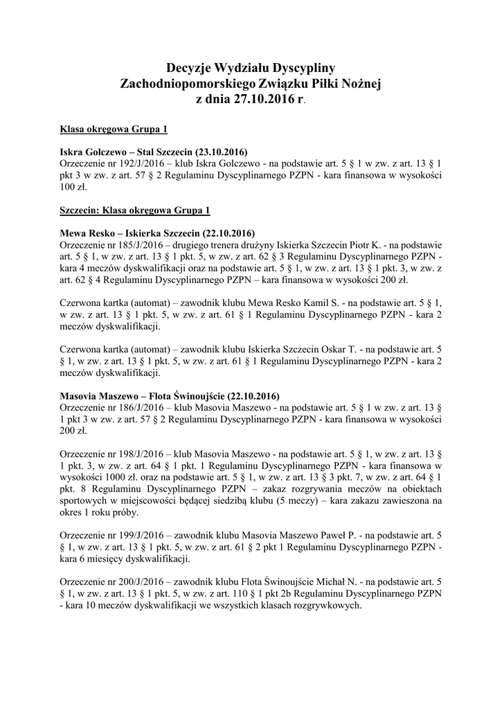 Decyzje Wydziału Dyscypliny Zachodniopomorskiego Związku Piłki Nożnej z dnia 27.10.2016 r. Klasa okręgowa Grupa 1 Iskra Golczewo – Stal Szczecin (23.10.2016) Orzeczenie nr 192/J/2016 – klub Iskra Golczewo - na podstawie art. 5 § 1 w zw. z art. 13 § 1 pkt 3 w zw. z art. 57 § 2 Regulaminu Dyscyplinarnego PZPN - kara finansowa w wysokości 100 zł. Szczecin: Klasa okręgowa Grupa 1 Mewa Resko – Iskierka Szczecin (22.10.2016) Orzeczenie nr 185/J/2016 – drugiego trenera drużyny Iskierka Szczecin Piotr K. - na podstawie art. 5 § 1, w zw. z art. 13 § 1 pkt. 5, w zw. z art. 62 § 3 Regulaminu Dyscyplinarnego PZPN kara 4 meczów dyskwalifikacji oraz na podstawie art. 5 § 1, w zw. z art. 13 § 1 pkt. 3, w zw. z art. 62 § 4 Regulaminu Dyscyplinarnego PZPN – kara finansowa w wysokości 200 zł. Czerwona kartka (automat) – zawodnik klubu Mewa Resko Kamil S. - na podstawie art. 5 § 1, w zw. z art. 13 § 1 pkt. 5, w zw. z art. 61 § 1 Regulaminu Dyscyplinarnego PZPN - kara 2 meczów dyskwalifikacji. Czerwona kartka (automat) – zawodnik klubu Iskierka Szczecin Oskar T. - na podstawie art. 5 § 1, w zw. z art. 13 § 1 pkt. 5, w zw. z art. 61 § 1 Regulaminu Dyscyplinarnego PZPN - kara 2 meczów dyskwalifikacji. Masovia Maszewo – Flota Świnoujście (22.10.2016) Orzeczenie nr 186/J/2016 – klub Masovia Maszewo - na podstawie art. 5 § 1 w zw. z art. 13 § 1 pkt 3 w zw. z art. 57 § 2 Regulaminu Dyscyplinarnego PZPN - kara finansowa w wysokości 200 zł. Orzeczenie nr 198/J/2016 – klub Masovia Maszewo - na podstawie art. 5 § 1, w zw. z art. 13 § 1 pkt. 3, w zw. z art. 64 § 1 pkt. 1 Regulaminu Dyscyplinarnego PZPN - kara finansowa w wysokości 1000 zł. oraz na podstawie art. 5 § 1, w zw. z art. 13 § 3 pkt. 7, w zw. z art. 64 § 1 pkt. 8 Regulaminu Dyscyplinarnego PZPN – zakaz rozgrywania meczów na obiektach sportowych w miejscowości będącej siedzibą klubu (5 meczy) – kara zakazu zawieszona na okres 1 roku próby. Orzeczenie nr 199/J/2016 – zawodnik klubu Masovia Maszewo Paweł P. - na podstawie art. 5 § 1, w zw. z art. 13 § 1 pkt. 5, w zw. z art. 61 § 2 pkt 1 Regulaminu Dyscyplinarnego PZPN kara 6 miesięcy dyskwalifikacji. Orzeczenie nr 200/J/2016 – zawodnik klubu Flota Świnoujście Michał N. - na podstawie art. 5 § 1, w zw. z art. 13 § 1 pkt. 5, w zw. z art. 110 § 1 pkt 2b Regulaminu Dyscyplinarnego PZPN - kara 10 meczów dyskwalifikacji we wszystkich klasach rozgrywkowych. Promień Mosty – Zootechnik Kołbacz (22.10.2016) Orzeczenie nr 187/J/2016 – klub Promień Mosty - na podstawie art. 5 § 1 w zw. z art. 13 § 1 pkt 3 w zw. z art. 64 § 1 pkt 1 Regulaminu Dyscyplinarnego PZPN - kara finansowa w wysokości 200 zł. Orzeczenie nr 188/J/2016 – klub Zootechnik Kołbacz - na podstawie art. 5 § 1 w zw. z art. 13 § 1 pkt 3 w zw. z art. 57 § 2 Regulaminu Dyscyplinarnego PZPN - kara finansowa w wysokości 200 zł. Orzeczenie nr 189/J/2016 – zawodnik klubu Zootechnik Kołbacz Robert T. - na podstawie art. 5 § 1, w zw. z art. 13 § 1 pkt. 5, w zw. z art. 61 § 2 pkt 1 Regulaminu Dyscyplinarnego PZPN - kara 6 meczów dyskwalifikacji we wszystkich klasach rozgrywkowych. Szczecin: Klasa okręgowa Grupa 2 AP Gavia Choszczno – Sokół Pyrzyce (22.10.2016) Orzeczenie nr 190/J/2016 – klub Sokół Pyrzyce - na podstawie art. 5 § 1 w zw. z art. 13 § 1 pkt 3 w zw. z art. 57 § 2 Regulaminu Dyscyplinarnego PZPN - kara finansowa w wysokości 100 zł. Orzeczenie nr 191/J/2016 – asystent trenera drużyny Sokół Pyrzyce Maciej H. - na podstawie art. 5 § 1, w zw. z art. 13 § 1 pkt. 5, w zw. z art. 62 § 3 Regulaminu Dyscyplinarnego PZPN kara 4 meczów dyskwalifikacji oraz na podstawie art. 5 § 1, w zw. z art. 13 § 1 pkt. 3, w zw. z art. 62 § 4 Regulaminu Dyscyplinarnego PZPN – kara finansowa w wysokości 200 zł. Orzeł Trzcińsko Zdrój – SCRS Barlinek (22.10.2016) Czerwona kartka (automat) – zawodnik klubu SCRS Barlinek Jakub Z. - na podstawie art. 5 § 1, w zw. z art. 13 § 1 pkt. 5, w zw. z art. 61 § 1 Regulaminu Dyscyplinarnego PZPN - kara 2 meczów dyskwalifikacji. Klasa A Grupa 1 Korona Stuchowo – Sowianka Sowno (22.10.2016) Orzeczenie nr 201/J/2016 – klub Korona Stuchowo - na podstawie art. 5 § 1 w zw. z art. 13 § 1 pkt 3 w zw. z art. 57 § 2 Regulaminu Dyscyplinarnego PZPN - kara finansowa w wysokości 100 zł. Czerwona kartka (automat) – zawodnik klubu Korona Stuchowo. - na podstawie art. 5 § 1, w zw. z art. 13 § 1 pkt. 5, w zw. z art. 61 § 3 Regulaminu Dyscyplinarnego PZPN - kara 1 mecz dyskwalifikacji. Klasa A Grupa 2 WODR Barzkowice – KS Rolpol Chlebowo (23.10.2016) Orzeczenie nr 202/J/2016 – klub WODR Barzkowice - na podstawie art. 5 § 1 w zw. z art. 13 § 1 pkt 3 w zw. z art. 57 § 2 Regulaminu Dyscyplinarnego PZPN - kara finansowa w wysokości 100 zł. Orzeczenie nr 208/J/2016 – zawodnik klubu WODR Barzkowice Rafał G. - na podstawie art. 5 § 1, w zw. z art. 13 § 1 pkt. 5, w zw. z art. 61 § 2 pkt 1 Regulaminu Dyscyplinarnego PZPN kara 6 meczów dyskwalifikacji we wszystkich klasach rozgrywkowych. Czerwona kartka (automat) – zawodnik klubu WODR Barzkowice Bartosz L. - na podstawie art. 5 § 1, w zw. z art. 13 § 1 pkt. 5, w zw. z art. 61 § 1 Regulaminu Dyscyplinarnego PZPN kara 2 meczów dyskwalifikacji. Klasa A Grupa 3 KP Przecław – Aquila Szczecin (22.10.2016) Orzeczenie nr 207/J/2016 – zawodnik klubu KP Przecław Daniel K. - na podstawie art. 5 § 1, w zw. z art. 13 § 1 pkt. 5, w zw. z art. 61 § 2 pkt 1 Regulaminu Dyscyplinarnego PZPN - kara 5 meczów dyskwalifikacji. Czerwona kartka (automat) – zawodnik klubu Aquila Szczecin Miłosz P. - na podstawie art. 5 § 1, w zw. z art. 13 § 1 pkt. 5, w zw. z art. 61 § 1 Regulaminu Dyscyplinarnego PZPN - kara 2 meczów dyskwalifikacji. Klasa A Grupa 4 Pro-Team Żarczyn – Unia Swochowo (23.10.2016) Czerwona kartka (automat) – zawodnik klubu Pro-Team Żarczyn Wojciech M. - na podstawie art. 5 § 1, w zw. z art. 13 § 1 pkt. 5, w zw. z art. 61