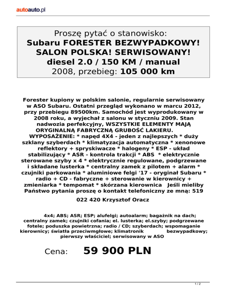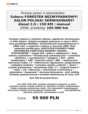 Proszę pytać o stanowisko: Subaru FORESTER BEZWYPADKOWY! SALON POLSKA! SERWISOWANY! diesel 2.0 / 150 KM / manual 2008, przebieg: 105 000 km Forester kupiony w polskim salonie, regularnie serwisowany w ASO Subaru. Ostatni przegląd wykonano w marcu 2012, przy przebiegu 89500km. Samochód jest wyprodukowany w 2008 roku, a wyjechał z salonu w styczniu 2009. Stan nadwozia perfekcyjny, WSZYSTKIE ELEMENTY MAJĄ ORYGINALNĄ FABRYCZNĄ GRUBOŚĆ LAKIERU. WYPOSAŻENIE: * napęd 4X4 - jeden z najlepszych * duży szklany szyberdach * klimatyzacja automatyczna * xenonowe reflektory + spryskiwacze * halogeny * ESP - układ stabilizujący * ASR - kontrola trakcji * ABS * elektrycznie sterowane szyby x 4 * elektrycznie regulowane, podgrzewane i składane lusterka * centralny zamek z pilotem + alarm * czujniki parkowania * aluminiowe felgi '17 - oryginał Subaru * radio + CD - fabryczne + sterowanie w kierownicy + zmieniarka * tempomat * skórzana kierownica Jeśli mieliby Państwo pytania proszę o kontakt telefoniczny ze mną: 519 022 420 Krzysztof Oracz 4x4; ABS; ASR; ESP; alufelgi; autoalarm; bagażnik na dach; centralny zamek; czujniki cofania; el. lusterka; el.szyby; podgrzewane fotele; poduszka powietrzna; radio / CD; szyberdach; wspomaganie kierownicy; światła przeciwmgłowe; klimatronik bezwypadkowy; pierwszy właściciel; serwisowany w ASO Cena: 59 900 PLN 1/2 brutto Opiekun: Al. Krakowska 178, Punkt A 2/2