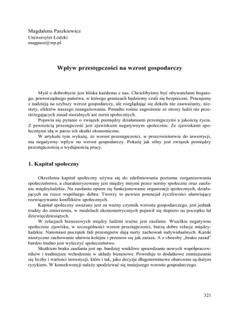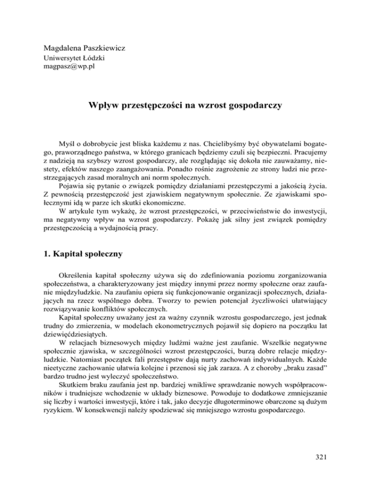 Magdalena Paszkiewicz Uniwersytet Łódzki [email protected] Wpływ przestępczości na wzrost gospodarczy Myśl o dobrobycie jest bliska każdemu z nas. Chcielibyśmy być obywatelami bogatego, praworządnego państwa, w którego granicach będziemy czuli się bezpieczni. Pracujemy z nadzieją na szybszy wzrost gospodarczy, ale rozglądając się dokoła nie zauważamy, niestety, efektów naszego zaangażowania. Ponadto rośnie zagrożenie ze strony ludzi nie przestrzegających zasad moralnych ani norm społecznych. Pojawia się pytanie o związek pomiędzy działaniami przestępczymi a jakością życia. Z pewnością przestępczość jest zjawiskiem negatywnym społecznie. Ze zjawiskami społecznymi idą w parze ich skutki ekonomiczne. W artykule tym wykażę, że wzrost przestępczości, w przeciwieństwie do inwestycji, ma negatywny wpływ na wzrost gospodarczy. Pokażę jak silny jest związek pomiędzy przestępczością a wydajnością pracy. 1. Kapitał społeczny Określenia kapitał społeczny używa się do zdefiniowania poziomu zorganizowania społeczeństwa, a charakteryzowany jest między innymi przez normy społeczne oraz zaufanie międzyludzkie. Na zaufaniu opiera się funkcjonowanie organizacji społecznych, działających na rzecz wspólnego dobra. Tworzy to pewien potencjał życzliwości ułatwiający rozwiązywanie konfliktów społecznych. Kapitał społeczny uważany jest za ważny czynnik wzrostu gospodarczego, jest jednak trudny do zmierzenia, w modelach ekonometrycznych pojawił się dopiero na początku lat dziewięćdziesiątych. W relacjach biznesowych między ludźmi ważne jest zaufanie. Wszelkie negatywne społecznie zjawiska, w szczególności wzrost przestępczości, burzą dobre relacje międzyludzkie. Natomiast początek fali przestępstw dają nurty zachowań indywidualnych. Każde nieetyczne zachowanie ułatwia kolejne i przenosi się jak zaraza. A z choroby „braku zasad” bardzo trudno jest wyleczyć społeczeństwo. Skutkiem braku zaufania jest np. bardziej wnikliwe sprawdzanie nowych współpracowników i trudniejsze wchodzenie w układy biznesowe. Powoduje to dodatkowe zmniejszanie się liczby i wartości inwestycji, które i tak, jako decyzje długoterminowe obarczone są dużym ryzykiem. W konsekwencji należy spodziewać się mniejszego wzrostu gospodarczego. 321 Reasumując, wzrost przestępczości powoduje spadek zaufania społecznego (mówi się, że jest negatywnym kapitałem społecznym), a w konsekwencji może prowadzić do spowolnienia wzrostu gospodarczego1. 2. Przestępczość Przestępstwem jest czyn zabroniony, który ponadto jest społecznie szkodliwy2. Rozwój cywilizacji oraz szybki postęp techniczny sprzyjają powstawaniu niepokojących zjawisk społeczno-psychologicznych: wiara w potęgę nauki odsuwa na dalszy plan religijność; priorytetem staje się osiągnięcie „sukcesu”, w większości utożsamianego z sukcesem finansowym; poczucie „wolności”, błędnie interpretowane jako nieograniczona swoboda działania, w szczególności niekorzystnego społecznie; frustracja i napięcie wynikające ze wzrostu tempa życia – potrzeba ich rozładowania; oswojenie jednostki, za pośrednictwem mediów, z powszechnością brutalności, krzywdy i przestępczości; łatwy dostęp do broni oraz narkotyków; mniejsza ilość czasu i uwagi, jaką rodzice poświęcają swoim dzieciom. Introcepcja3 powyższych czynników może przyczynić się od przekroczenia pewnego osobistego progu zasad, za którym stoi decyzja o popełnieniu przestępstwa 4. 3. Wpływ czynników ekonomicznych na przestępczość P. Fajnzylber, D. Lederman i N. Loayza 5 opracowali, przyjmując punkt widzenia G.S. Beckera6, matematyczny model indywidualnej decyzji o popełnieniu przestępstwa. Zgodnie z nim jednostka waży się na złamanie prawa, gdy oczekiwany zysk netto z planowanego przestępstwa będzie większy od pewnego progu zasad moralnych. Zyskiem netto z przestępstwa ma być różnica pomiędzy zyskami a kosztami jego popełnienia, przy uwzględnieniu prawdopodo-bieństwa aresztowania. 1 Wśród ekonomistów przeważa pogląd o negatywnym wpływie nierównomierności dochodów na wzrost gospodarczy. Ponadto zgodnie z modelem P. Fajnzylbera, D. Ledermana i N. Loayza [2002, por. przypis 5] zróżnicowanie w podziale dochodów ludności jest jednym z czynników powodujących wzrost stopy przestępczości. 2 Kodeks karny art. 1. 3 Introcepcja psychologiczne przyjmowanie od otoczenia postaw, norm, poglądów itd. (W. Kopaliński, Słownik wyrazów obcych i obcojęzycznych , Wiedza Powszechna, Warszawa 1983, s. 194). 4 Termin „próg” występuje w modelu P. Fajnzylbera, D. Ledermana i N. Loayza [2002]. 5 P. Fajnzylber, D. Lederman, N. Loayza, What causes violent crime?, “Europen Economic Review” 2002, No. 7, s. 1323-1357. 6 G.S. Becker, Crime and Punishment: An Economic Approach, „Journal of Political Economy” 1968, No. 76. 322 P. Fajnzylber, D. Lederman i N. Loayza zweryfikowali swój model stopy przestępczości dla 34 krajów na próbie obejmującej okres od 1970 do 1990 roku. Zgodnie z ich badaniami na stopę przestępczości mają wpływ następujące czynniki: dodatni: – przeciętny dochód, – zróżnicowanie w poziomie dochodów ludności, – wykształcenie dorosłej populacji (dla mnie zaskakujące), ujemny: – stopa wzrostu gospodarczego. Dla Polski model stopy przestępczości oszacowali B. Markowska, J.J. Sztaudynger oraz M. Sztaudynger7 na próbie obejmującej okres 1978–2000. Uzyskali następujące wyniki: dodatni wpływ na stopę przestępczości mają: wzrost zróżnicowania dochodów i stopa bezrobocia, ujemny wpływ na stopę przestępczości mają: stopa wzrostu realnych dochodów osobistych oraz skuteczność systemu egzekwowania prawa. 4. Wzrost gospodarczy Ekonomiści używają na ogół pojęcia wzrost gospodarczy na określenie procentowej rocznej zmiany dochodu narodowego danego kraju lub grupy krajów8. W art