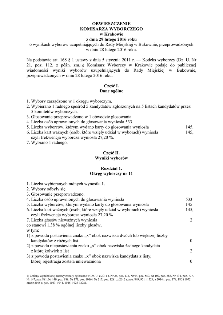 OBWIESZCZENIE KOMISARZA WYBORCZEGO w Krakowie z dnia 29 lutego 2016 roku o wynikach wyborów uzupełniających do Rady Miejskiej w Bukownie, przeprowadzonych w dniu 28 lutego 2016 roku. Na podstawie art. 168 § 1 ustawy z dnia 5 stycznia 2011 r. — Kodeks wyborczy (Dz. U. Nr 21, poz. 112, z późn. zm.1)) Komisarz Wyborczy w Krakowie podaje do publicznej wiadomości wyniki wyborów uzupełniających do Rady Miejskiej w Bukownie, przeprowadzonych w dniu 28 lutego 2016 roku. Część I. Dane ogólne 1. Wybory zarządzono w 1 okręgu wyborczym. 2. Wybierano 1 radnego spośród 5 kandydatów zgłoszonych na 5 listach kandydatów przez 5 komitetów wyborczych. 3. Głosowanie przeprowadzono w 1 obwodzie głosowania. 4. Liczba osób uprawnionych do głosowania wyniosła 533. 5. Liczba wyborców, którym wydano karty do głosowania wyniosła 145. 6. Liczba kart ważnych (osób, które wzięły udział w wyborach) wyniosła 145, czyli frekwencja wyborcza wyniosła 27,20 %. 7. Wybrano 1 radnego. Część II. Wyniki wyborów Rozdział 1. Okręg wyborczy nr 11 1. Liczba wybieranych radnych wynosiła 1. 2. Wybory odbyły się. 3. Głosowanie przeprowadzono. 4. Liczba osób uprawnionych do głosowania wyniosła 5. Liczba wyborców, którym wydano karty do głosowania wyniosła 6. Liczba kart ważnych (osób, które wzięły udział w wyborach) wyniosła czyli frekwencja wyborcza wyniosła 27,20 % 7. Liczba głosów nieważnych wyniosła co stanowi 1,38 % ogólnej liczby głosów, w tym: 1) z powodu postawienia znaku „x” obok nazwiska dwóch lub większej liczby kandydatów z różnych list 2) z powodu niepostawienia znaku „x” obok nazwiska żadnego kandydata z którejkolwiek z list 3) z powodu postawienia znaku „x” obok nazwiska kandydata z listy, której rejestracja została unieważniona 533 145 145, 2 0 2 0 1) Zmiany wymienionej ustawy zostały ogłoszone w Dz. U. z 2011 r. Nr 26, poz. 134, Nr 94, poz. 550, Nr 102, poz. 588, Nr 134, poz. 777, Nr 147, poz. 881, Nr 149, poz. 889, Nr 171, poz. 1016 i Nr 217, poz. 1281, z 2012 r. poz. 849, 951 i 1529, z 2014 r. poz. 179, 180 i 1072 oraz z 2015 r. poz. 1043, 1044, 1045, 1923 i 2281. 8. Liczba głosów ważnych wyniosła 143 co stanowi 98,62 % ogólnej liczby głosów. 9. Na poszczególne listy kandydatów i kandydatów z tych list oddano następującą liczbę głosów: 1) SZLĘZAK Tomasz Jarosław 4 lista nr 1 KWW TOMASZA SZLĘZAK 2) POWAGA Aldona Barbara 13 lista nr 2 KWW ALDONY BARBARY POWAGI 3) SZOTEK Zdzisław Józef 36 lista nr 3 KWW RAZEM 4) LABISKO Anna Maria 46 lista nr 4 KWW ANNY LABISKO 5) CURYŁO Marek 44 lista nr 5 KWW MAREK CURYŁO 10. Radnym został wybrany: 1) z listy nr 4 KWW ANNY LABISKO - LABISKO Anna Maria 11. W okręgu nr 11 mandat został obsadzony. Komisarz Wyborczy w Krakowie (-) Teresa Rak