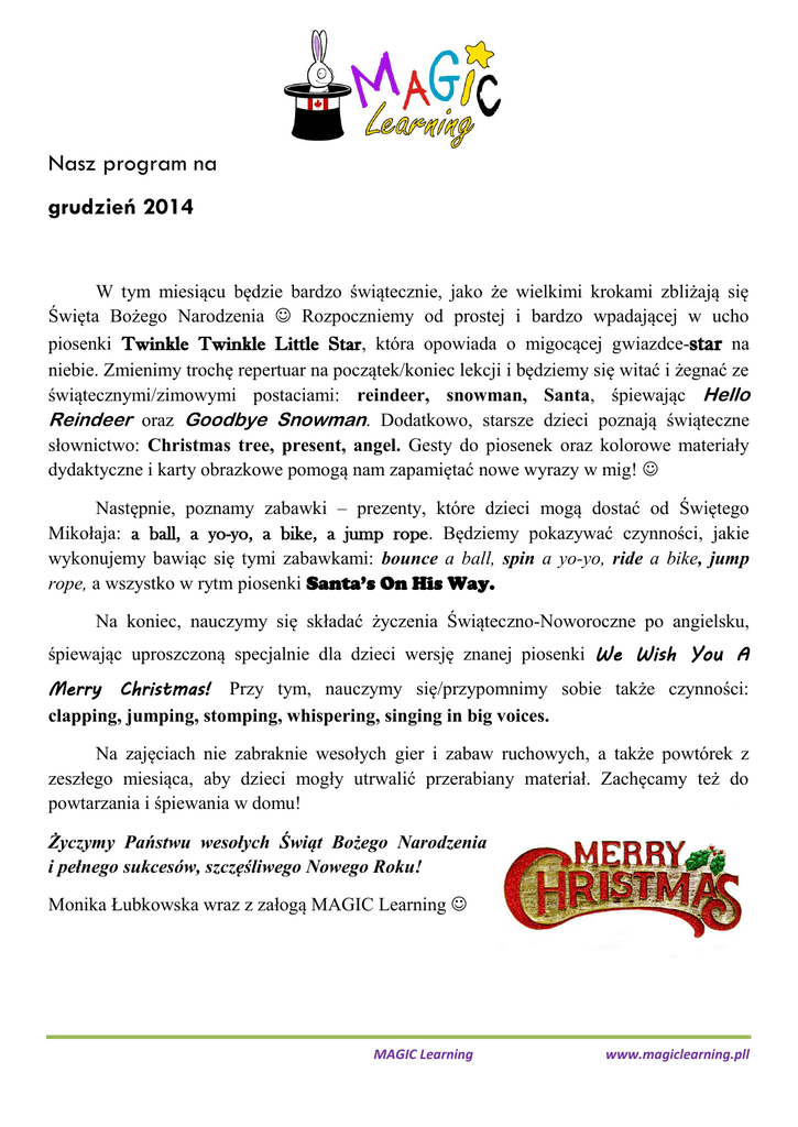 Nasz program na grudzień 2014 W tym miesiącu będzie bardzo świątecznie, jako że wielkimi krokami zbliżają się Święta Bożego Narodzenia Rozpoczniemy od prostej i bardzo wpadającej w ucho piosenki Twinkle Twinkle Little Star, która opowiada o migocącej gwiazdce-star na niebie. Zmienimy trochę repertuar na początek/koniec lekcji i będziemy się witać i żegnać ze świątecznymi/zimowymi postaciami: reindeer, snowman, Santa, śpiewając Hello Reindeer oraz Goodbye Snowman. Dodatkowo, starsze dzieci poznają świąteczne słownictwo: Christmas tree, present, angel. Gesty do piosenek oraz kolorowe materiały dydaktyczne i karty obrazkowe pomogą nam zapamiętać nowe wyrazy w mig! Następnie, poznamy zabawki – prezenty, które dzieci mogą dostać od Świętego Mikołaja: a ball, a yo-yo, a bike, a jump rope. Będziemy pokazywać czynności, jakie wykonujemy bawiąc się tymi zabawkami: bounce a ball, spin a yo-yo, ride a bike, jump rope, a wszystko w rytm piosenki Santa’s On His Way. Na koniec, nauczymy się składać życzenia Świąteczno-Noworoczne po angielsku, śpiewając uproszczoną specjalnie dla dzieci wersję znanej piosenki We Wish You A Merry Christmas! Przy tym, nauczymy się/przypomnimy sobie także czynności: clapping, jumping, stomping, whispering, singing in big voices. Na zajęciach nie zabraknie wesołych gier i zabaw ruchowych, a także powtórek z zeszłego miesiąca, aby dzieci mogły utrwalić przerabiany materiał. Zachęcamy też do powtarzania i śpiewania w domu! Życzymy Państwu wesołych Świąt Bożego Narodzenia i pełnego sukcesów, szczęśliwego Nowego Roku! Monika Łubkowska wraz z załogą MAGIC Learning MAGIC Learning www.magiclearning.pll Dodatkowo, dla najstarszej grupy, będziemy realizować materiał z podręcznika (zakres słownictwa oraz piosenki poniżej): Here’s Patch the Puppy 2” – kontynuujemy rozdział 2: dress-sukienka jumper-bluza coat-kurtka boots-buty hat-czapka What’s the weather like? – jaka jest pogoda? It’s sunny/cloudy/windy/raining – jest słonecznie/pochmurnie/wietrznie/pada deszcz I’m putting on… - wkładam na siebie… I want my… - ja chcę moje/mój… I’m going out – wychodzę na zewnątrz Off we go – idziemy Back we go – wracamy Piosenki: Weather song I’m going out to play What weather! Story song MAGIC Learning www.magiclearning.pll