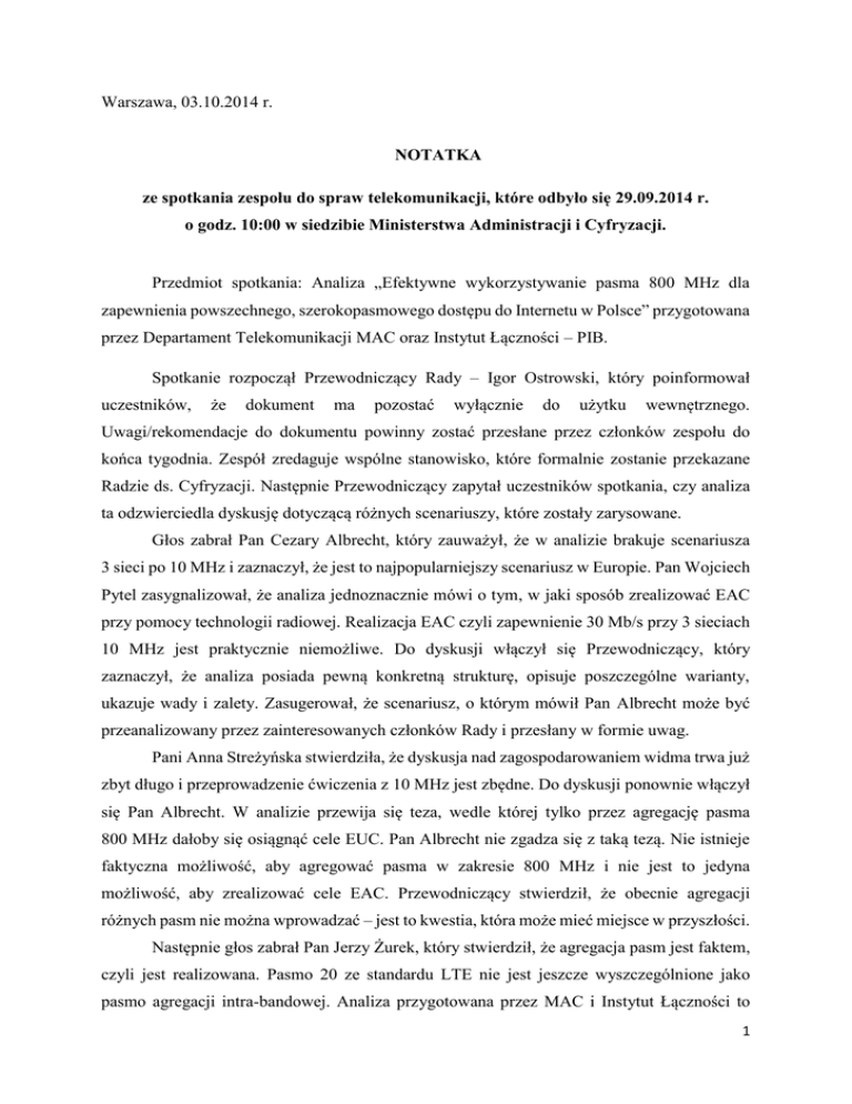 Warszawa, 03.10.2014 r. NOTATKA ze spotkania zespołu do spraw telekomunikacji, które odbyło się 29.09.2014 r. o godz. 10:00 w siedzibie Ministerstwa Administracji i Cyfryzacji. Przedmiot spotkania: Analiza „Efektywne wykorzystywanie pasma 800 MHz dla zapewnienia powszechnego, szerokopasmowego dostępu do Internetu w Polsce” przygotowana przez Departament Telekomunikacji MAC oraz Instytut Łączności – PIB. Spotkanie rozpoczął Przewodniczący Rady – Igor Ostrowski, który poinformował uczestników, że dokument ma pozostać wyłącznie do użytku wewnętrznego. Uwagi/rekomendacje do dokumentu powinny zostać przesłane przez członków zespołu do końca tygodnia. Zespół zredaguje wspólne stanowisko, które formalnie zostanie przekazane Radzie ds. Cyfryzacji. Następnie Przewodniczący zapytał uczestników spotkania, czy analiza ta odzwierciedla dyskusję dotyczącą różnych scenariuszy, które zostały zarysowane. Głos zabrał Pan Cezary Albrecht, który zauważył, że w analizie brakuje scenariusza 3 sieci po 10 MHz i zaznaczył, że jest to najpopularniejszy scenariusz w Europie. Pan Wojciech Pytel zasygnalizował, że analiza jednoznacznie mówi o tym, w jaki sposób zrealizować EAC przy pomocy technologii radiowej. Realizacja EAC czyli zapewnienie 30 Mb/s przy 3 sieciach 10 MHz jest praktycznie niemożliwe. Do dyskusji włączył się Przewodniczący, który zaznaczył, że analiza posiada pewną konkretną strukturę, opisuje poszczególne warianty, ukazuje wady i zalety. Zasugerował, że scenariusz, o którym mówił Pan Albrecht może być przeanalizowany przez zainteresowanych członków Rady i przesłany w formie uwag. Pani Anna Streżyńska stwierdziła, że dyskusja nad zagospodarowaniem widma trwa już zbyt długo i przeprowadzenie ćwiczenia z 10 MHz jest zbędne. Do dyskusji ponownie włączył się Pan Albrecht. W analizie przewija się teza, wedle której tylko przez agregację pasma 800 MHz dałoby się osiągnąć cele EUC. Pan Albrecht nie zgadza się z taką tezą. Nie istnieje faktyczna możliwość, aby agregować pasma w zakresie 800 MHz i nie jest to jedyna możliwość, aby zrealizować cele EAC. Przewodniczący stwierdził, że obecnie agregacji różnych pasm nie można wprowadzać – jest to kwestia, która może mieć miejsce w przyszłości. Następnie głos zabrał Pan Jerzy Żurek, który stwierdził, że agregacja pasm jest faktem, czyli jest realizowana. Pasmo 20 ze standardu LTE nie jest jeszcze wyszczególnione jako pasmo agregacji intra-bandowej. Analiza przygotowana przez MAC i Instytut Łączności to 1 próba oceny wykorzystania pasma 800 MHz do spełnienia celów EAC. Zakres częstotliwości jest atrakcyjny ze względu na oferowane zasięgi. Białe plamy i problem pokrycia odpowiednio szerokopasmowym dostępem do Internetu dotyczy obszarów słabo zaludnionych – takich, gdzie np. operatorom nie opłaca się budować sieci o odpowiednich parametrach. Wszystkie pasma z wyższych zakresów częstotliwości mają sens przy budowaniu sieci pojemnościowych. Pan Żurek dodał, że w dokumencie są analizowane sieci realizowane w kanale częstotliwościowym 15 MHz i ten wariant w ogóle nie wymaga zastosowania agregacji częstotliwości. Pan Pytel zauważył, że jeżeli przyjmiemy, że według EAC średnia przepustowość sektora to 30 Mb/s, to dopiero od 15 MHz istnieje sens ekonomiczny budowania sieci, bo wtedy liczba stacji bazowych spadnie poniżej 20 tys. Do dyskusji włączył się Pan Albrecht, według którego niego stwierdzenie, że cele EAC mogą być osiągnięte tylko na podstawie wykorzystania pasma 800 nie do końca jest prawdziwe. Przewodniczący przytoczył fragment analizy „Z przeprowadzonych analiz wynika, że w Polsce jest ok. 48 tys. miejscowości (91% miejscowości zamieszkanych przez ponad 30% ludności), które są tzw. białymi plamami NGA. Jednocześnie alokacja dostępna w ramach POPC (ok. 1 mld Euro) pozwoli na budowę sieci dla 1,5-2 mln gospodarstw domowych, tj. ok. połowy gospodarstw w białych plamach. Na pozostałych obszarach rekomendowane będzie zapewnienie dostępu do szybkiego Internetu poprzez technologie bezprzewodowe (LTE)”. Następnie Przewodniczący zapytał uczestników, czy wszyscy zgadzają się z tym stwierdzeniem. Pan Albrecht zauważył, że jest to stwierdzenie teoretyczne, dodatkowo dokument nie uwzględnia tego, że mamy już w kraju kilka sieci. Wszyscy członkowie zespołu zgodzili się ze stwierdzeniem Przewodniczącego, że jeżeli chodzi o wstęp dokumentu – założenia są słuszne. Kolejna kwestia poruszoną przez Przewodniczącego było wymiarowanie sieci. Następnie Przewodniczący zasugerował, aby omówić analizę techniczną dokumentu. Przedstawił stwierdzenie, że cele agendy cyfrowej będą zrealizowane jeżeli poziom 30 Mb/s będzie poziomem minimalnym, a nie maksymalnym. Pan Pytel zauważył, ze zapewnienie poziomu minimalnego jest trudne. W większości przypadków operatorzy stosują średnią prędkość sektora (przepustowość sektora). Żeby zwiększyć transfer do 30 Mb należy zwiększyć liczbę stacji bazowych. EAC jest nieprecyzyjna, nie mówi jak należy modelować. Do dyskusji włączył się Pan Żurek argumentując, że szybkość transmisji jest to szybkość na granicy zasięgu komórki. Systemy, których obecnie używamy są systemami adaptacyjnymi. Najistotniejsza sprawa w jego ocenie to zapewnienie w najgorszych warunkach maksymalnej osiągalnej 2 szybkości transmisji 30 Mb/s (na granicach zasięgu stacji bazowych wszystkie miejsca, które będą się znajdowały bliżej stacji bazowej będą posiadały szybszy transfer niż 30 Mb/s). Przewodniczący odniósł się do wymiarowania sieci, gdzie „nie rozważono wariantu budowy sieci z wykorzystaniem kanałów o szerokości 10 MHz”. Dla pełnej analizy temat ten może być rozwinięty, tym bardziej, że w 15 z 20 krajów przytoczonych w dokumencie taki model zrealizowano. Pan Ż