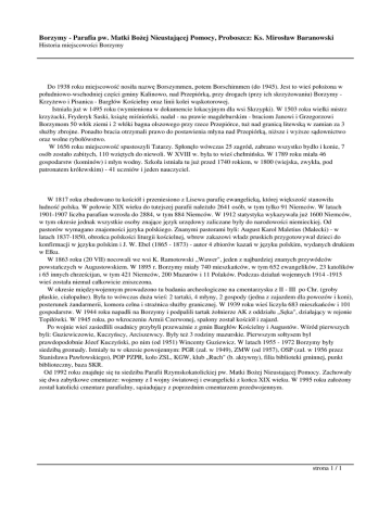 Borzymy - Parafia pw. Matki Bożej Nieustającej Pomocy, Proboszcz: Ks. Mirosław Baranowski Historia miejscowości Borzymy Do 1938 roku miejscowość nosiła nazwę Borszymmen, potem Borschimmen (do 1945). Jest to wieś położona w południowo-wschodniej części gminy Kalinowo, nad Przepiórką, przy drogach (przy ich skrzyżowaniu) Borzymy Krzyżewo i Pisanica - Bargłów Kościelny oraz linii kolei wąskotorowej. Istniała już w 1495 roku (wymieniona w dokumencie lokacyjnym dla wsi Skrzypki). W 1503 roku wielki mistrz krzyżacki, Fryderyk Saski, książę miśnieński, nadał - na prawie magdeburskim - braciom Janowi i Grzegorzowi Borzymom 50 włók ziemi i 2 włóki bagna olszowego przy rzece Przepiórce, tuż nad granicą litewską w zamian za 3 służby zbrojne. Ponadto bracia otrzymali prawo do postawienia młyna nad Przepiórką, niższe i wyższe sądownictwo oraz wolne rybołówstwo. W 1656 roku miejscowość spustoszyli Tatarzy. Spłonęło wówczas 25 zagród, zabrano wszystko bydło i konie, 7 osób zostało zabitych, 110 wziętych do niewoli. W XVIII w. była to wieś chełmińska. W 1789 roku miała 46 gospodarstw (kominów) i młyn wodny. Szkoła istniała tu już przed 1740 rokiem, w 1800 (wiejska, zwykła, pod patronatem królewskim) - 41 uczniów i jeden nauczyciel. W 1817 roku zbudowano tu kościół i przeniesiono z Lisewa parafię ewangelicką, której większość stanowiła ludność polska. W połowie XIX wieku do tutejszej parafii należało 2641 osób, w tym tylko 91 Niemców. W latach 1901-1907 liczba parafian wzrosła do 2884, w tym 884 Niemców. W 1912 statystyka wykazywała już 1600 Niemców, w tym okresie jednak wszystkie osoby znające język urzędowy zaliczane były do narodowości niemieckiej. Od pastorów wymagano znajomości języka polskiego. Znanymi pastorami byli: August Karol Maletius (Malecki) - w latach 1837-1850, obrońca polskości liturgii kościelnej, wbrew zakazowi władz pruskich przygotowywał dzieci do konfirmacji w języku polskim i J. W. Ebel (1865 - 1873) - autor 4 zbiorów kazań w języku polskim, wydanych drukiem w Ełku. W 1863 roku (20 VII) nocowali we wsi K. Ramotowski „Wawer", jeden z najbardziej znanych przywódców powstańczych w Augustowskiem. W 1895 r. Borzymy miały 740 mieszkańców, w tym 652 ewangelików, 23 katolików i 65 innych chrześcijan, w tym 421 Niemców, 200 Mazurów i 11 Polaków. Podczas działań wojennych 1914 -1915 wieś została niemal całkowicie zniszczona. W okresie międzywojennym prowadzono tu badania archeologiczne na cmentarzysku z II - III po Chr. (groby płaskie, ciałopalne). Była to wówczas duża wieś: 2 tartaki, 4 młyny, 2 gospody (jedna z zajazdem dla powozów i koni), posterunek żandarmerii, komora celna i strażnica służby granicznej. W 1939 roku wieś liczyła 683 mieszkańców i 101 gospodarstw. W 1944 roku napadli na Borzymy i podpalili tartak żołnierze AK z oddziału „Sęka", działający w rejonie Topiłówki. W 1945 roku, po wkroczeniu Armii Czerwonej, spalony został kościół i zajazd. Po wojnie wieś zasiedlili osadnicy przybyli przeważnie z gmin Bargłów Kościelny i Augustów. Wśród pierwszych byli: Guziewiczowie, Kuczyńscy, Arciszewscy. Były też 3 rodziny mazurskie. Pierwszym sołtysem był prawdopodobnie Józef Kuczyński, po nim (od 1951) Wincenty Guziewicz. W latach 1955 - 1972 Borzymy były siedzibą gromady. Istniały tu w okresie powojennym: PGR (zał. w 1949), ZMW (od 1957), OSP (zał. w 1956 przez Stanisława Pawłowskiego), POP PZPR, koło ZSL, KGW, klub „Ruch" (b. aktywny), filia biblioteki gminnej, punkt biblioteczny, baza SKR. Od 1992 roku znajduje się tu siedziba Parafii Rzymskokatolickiej pw. Matki Bożej Nieustającej Pomocy. Zachowały się dwa zabytkowe cmentarze: wojenny z I wojny światowej i ewangelicki z końca XIX wieku. W 1995 roku założony został katolicki cmentarz parafialny, sąsiadujący z poprzednim cmentarzem przedwojennym. strona 1 / 1