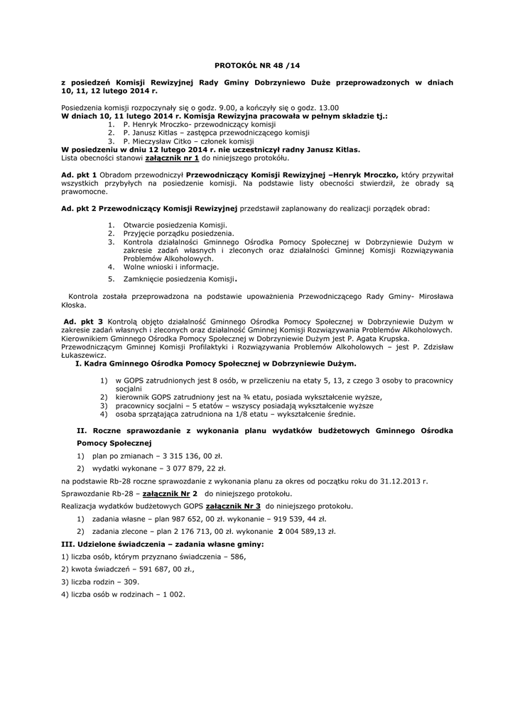 PROTOKÓŁ NR 48 /14 z posiedzeń Komisji Rewizyjnej Rady Gminy Dobrzyniewo Duże przeprowadzonych w dniach 10, 11, 12 lutego 2014 r. Posiedzenia komisji rozpoczynały się o godz. 9.00, a kończyły się o godz. 13.00 W dniach 10, 11 lutego 2014 r. Komisja Rewizyjna pracowała w pełnym składzie tj.: 1. P. Henryk Mroczko- przewodniczący komisji 2. P. Janusz Kitlas – zastępca przewodniczącego komisji 3. P. Mieczysław Citko – członek komisji W posiedzeniu w dniu 12 lutego 2014 r. nie uczestniczył radny Janusz Kitlas. Lista obecności stanowi załącznik nr 1 do niniejszego protokółu. Ad. pkt 1 Obradom przewodniczył Przewodniczący Komisji Rewizyjnej –Henryk Mroczko, który przywitał wszystkich przybyłych na posiedzenie komisji. Na podstawie listy obecności stwierdził, że obrady są prawomocne. Ad. pkt 2 Przewodniczący Komisji Rewizyjnej przedstawił zaplanowany do realizacji porządek obrad: 1. 2. 3. 4. 5. Otwarcie posiedzenia Komisji. Przyjęcie porządku posiedzenia. Kontrola działalności Gminnego Ośrodka Pomocy Społecznej w Dobrzyniewie Dużym w zakresie zadań własnych i zleconych oraz działalności Gminnej Komisji Rozwiązywania Problemów Alkoholowych. Wolne wnioski i informacje. Zamknięcie posiedzenia Komisji. Kontrola została przeprowadzona na podstawie upoważnienia Przewodniczącego Rady Gminy- Mirosława Kłoska. Ad. pkt 3 Kontrolą objęto działalność Gminnego Ośrodka Pomocy Społecznej w Dobrzyniewie Dużym w zakresie zadań własnych i zleconych oraz działalność Gminnej Komisji Rozwiązywania Problemów Alkoholowych. Kierownikiem Gminnego Ośrodka Pomocy Społecznej w Dobrzyniewie Dużym jest P. Agata Krupska. Przewodniczącym Gminnej Komisji Profilaktyki i Rozwiązywania Problemów Alkoholowych – jest P. Zdzisław Łukaszewicz. I. Kadra Gminnego Ośrodka Pomocy Społecznej w Dobrzyniewie Dużym. 1) 2) 3) 4) w GOPS zatrudnionych jest 8 osób, w przeliczeniu na etaty 5, 13, z czego 3 osoby to pracownicy socjalni kierownik GOPS zatrudniony jest na ¾ etatu, posiada wykształcenie wyższe, pracownicy socjalni – 5 etatów – wszyscy posiadają wykształcenie wyższe osoba sprzątająca zatrudniona na 1/8 etatu – wykształcenie średnie. II. Roczne sprawozdanie z wykonania planu wydatków budżetowych Gminnego Ośrodka Pomocy Społecznej 1) plan po zmianach – 3 315 136, 00 zł. 2) wydatki wykonane – 3 077 879, 22 zł. na podstawie Rb-28 roczne sprawozdanie z wykonania planu za okres od początku roku do 31.12.2013 r. Sprawozdanie Rb-28 – załącznik Nr 2 do niniejszego protokołu. Realizacja wydatków budżetowych GOPS załącznik Nr 3 do niniejszego protokołu. 1) zadania własne – plan 987 652, 00 zł. wykonanie – 919 539, 44 zł. 2) zadania zlecone – plan 2 176 713, 00 zł. wykonanie 2 004 589,13 zł. III. Udzielone świadczenia – zadania własne gminy: 1) liczba osób, którym przyznano świadczenia – 586, 2) kwota świadczeń – 591 687, 00 zł., 3) liczba rodzin – 309. 4) liczba osób w rodzinach – 1 002. Zasiłki okresowe 1) liczba osób, którym przyznano świadczenia – 98, 2) liczba świadczeń – 372, 2) kwota świadczeń – 147 268, 00 zł., 3) liczba rodzin – 95, 4) liczba osób w rodzinach – 300. Zasiłki okresowe kontynuowane niezależnie od dochodów - posiłki dla dzieci 1) liczba osób, którym przyznano świadczenia – 320, 2) liczba świadczeń – 38 465, 2) kwota świadczeń – 161 968, 00 zł., 3) liczba rodzin – 165, Usługi opiekuńcze. 1) liczba osób, którym przyznano świadczenia – 5, 2) liczba świadczeń – 2 511, 2) kwota świadczeń – 10 763, 00 zł., 3) liczba rodzin – 5. Zdarzenia losowe. Pokrycie wydatków – 3 000, 00 zł., Inne zasiłki celowe i w naturze ogółem. 1) liczba osób, którym przyznano świadczenia – 233, 2) kwota świadczeń – 96 786, 00 zł., 3) liczba rodzin – 170. Zasiłki specjalne celowe. 1) liczba osób, którym przyznano świadczenia – 17, 2) liczba świadczeń – 22, 2) kwota świadczeń – 5 394, 00 zł., 3) liczba rodzin – 17. Odpłatność gminy za pobyt w domach pomocy społecznej. 1) liczba osób – 13, 2) liczba świadczeń - 136 2) kwota świadczeń – 243 790, 00 zł., I. Powody przyznania pomocy. 1) ubóstwo – 108 rodzin, 2) bezdomność – 2 rodziny, 3) ochrona macierzyńska – 23 rodziny, w tym wielodzietność – 16 rodzin, 4) bezrobocie – 132 os. 5) niepełnosprawność – 58 os. 6) długotrwała lub ciężka choroba – 46 os. 7) bezradność w sprawach opiekuńczo – wychowawczych i prowadzenia gospodarstwa domowego, w tym: - rodziny niepełne – 21, - rodziny wielodzietne- 11, - pomoc w rodzinie – 1, - alkoholizm- 2 os., - narkomania -1 os., - przystosowanie do życia po zwolnieniu z aresztu – 2 os., - zdarzenia losowe – 5, - sytuacja kryzysowa – 2. II. Zadania własne w 2013 r. Opłacenie składek na ubezpieczenie zdrowotne: - w 2013 r. GOPS opłacał składki na ubezpieczenie zdrowotne 35 osobom pobierającym zasiłek stały ( obsługę zapewnił Program Płatnik. Na powyższe wydatkowano kwotę 13 908, 00 zł. ( liczba należnych składek - 327 ). Na te zadania gmina otrzymuje pełną dotację. III. Dodatki mieszkaniowe W 2013 r. z tej formy pomocy skorzystały 3 rodziny na kwotę 5 463, 20 zł. Warunkiem przyznania pomocy jest: 1) posiadanie tytułu prawnego do lokalu, 2) osiągnięcie niskiego dochodu, 3) odpowiednia powierzchnia lokalu. Zasiłki były wypłacone rodzinom, które nie są w stanie płacić czynszu. VII. Kontrola zewnętrzna 1) Podlaski Urząd Wojewódzki Wydział Polityki Społecznej przeprowadził kontrolę problemową, 2) Urząd Marszałkowski w Białymstoku przeprowadził kontrolę dotyczącą prawidłowości rozliczeń finansowych projektu systemowego realizowanego przez GOPS w 2012 r. kwalifikowalność wydatków dotyczących personelu projektu, sposobu przetwarzania danych, zapewnienia właściwej ścieżki audytu dla realizacji poszczególnych obszarów projektu.