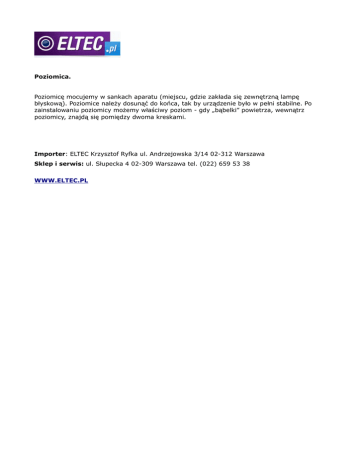 Poziomica. Poziomicę mocujemy w sankach aparatu (miejscu, gdzie zakłada się zewnętrzną lampę błyskową). Poziomice należy dosunąć do końca, tak by urządzenie było w pełni stabilne. Po zainstalowaniu poziomicy możemy właściwy poziom - gdy „bąbelki” powietrza, wewnątrz poziomicy, znajdą się pomiędzy dwoma kreskami. Importer: ELTEC Krzysztof Ryfka ul. Andrzejowska 3/14 02-312 Warszawa Sklep i serwis: ul. Słupecka 4 02-309 Warszawa tel. (022) 659 53 38 WWW.ELTEC.PL