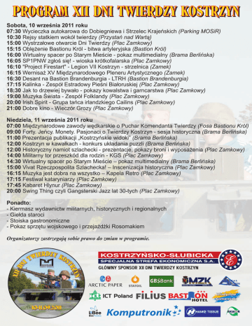 PROGRAM XII DNI TWIERDZY KOSTRZYN Sobota, 10 wrzeœnia 2011 roku 07:30 Wycieczka autokarowa do Dobiegniewa i Strzelec Krajeñskich (Parking MOSiR) 10:30 Rejsy statkiem wokó³ twierdzy (Przystañ nad Wart¹) 15:00 Wystrza³owe otwarcie Dni Twierdzy (Plac Zamkowy) 15:15 Oblê¿enie Bastionu Król - bitwa artyleryjska (Bastion Król) 16:00 Wirtualny spacer po Starym Mieœcie - pokaz multimedialny (Brama Berliñska) 16:05 SP1PNW zg³oœ siê! - wioska krótkofalarska (Plac Zamkowy) 16:10 "Project Firestart" - Legion VII Kostrzyn - strzelnica (Zamek) 16:15 Wernisa¿ XV Miêdzynarodowego Pleneru Artystycznego (Zamek) 16:30 Desant na Bastion Brandenburgia - LTRH (Bastion Brandenburgia) 17:15 Kalinka - Zespó³ Estradowy Pieœni Bia³oruskiej (Plac Zamkowy) 18:30 Jak to drzewiej bywa³o - pokazy kowalstwa i garncarstwa (Plac Zamkowy) 19:00 Muzyka Œwiata - Zespó³ Folklandy (Plac Zamkowy) 20:00 Irish Spirit - Grupa tañca irlandzkiego Cailins (Plac Zamkowy) 21:00 Dobre kino - Wieczór Grozy (Plac Zamkowy) Niedziela, 11 wrzeœnia 2011 roku 07:00 Miêdzynarodowe zawody wêdkarskie o Puchar Komendanta Twierdzy (Fosa Bastionu Król) 09:00 Forty. Jeñcy. Monety. Pasjonaci o Twierdzy Kostrzyn - sesja historyczna (Brama Berliñska) 11:00 Prezentacja publikacji „Kostrzyñskie widoki” (Brama Berliñska) 12:00 Kostrzyn w kawa³kach - konkurs uk³adania puzzli (Brama Berliñska) 12:00 Historyczny namiot szlachecki - prezentacje, pokazy broni i wyposa¿enia (Plac Zamkowy) 14:00 Militarny tor przeszkód dla rodzin - KGS (Plac Zamkowy) 14:30 Wirtualny spacer po Starym Mieœcie – pokaz multimedialny (Brama Berliñska) 15:00 Vivat Rzeczpospolita Szlachecka! – Inscenizacja historyczna (Plac Zamkowy) 16:15 Muzyka jest dobra na wszystko – Kapela Retro (Plac Zamkowy) 17:15 Festiwal kataryniarzy (Plac Zamkowy) 17:45 Kabaret Hlynur (Plac Zamkowy) 20:00 Swing Thing czyli Gangsterski Jazz lat 30-tych (Plac Zamkowy) Ponadto: - Kiermasz wydawnictw militarnych, historycznych i regionalnych - Gie³da staroci - Stoiska gastronomiczne - Pokaz sprzêtu wojskowego i przeja¿d¿ki Rosomakiem Organizatorzy zastrzegaj¹ sobie prawo do zmian w programie. G£ÓWNY SPONSOR XII DNI TWIERDZY KOSTRZYN Kostrzyn nad Odr¹ Spó³ka z o. o.