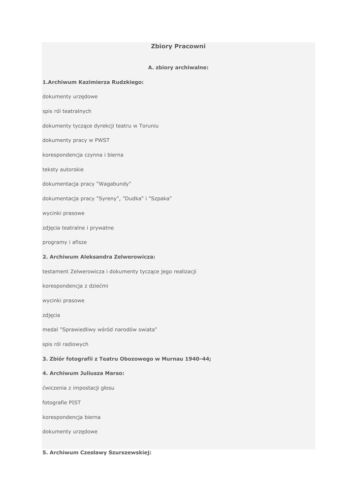 Zbiory Pracowni A. zbiory archiwalne: 1.Archiwum Kazimierza Rudzkiego: dokumenty urzędowe spis ról teatralnych dokumenty tyczące dyrekcji teatru w Toruniu dokumenty pracy w PWST korespondencja czynna i bierna teksty autorskie dokumentacja pracy "Wagabundy" dokumentacja pracy "Syreny", "Dudka" i "Szpaka" wycinki prasowe zdjęcia teatralne i prywatne programy i afisze 2. Archiwum Aleksandra Zelwerowicza: testament Zelwerowicza i dokumenty tyczące jego realizacji korespondencja z dziećmi wycinki prasowe zdjęcia medal "Sprawiedliwy wśród narodów swiata" spis ról radiowych 3. Zbiór fotografii z Teatru Obozowego w Murnau 1940-44; 4. Archiwum Juliusza Marso: ćwiczenia z impostacji głosu fotografie PIST korespondencja bierna dokumenty urzędowe 5. Archiwum Czesławy Szurszewskiej: listy od Mariana Wyrzykowskiego album fot. z Państwowej Szkoły Dramatycznej 6. Album Ludwika Sempolińskiego (wycinki prasowe 1925-62) 7. Archiwum Bronisława Horowicza: korespondencja bierna od Kazimierza Rudzkiego korespondencja bierna od Mariana Wyrzykowskiego 8. Archiwum Teresy Roszkowskiej: dyplom PIST korespondencja bierna projekty kostiumów 9. Archiwum Marii Buchwaldowej fot. teatralne przedwojenne fot. wojenne z kawiarni "U Aktorek" fot. z teatru w Lingen fot. z Teatru Polskiego w Londynie 10. Archiwum Franciszka Borysa Borkowskiego: korespondencja bierna fotografie teatralne 11. Archiwum Janiny Mieczyńskiej: dokumenty teatralne fotografie wycinki prasowe 12. Archiwum Zbigniewa Koczanowicza: kartoteka wycinków prasowych i zdjęć obejmująca ok 2 500 aktorów i reżyserów. dokumenty i fotogafie z okresu nauki w PIST 13. Archiwum Elżbiety Barszczewskiej i Mariana Wyrzykowskiego: dokumenty prywatne E.B. i M.W. dokumenty okresu nauki M.W. w Szkole Dramatycznej i PIST dokumenty z działalności społecznej M.W. (ZASP-SPATiF) dokumenty pracy artystycznej E.B. i M.W. (egzemplarze afisze, programy, zdjęcia, recenzje; także przedwojenne) korespondencja bierna teatralna, od wielbicieli, prywatna zdjęcia teatralne i prywatne kolekcja afiszy "kroniczki " (=dzienniki) Mariana Wyrzykowskiego, wydane drukiem przez B. Lasocką w 1996r 14. Archiwum Arnolda Szyfmana: dokumenty działalności Teatru Polskiego korespondencja bierna listy Marii Przybyłko Potockiej wycinki prasowe projekty kostiumów Karola Frycza do "Hamleta" 15. Archiwum Wandy Barszczewskiej: korespondencja bierna fotografie teatralne i prywatne dokumenty album wycinkow i recenzji afisze warszawskie i krakowskie 1887-1898 16. Archiwum Jerzego Kaliszewskiego: dokumenty prywatne i zawodowe korespondencja bierna teatralna i urzędowa dokumentacja pracy pedagogicznej w PWST w Krakowie dokumentacja pracy pedagogicznej w PWST w Warszawie dokumentacja dyrekcji w Katowicach i Warszawie fotografie brulion notatek ze studiów na Wydziale Reżyserii programy teatralne egzemplarze reżyserskie 17. Archiwum Zbigniewa Sawana : notatki ze studiów w PIST dokumenty pracy zawodowej wycinki prasowe korespondencja bierna album wycinków aktorów polskich 1900-23 dziennik korespondencji Teatru Malickiej 1935-39 egzemplarze teatralne (unikaty !! !) 18. Archiwum Ryszardy Hanin: korespondencja bierna teatralna korespondencja bierna prywatna listy od wielbicieli zdjęcia prywatne zdjęcia teatralne dokumenty biograficzne dokumenty pracy zawodowej (unikaty! !!) kompletna dokumentacja prasowa i fotograficzna pracy zawodowej wycinki prasowe prywatne (wywiady, artykuły) dokumentacja pracy w PWST egzemplarze 19. Archiwum Jana Świderskiego: dokumenty teatralne dokumenty prywatne korespondencja bierna teatralna i prywatna listy od wielbicieli albumy zdjęć teatralnych dokumenty pracy w PWST 20. Archiwum Jerzego Timoszewicza: dzienniki praktyk studentów WOT prace seminaryjne studentów WOT 21. Archiwum Ewy Bonackiej i Władysława Daszewskiego: dokumenty pracy teatralnej W.D. fotografie teatralne E.B. egzemplarze reżyserskie E.B. egzemplarz dokumentacyjny "Zemsty" w Teatrze Narodowym w1962r 22. Archiwum Zofii Małynicz : wycinki prasowe teatralne zdjęcia teatralne zdjęcia ludzi teatru maszynopisy wspomnień, wypowiedzi, wywiadów korespondencja bierna teatralna dokumenty urzędowe medal ,,200 lat Teatru Narodowego" zdjęcia z PIST 23. Zbiór zdjęć dot. Państwowego Instytutu Sztuki Teatralnej 24. Archiwum Stanisławy Perzanowskiej: fotografie prywatne fotografie teatralne fotografie ludzi teatru sztambuch z wpisami aktorów korespondencja bierna teatralna i prywatna maszynopisy autorskie Perzanowskiej egzemplarze, role 25. Archiwum Hanny Bielskiej i Eugeniusza Poredy: egzemplarze fotografie teatralne przedwojenne fotografie teatralne powojenne albumy zdjęć i wycinków teatralnych dokumenty teatralne przedwojenne dokumenty teatralne Miejskich Teatrów Dramatycznych korespondencja bierna teatralna album zdjęć z Miejskiego Teatru Dramatycznego w Częstochowie maszynopisy wspomnień, wywiadów i wypowiedzi dokumenty pracy H.B. i E.P. 26. Archiwum Zdzisława Kordeckiego: Korespondencja z ludźmi teatru 27. Archiwum Jana Englerta: dok. mechaniczna: kaseta „Kolacja z Radiem Z 14 IX 92; kaseta podziemna NOWEJ „Bojkot”; płyta „Il lugno viaggio”; dokumenty osobiste i studenckie (m.in. indeks i metryka); dok. pracy społecznej (ZASP, dyplomy - jub. Teatru Polskiego); fotografie zawodowe i prywatne; maszynopisy i rękopisy, 3 teczki: 28. Medal Wiesława Mireckiego: medal z Akademickich Zawodów Sportowych, zdobyty przez słuchacza PIST, Wiesława Mireckiego w 1936; 29. Archiwum Jerzego Koeniga: dokumenty dotyczące Wydziału Wiedzy o Teatrze prace studentów 30. Archiwum Lecha Hellwiga-Górzyńskiego (w opracowaniu) 31. Archiwum Janusza Nyczaka (w opracowaniu) B. archiwum bieżące 1. dokumentacja poszczególnych lat akademickich (od 1984r); 2. zbiór wycinków prasowych nt PWST; 3. bibliografia publikacji nt PWST; 4. zbiór zdjęć z dyplomów od 1948 do 1962r; 5. spis aktów prawnych tyczących szkolnictwa teatralnego; 6. kartoteka absolwentów WOT; 7. anki
