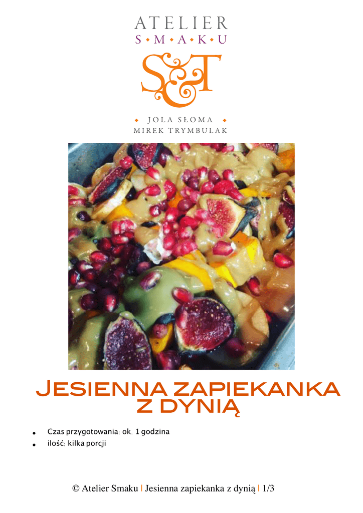 Jesienna zapiekanka z dynią • Czas przygotowania: ok. 1 godzina • ilość: kilka porcji © Atelier Smaku | Jesienna zapiekanka z dynią | 1/3 Składniki: • 1/2 kg dyni • 1 rzepa • 1 pietruszka • 4 świeże figi • 2 garści świeżej żurawiny • 2 garści drobnych winogron bezpestkowych Marynata: • 1/4 łyżki octu balsamicznego • 2-3 łyżki melasy z karobu • 2-3 łyżki oleju sezamowego • 1/4 szklanki mleka kokosowego • 1/4 szklanki melasy z karobu • 1/4 szklanki tahini • ziarna owocu granatu do dekoracji Sos: Sposób przygotowania: Dynię pozbawiamy nasion, obieramy ze skórki jeśli jest twarda, następnie kroimy w plastry lub kostkę. Na dnie blaszki do pieczenia mieszamy ze sobą ocet balsamiczny, melasę z karobu i olej sezamowy. Następnie dorzucamy pokrojoną w plastry rzepę, pietruszkę, a także świeżą © Atelier Smaku | Jesienna zapiekanka z dynią | 2/3 żurawinę i winogrona. Wszystkie składniki mieszamy, tak, by były pokryte marynatą, na wierzchu kładziemy pokrojone w plastry figi i całość wkładamy do piekarnika nastawionego na 180oC na ok. 40-50 minut. W trakcie pieczenia przygotowujemy sos do polania, mieszając ze sobą mleczko kokosowe, melasę z karobu i tahini. Gdy zapiekanka się upiecze, polewamy ją sosem i posypujemy ziarnami z owocu granatu. Smacznego i na zdrowie! © Atelier Smaku | Jesienna zapiekanka z dynią | 3/3