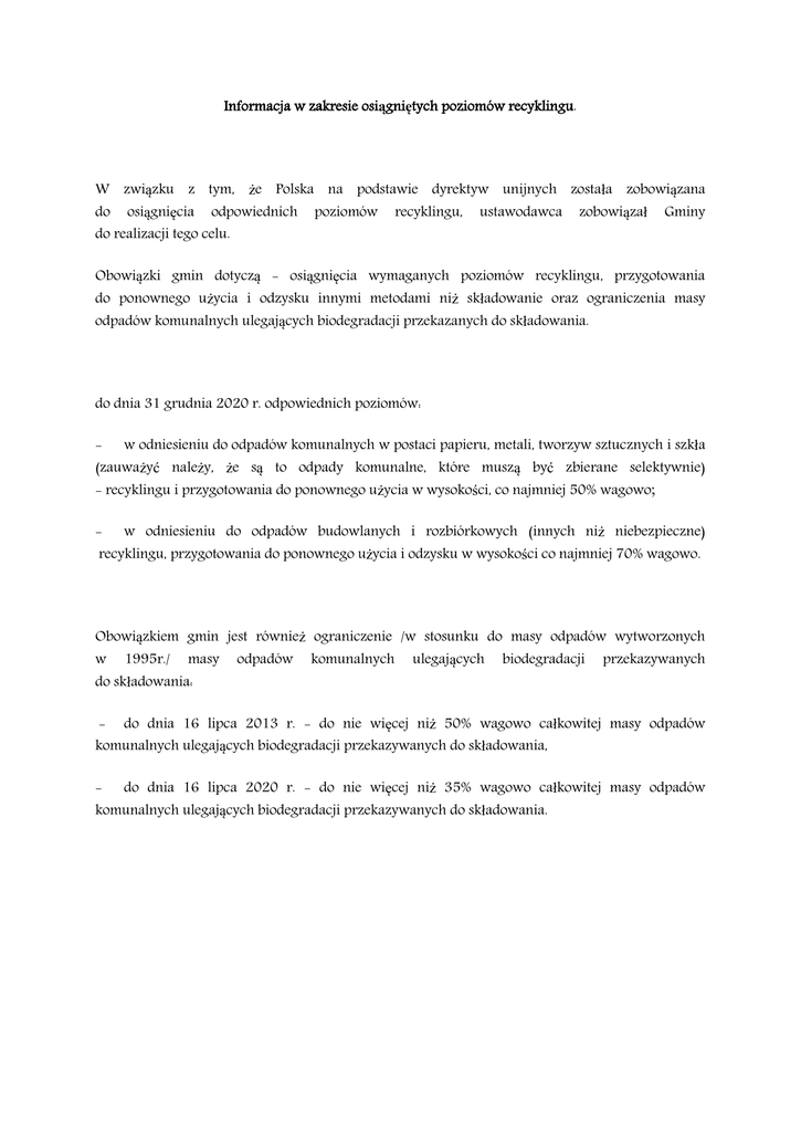 Informacja w zakresie osiągniętych poziomów recyklingu. W związku z tym, że Polska na podstawie dyrektyw unijnych została zobowiązana do osiągnięcia odpowiednich do realizacji tego celu. poziomów recyklingu, ustawodawca zobowiązał Gminy Obowiązki gmin dotyczą - osiągnięcia wymaganych poziomów recyklingu, przygotowania do ponownego użycia i odzysku innymi metodami niż składowanie oraz ograniczenia masy odpadów komunalnych ulegających biodegradacji przekazanych do składowania. do dnia 31 grudnia 2020 r. odpowiednich poziomów: - w odniesieniu do odpadów komunalnych w postaci papieru, metali, tworzyw sztucznych i szkła (zauważyć należy, że są to odpady komunalne, które muszą być zbierane selektywnie) - recyklingu i przygotowania do ponownego użycia w wysokości, co najmniej 50% wagowo; - w odniesieniu do odpadów budowlanych i rozbiórkowych (innych niż niebezpieczne) recyklingu, przygotowania do ponownego użycia i odzysku w wysokości co najmniej 70% wagowo. Obowiązkiem gmin jest również ograniczenie /w stosunku do masy odpadów wytworzonych w 1995r./ masy - do dnia 16 lipca 2013 r. - do nie więcej niż 50% wagowo całkowitej masy odpadów - do dnia 16 lipca 2020 r. - do nie więcej niż 35% wagowo całkowitej masy odpadów do składowania: odpadów komunalnych ulegających biodegradacji przekazywanych komunalnych ulegających biodegradacji przekazywanych do składowania, komunalnych ulegających biodegradacji przekazywanych do składowania. Wymagane prawem poziomy do osiągnięcia: Rok 2012 16.07.2013 2014 2015 2016 2017 2018 2019 16.07.2020 75 50 50 50 45 45 40 40 35 Dopuszczalny poziom masy odpadów komunalnych ulegających biodegradacji przekazywanych do składowania w stosunku do masy tych odpadów wytworzonych w 1995 r. [%] Papier, metal, tworzywa sztuczne, szkło Poziom recyklingu i przygotowania do ponownego użycia [%] 2012 2013 2014 2015 2016 2017 2018 2019 2020 10 12 14 16 18 20 30 40 50 Inne niż niebezpieczne odpady budowlane i rozbiórkowe Poziom recyklingu, przygotowania do ponownego użycia i odzysku innymi metodami [%] 2012 2013 2014 2015 2016 2017 2018 2019 2020 30 36 38 40 42 45 50 60 70 Podstawy prawne: - ustawa z dnia 13 września 1996 r. o utrzymaniu czystości i porządku w gminach, - rozporządzenie ministra środowiska z dnia 25 maja 2012 r. w sprawie poziomów ograniczenia masy odpadów komunalnych ulegających biodegradacji przekazywanych do składowania oraz sposobu obliczania poziomu ograniczania masy tych odpadów, - rozporządzenie ministra środowiska z dnia 29 maja 2012 r. w sprawie poziomów recyklingu, przygotowania do ponownego użycia i odzysku innymi metodami niektórych frakcji odpadów komunalnych. Realizując obowiązki Wójt Gminy Kunice sporządza roczne sprawozdanie z realizacji zadań z zakresu gospodarowania odpadami komunalnymi. Dane do sprawozdania są przekazywane przez przedsiębiorców prowadzących działalności w zakresie odbierania odpadów komunalnych z nieruchomości położonych na terenie Gminy Kunice w sprawozdaniach kwartalnych. Osiągnięte poziomy recyklingu: Rok 2012r. 2013r. 2014r. 239,85 232 0 Dopuszczalny poziom masy odpadów komunalnych ulegających biodegradacji przekazywanych do składowania w stosunku do masy tych odpadów wytworzonych w 1995r. [%] Papier, metal, tworzywa sztuczne, szkło Inne niż niebezpieczne odpady budowlane i rozbiórkowe Poziom recyklingu i przygotowania do ponownego użycia [%] 2012 2013 2014 17,20 28 37 Poziom recyklingu, przygotowania do ponownego użycia i odzysku innymi metodami [%] 2012 2013 2014 91,69 48 42